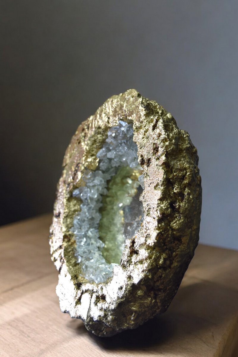 This 25cm high geode mirror is not only a functional object, but a true work of art made entirely by hand. Each piece is unique, the result of my artisanal know-how and my passion. The glass eglomized mirror with 18-carat gold offers a precious and refined reflection, while the geode in composite materials evokes the hidden treasures of nature.