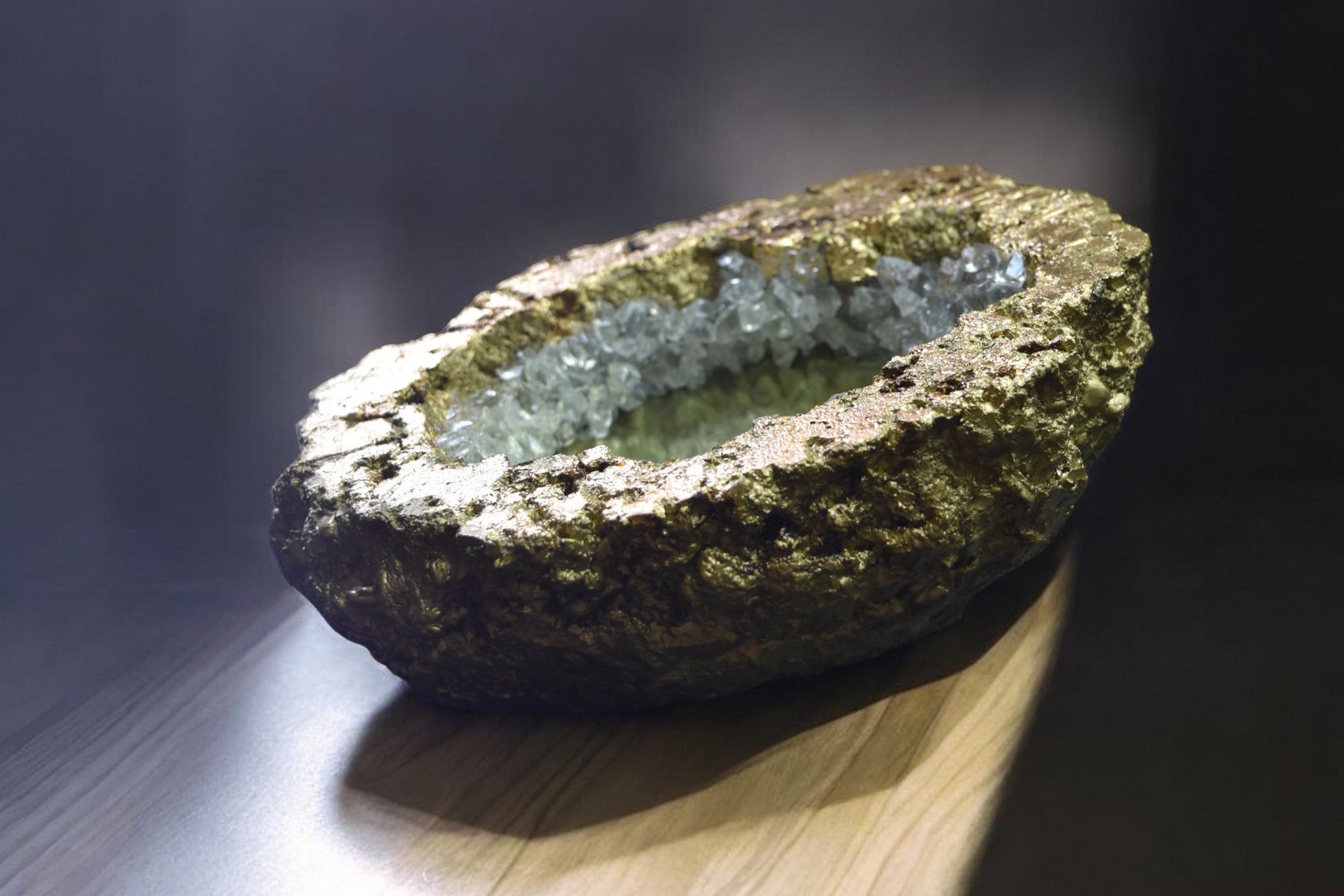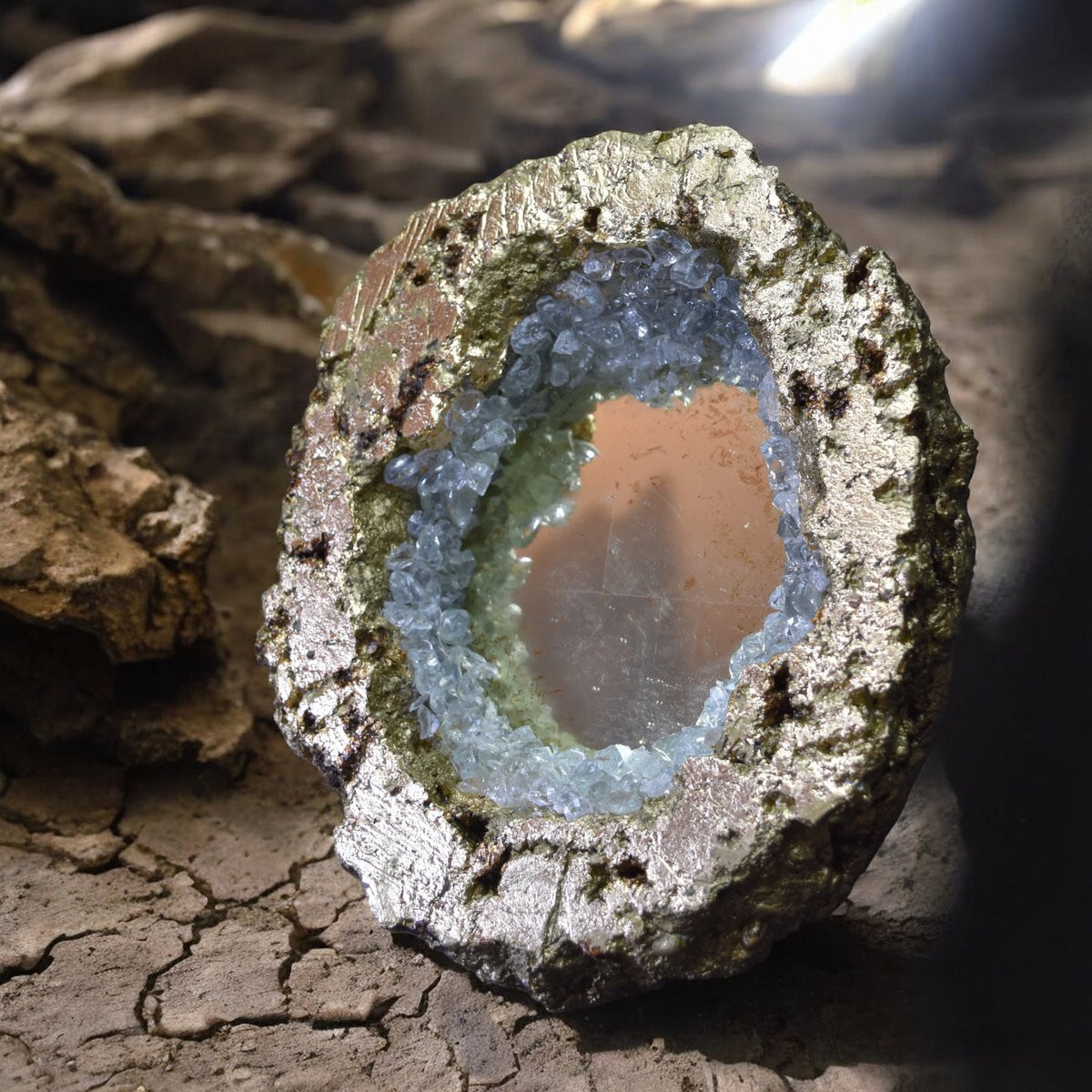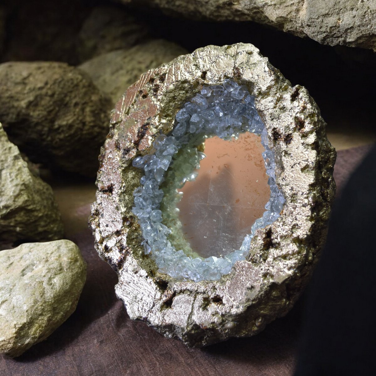 Far from being a simple decorative element, the crystalline geode has a strong symbolism. It represents interiority, transformation and hidden potential. Its shape evokes a rich and complex inner world, like the human psyche. This geode mirror invites introspection and self-discovery.