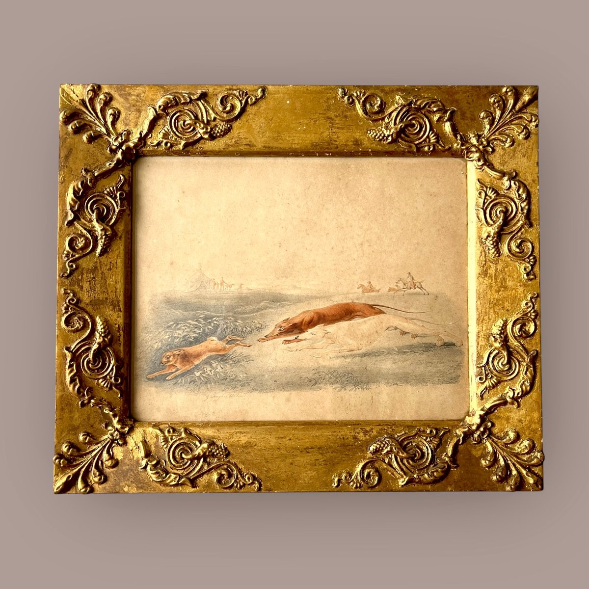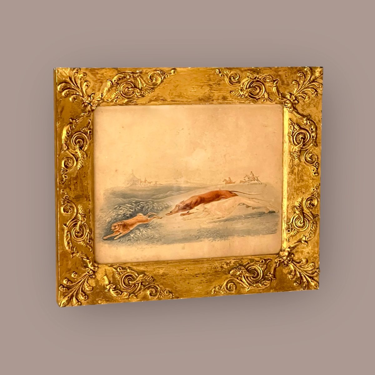 Coursing war im 19. Jahrhundert ein sehr beliebter Sport auf dem Lande, und dieses Kunstwerk spiegelt die Energie und Tradition dieser Zeit wider. Das Werk wird in einem antiken Rahmen aus Vergoldung und Gesso präsentiert, der durch Glas geschützt ist.