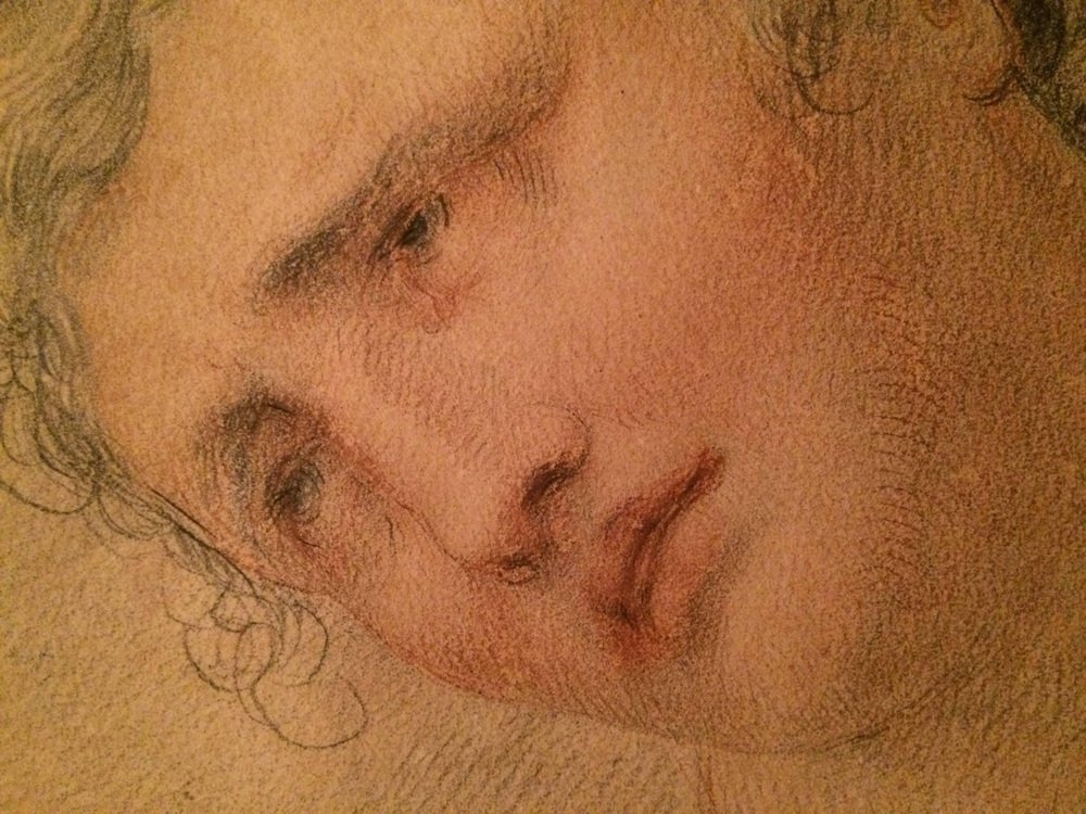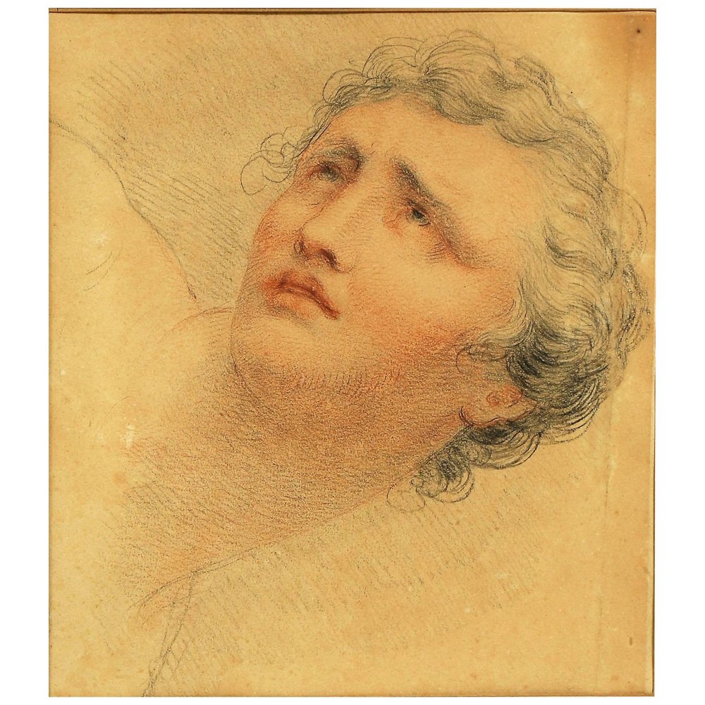 Schöne Zeichnung in Bleistift und Rötel, die das Gesicht eines melancholischen jungen Mannes darstellt