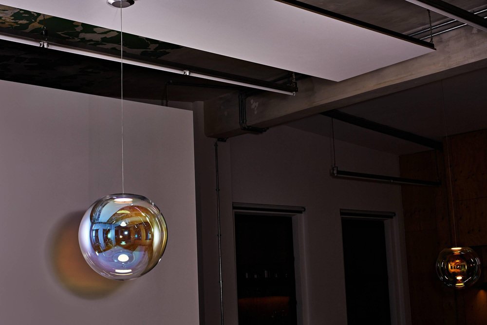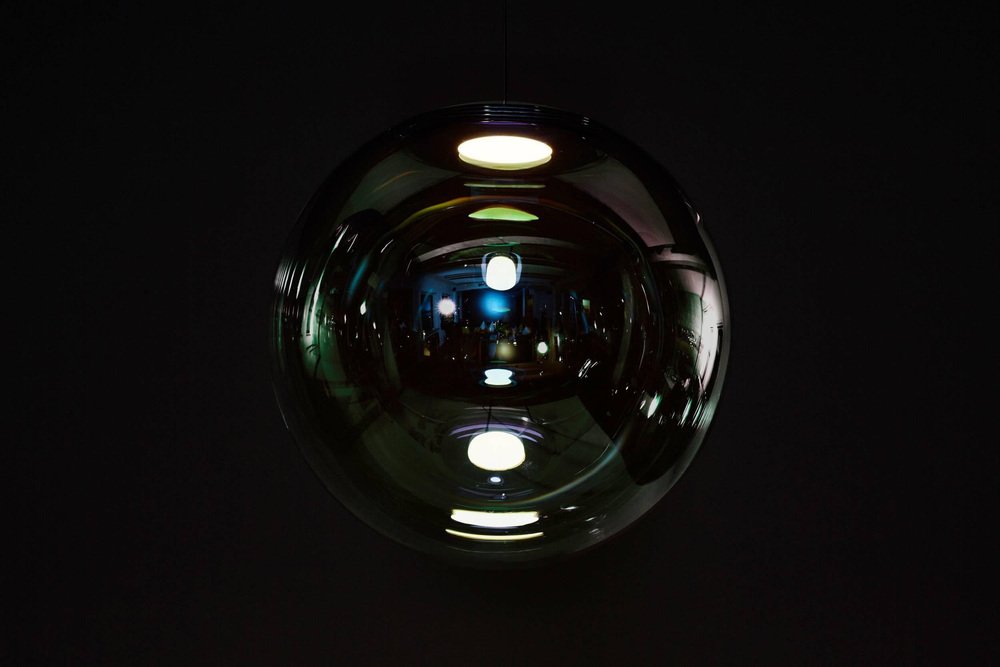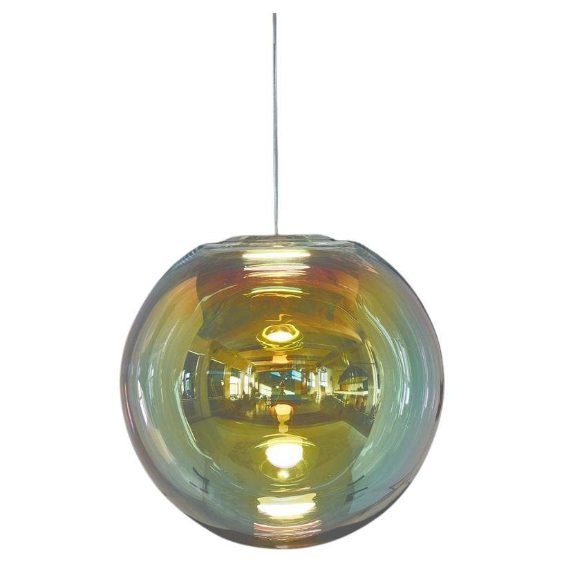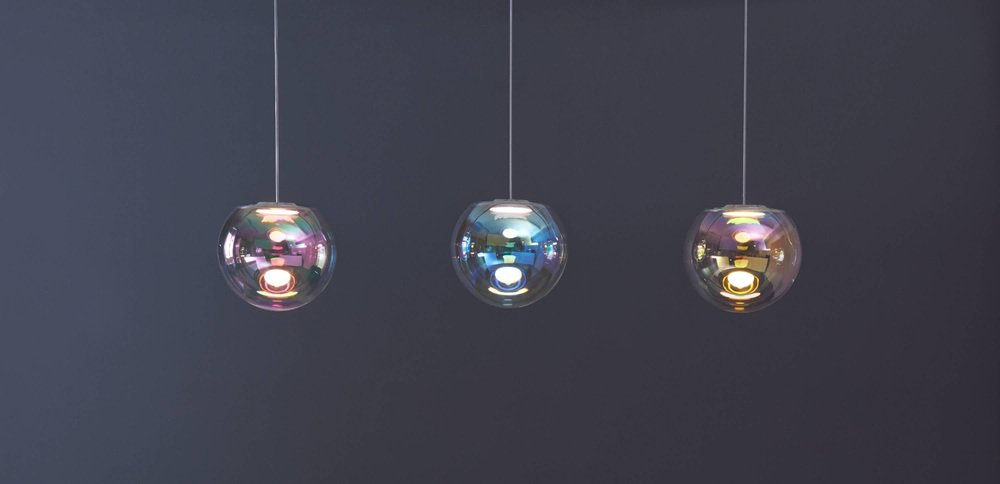 Gold-Indigo iris globe "50" by Sebastian Scherer Handmade Design: Sebastian Scherer Dimensions: Ø 50 cm. Material: Dichroic-coated mouth-blown glass, polished aluminium May be available separately in brass Colour: Gold-indigo May be available separately in blue-orange, pink-green, cyan-magenta, silver-grey Traditional glass production in the oldest glassworks of Germany The result of ambitious craftsmanship and technological innovation, the Iris pendant light mimics a permanent iridescent soap bubble. An OLED module provides both the light source and mount. A dichroic coating, applied using a process developed specifically for Iris, creates the impression of movement and ever-changing colours. Awards: Grand Price Lexus Design Award 2014 Winner Interior Innovation Award 2015 Winner German Design Award 2016.