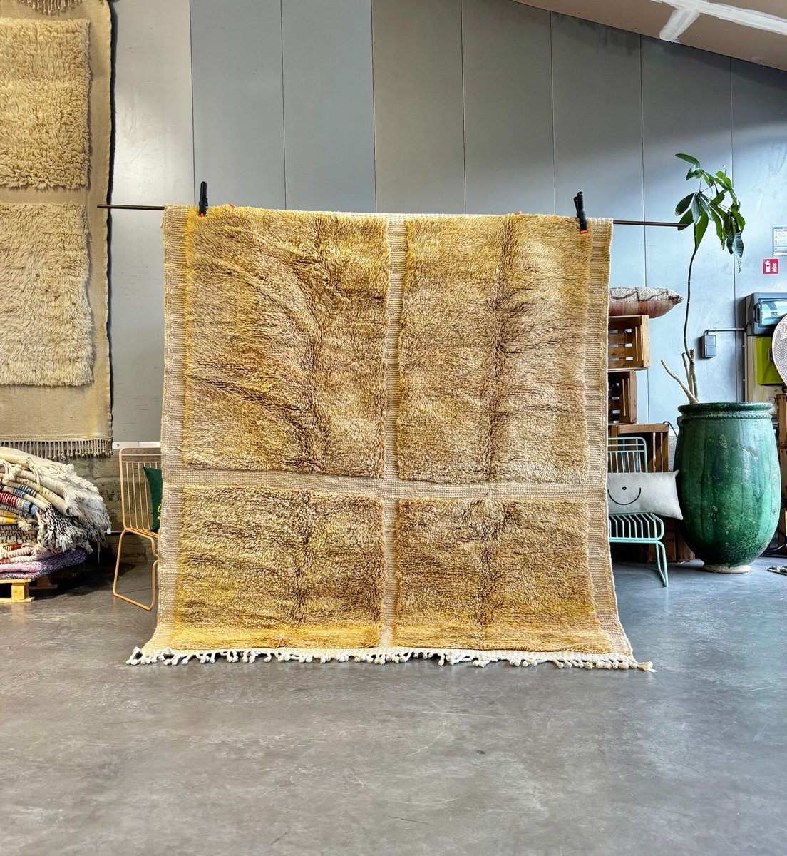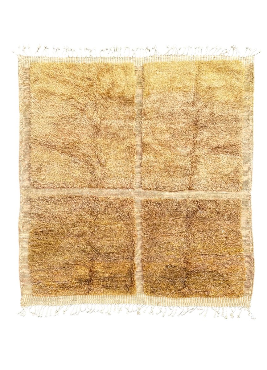 Handwoven by Berber artisans in the Middle Atlas Mountains, it features a subtle geometric pattern and a radiant golden hue that reflects natural light with warmth and sophistication.