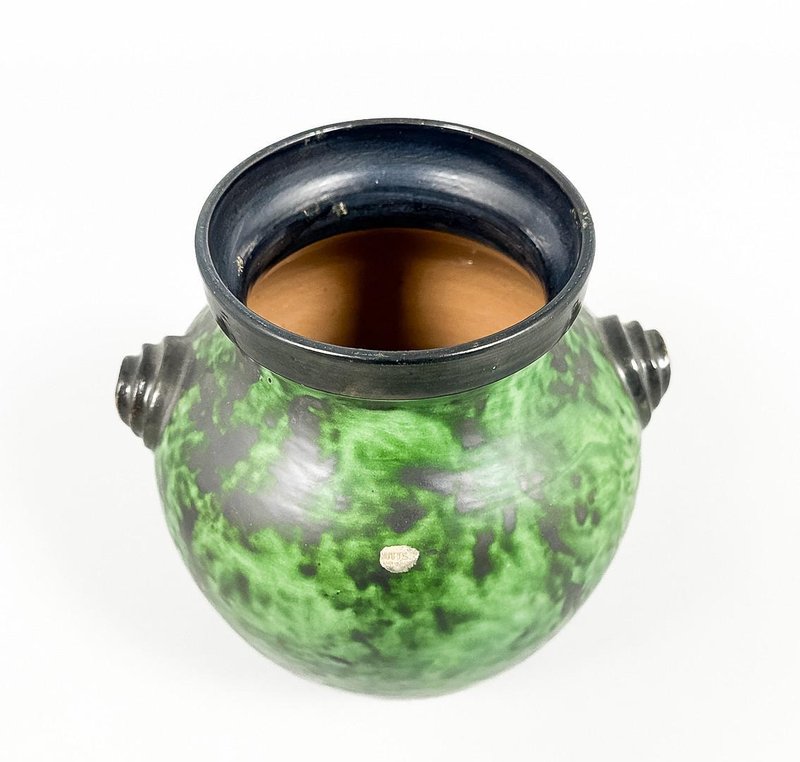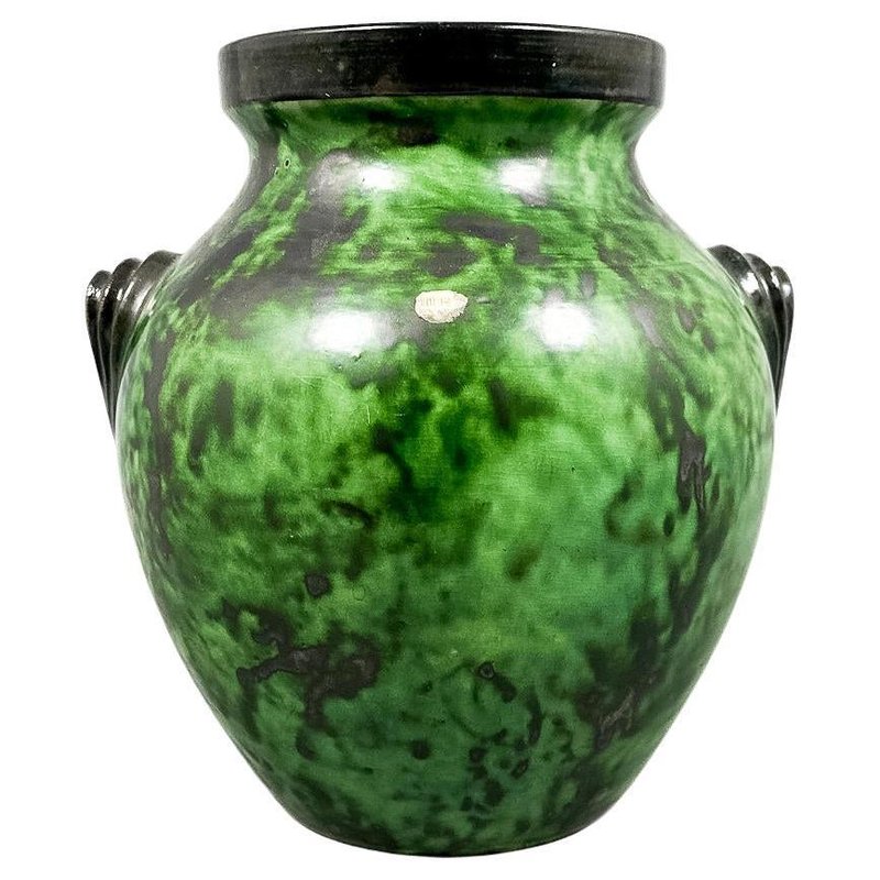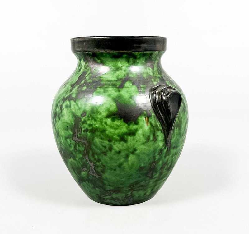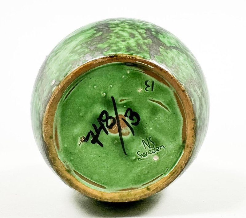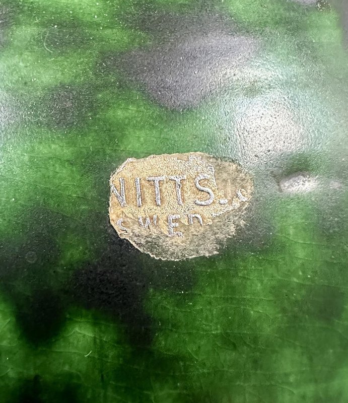 An elegant Swedish Art Deco stoneware vase designed by Erik Mornils for Nittsjö Keramik, circa 1930s. The vase features a rounded baluster form with subtly modeled side handles and a wide, slightly flared rim. It is finished in a richly variegated green glaze with darker mottled accents, characteristic of Nittsjö production from the interwar period. The glaze displays depth and movement, shifting from deep emerald to softer mossy tones, beautifully emphasizing the sculptural form. The base is signed and marked “N.S. Sweden,” confirming its origin and attribution. A fine example of Scandinavian Art Deco ceramics, combining refined craftsmanship with a bold yet organic decorative expression. Condition: Very good vintage condition with minor surface wear consistent with age and use. Origin: Sweden