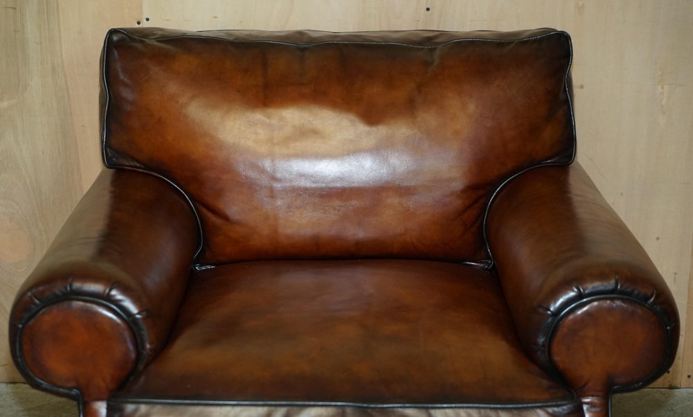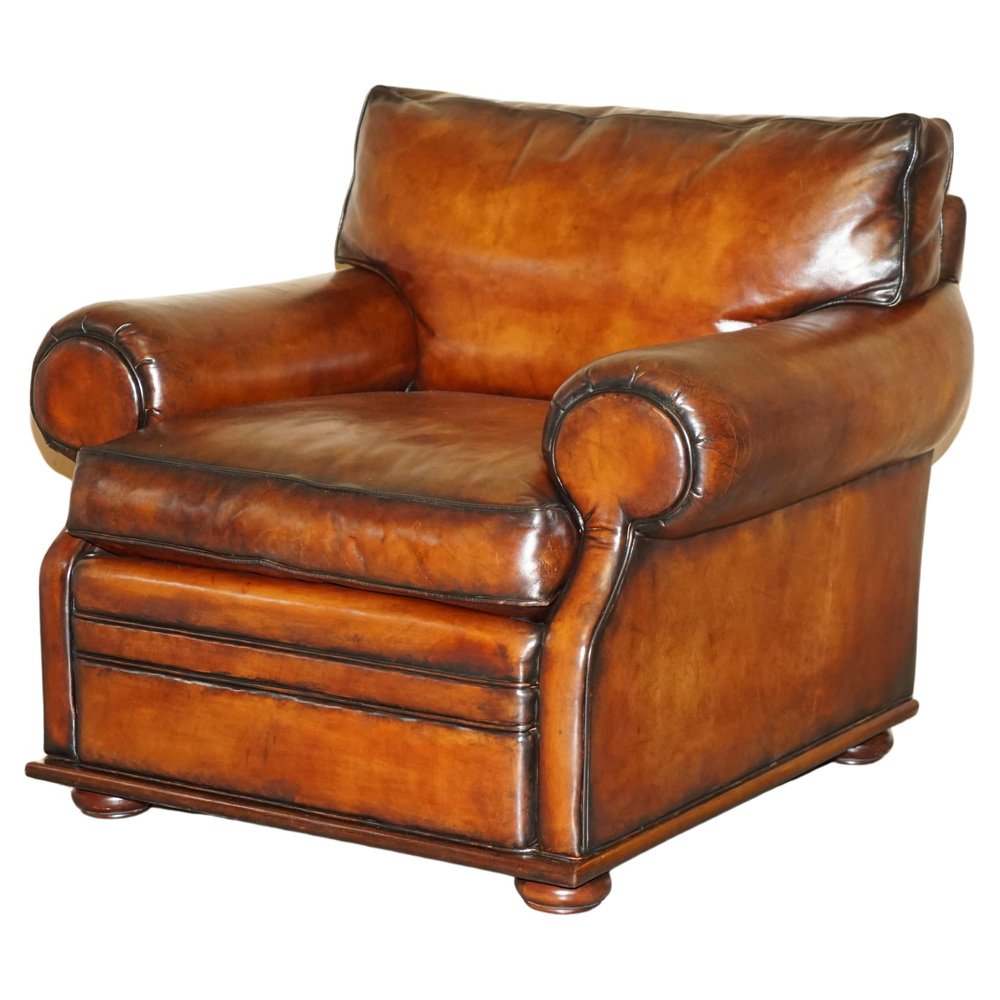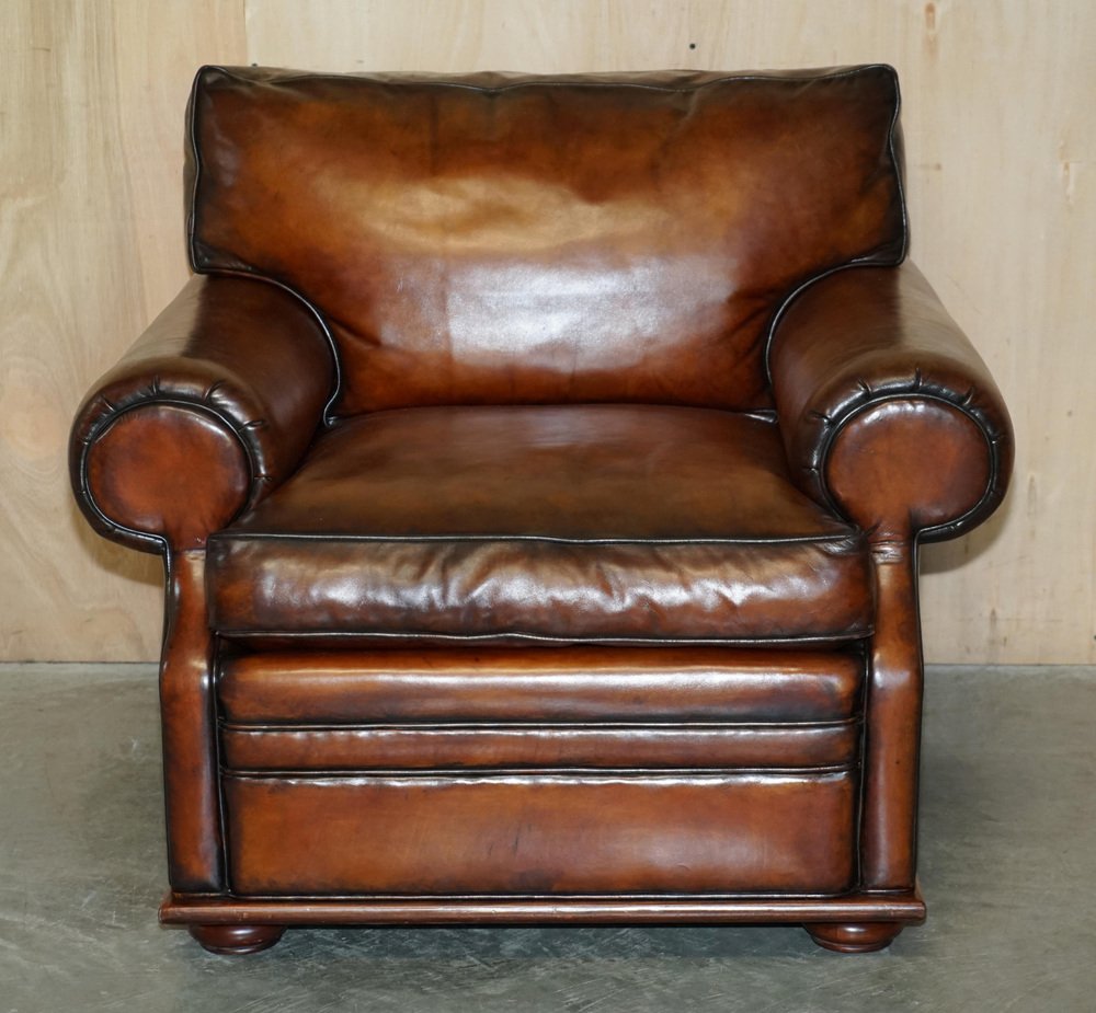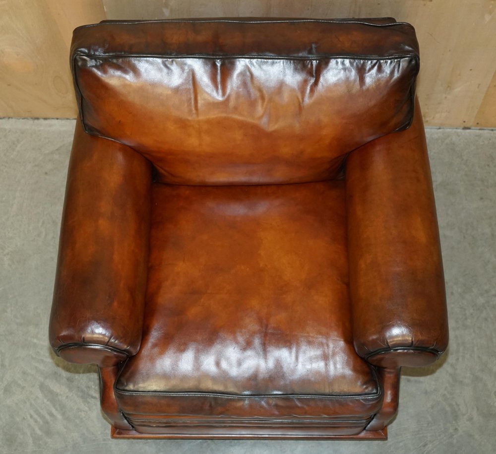 We are delighted to offer for sale this stunning original fully restored hand dyed Cigar Brown leather Ralph Lauren Art Deco club armchair with feather filled cushions A fantastic iconic armchair, it has now been discontinued but was exceptionally popular in its time. These were supplied in plain tan leather, this is the only one in this colour in the entire world, it is very unique and way better than the original The chair has been restored to include having the old colour washed out, the leather has then been hand dyed six times, antiqued, sealed, waxed down and polished, it is super unique and looks expensive and important in any setting Armchair dimensions: Height 90cm Width 103cm Depth 105cm Seat height 52cm