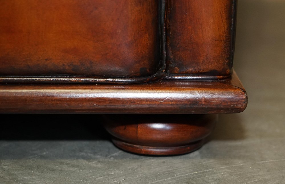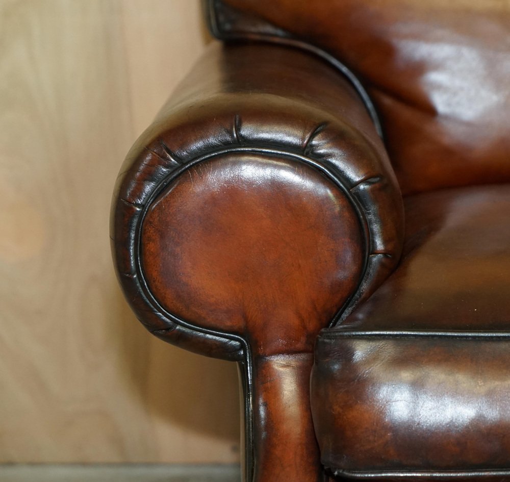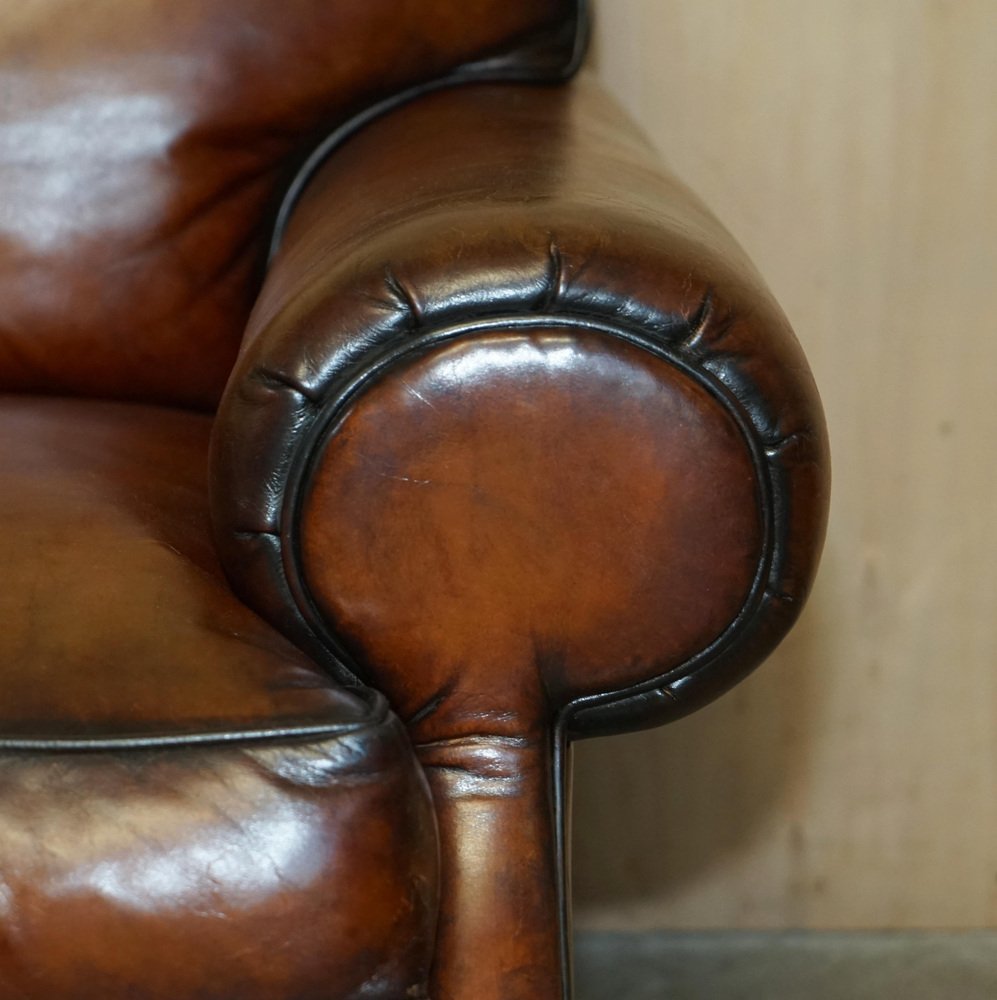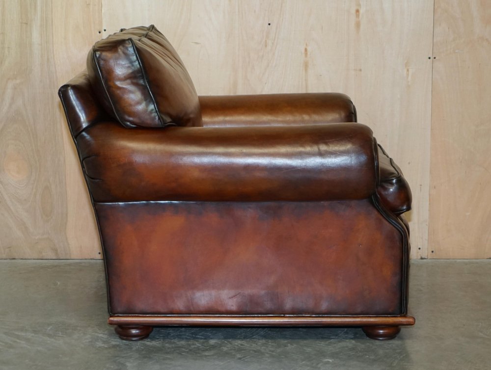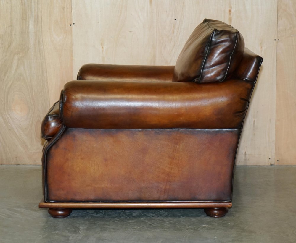 We are delighted to offer for sale this stunning original fully restored hand dyed Cigar Brown leather Ralph Lauren Art Deco club armchair with feather filled cushions A fantastic iconic armchair, it has now been discontinued but was exceptionally popular in its time. These were supplied in plain tan leather, this is the only one in this colour in the entire world, it is very unique and way better than the original The chair has been restored to include having the old colour washed out, the leather has then been hand dyed six times, antiqued, sealed, waxed down and polished, it is super unique and looks expensive and important in any setting Armchair dimensions: Height 90cm Width 103cm Depth 105cm Seat height 52cm