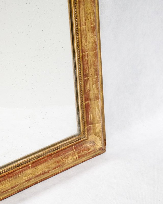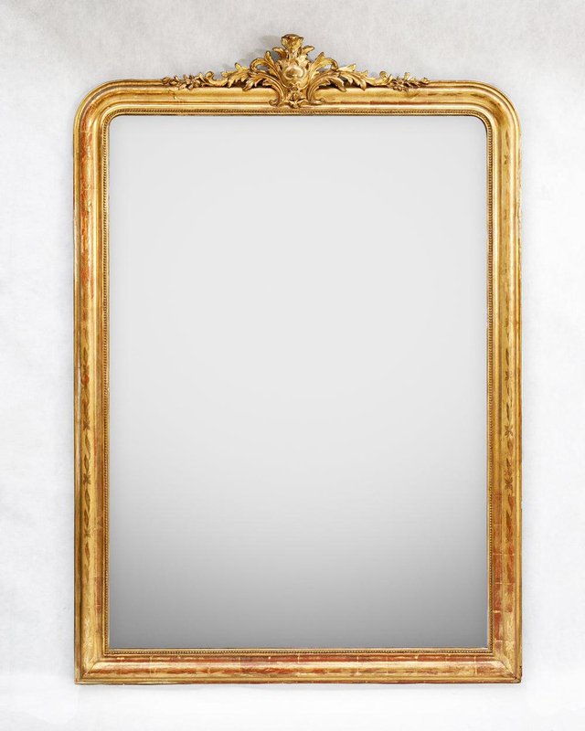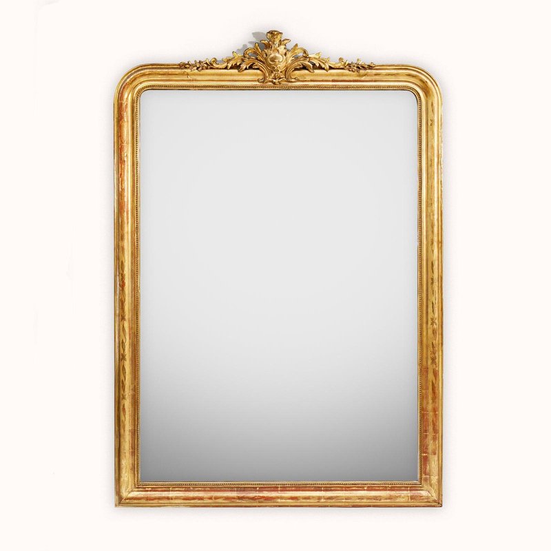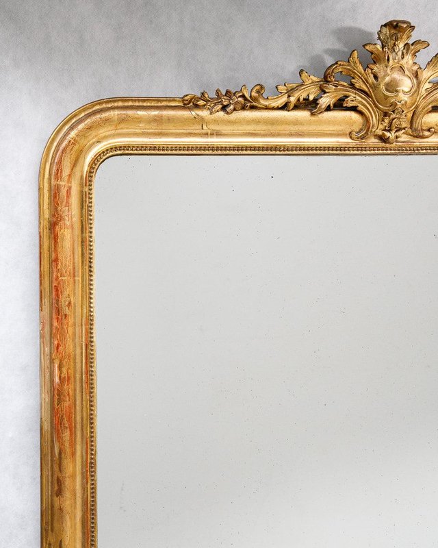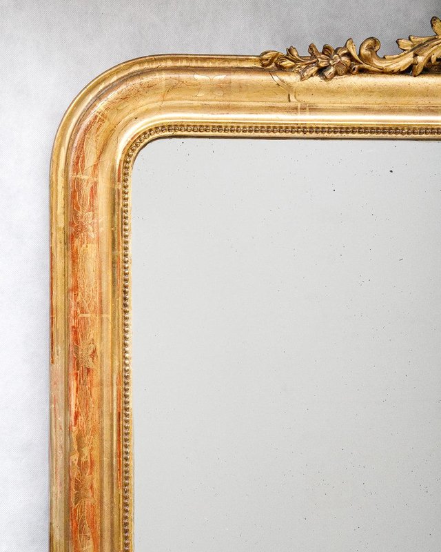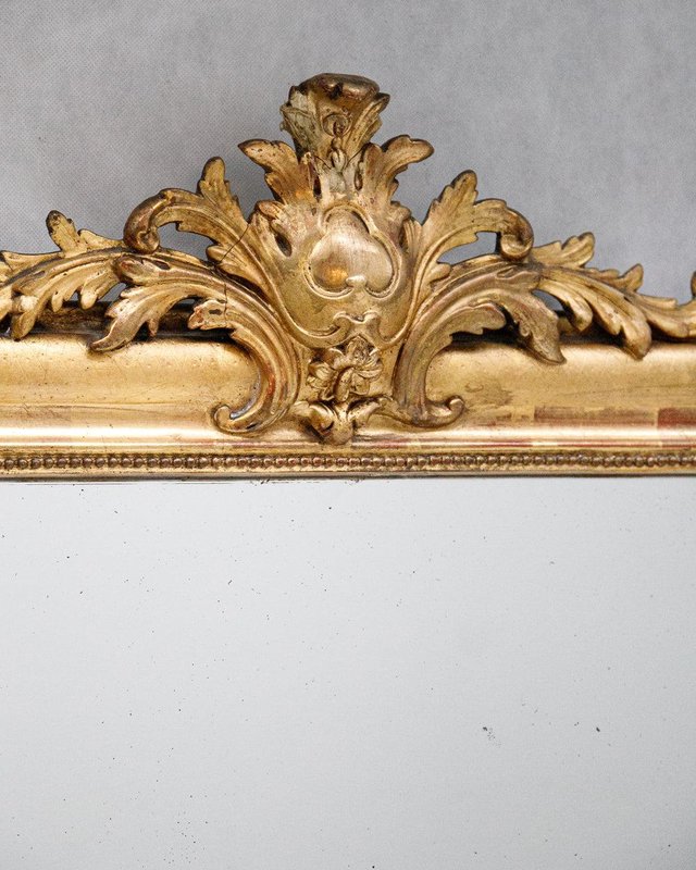 This stunning large antique mirror dates back to France, circa 1880, and is crowned with a beautifully ornate crest adorned with delicate foliage. The gold gilt frame is structurally sound, with a classic "string of pearls" motif accentuating the inner rim for an elegant touch. Subtle hints of red bole peek through the gold leaf gilding, lending a warm depth to its rich golden hue and flower and leaf etchings. Retaining its original mirror plate and wooden back cladding, the glass remains in excellent, clear condition, showing only some tiny weathered spots that add to its charm. Generously sized, this mirror can stand on the ground, offering a full-length reflection.