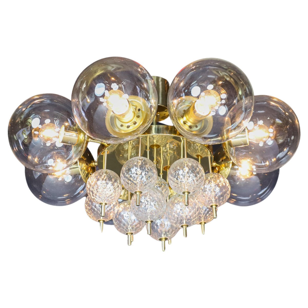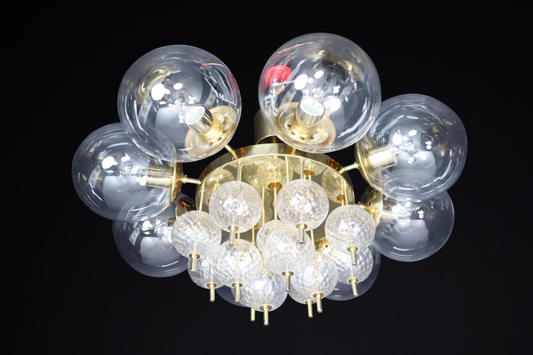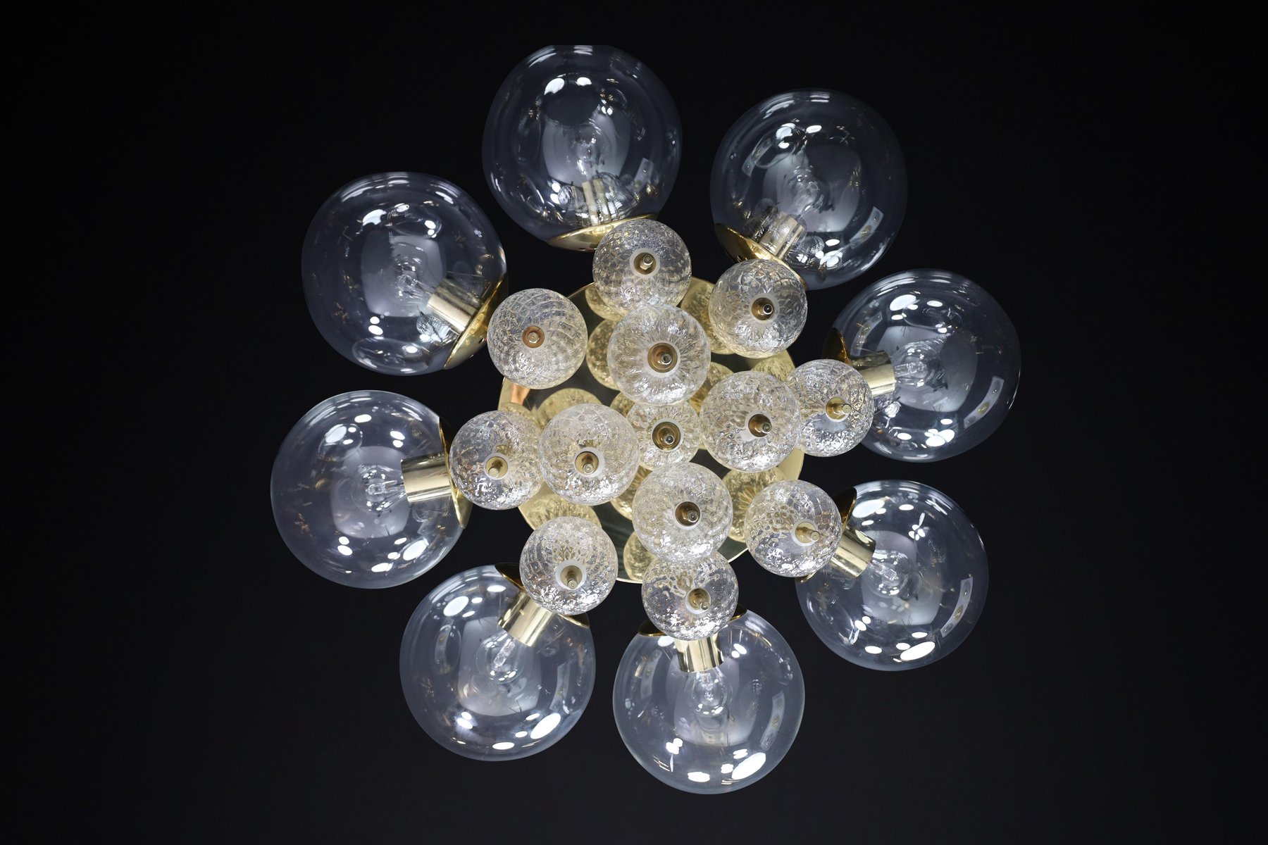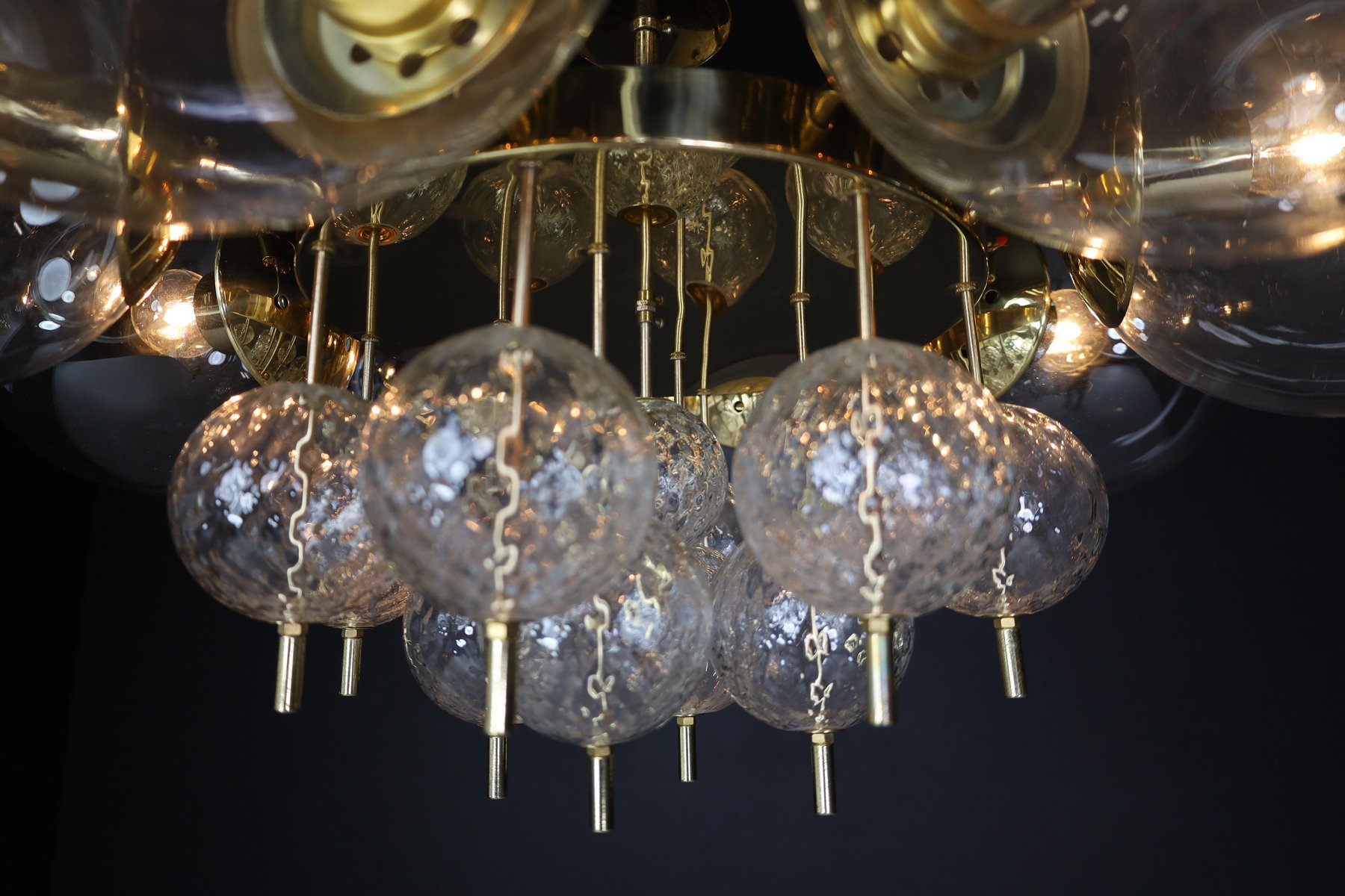 Mid-Century Brass chandelier by Preciosa in Czechia 1960s. This Mid-Century chandelier, crafted in the 1960s, boasts a brass fixture and hand-blown glass globes from the renowned Preciosa Factory in Czechia. It features eight large clear glass globes and multiple smaller structured glass globes that create a pleasant and atmospheric light. The chandelier's structured glass and brass details enhance its luxurious character, making it a perfect addition to any villa, hotel lobby, or bar. The chandelier comes equipped with porcelain E27 sockets that are compatible with US/UK/ASIA standards and are also LED compatible. It has been thoroughly cleaned, well-wired, and is in complete working order, ready for immediate use. Although the brass parts have a minor patina, the frame is in excellent condition. The chandelier can be disassembled, and all glasses can be individually wrapped. It has a diameter of 85cm and a size of 65 cm with the rod. Size: Diameter 85 cm - Size incl. Rod 60 cm - Fitted with eight E27 sockets suitable for LED. - The lights are compatible with US/UK/ASIA standards. - Cleaned, well-wired, and ready to use.