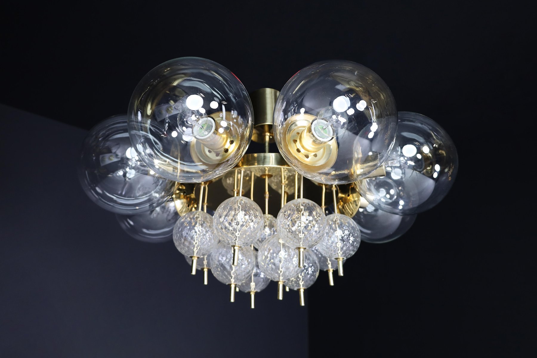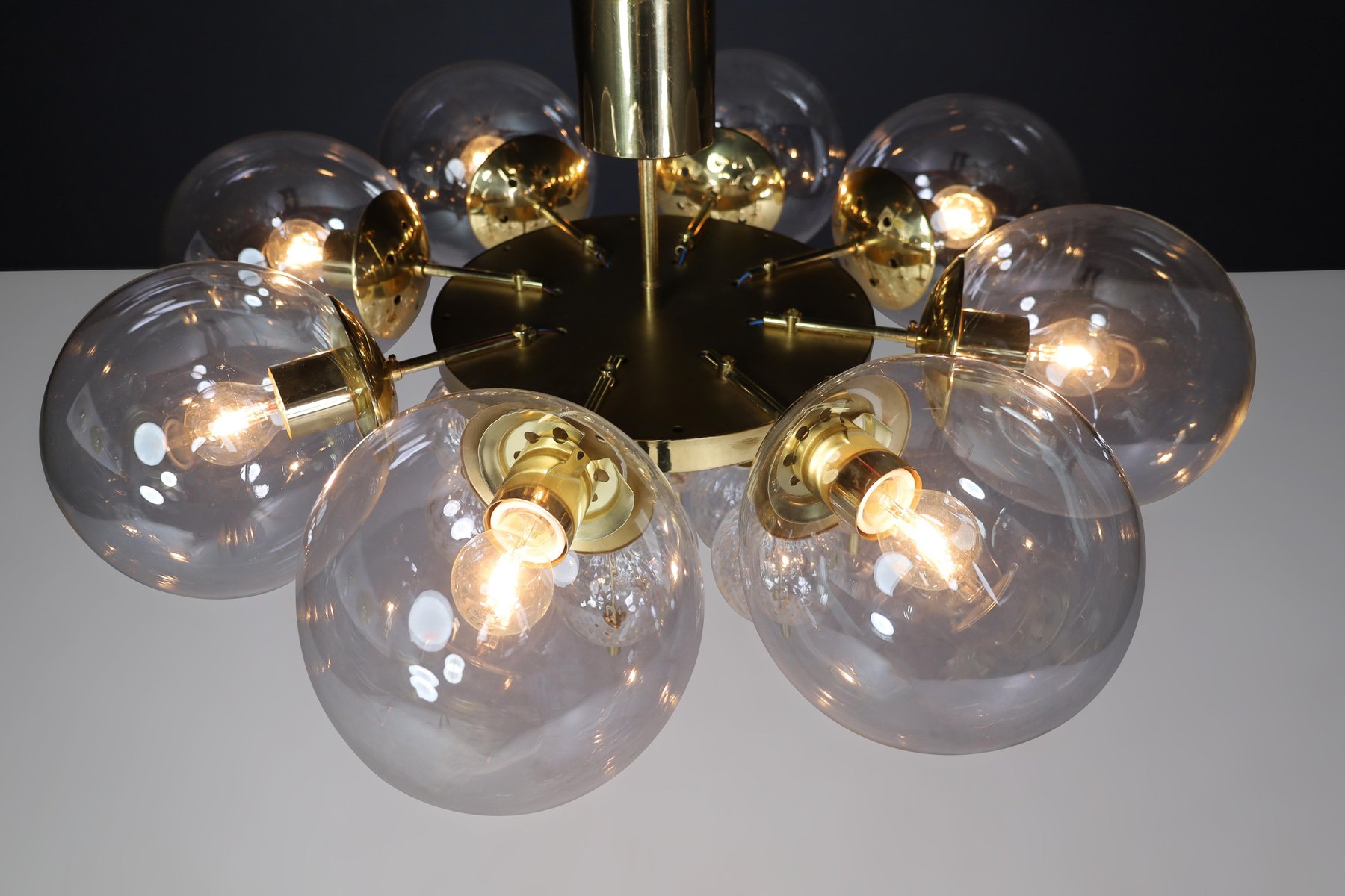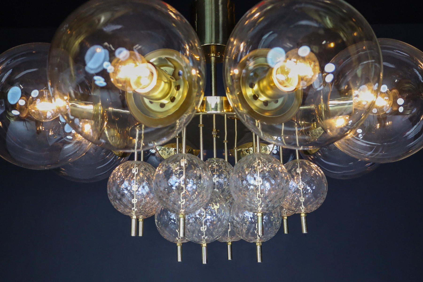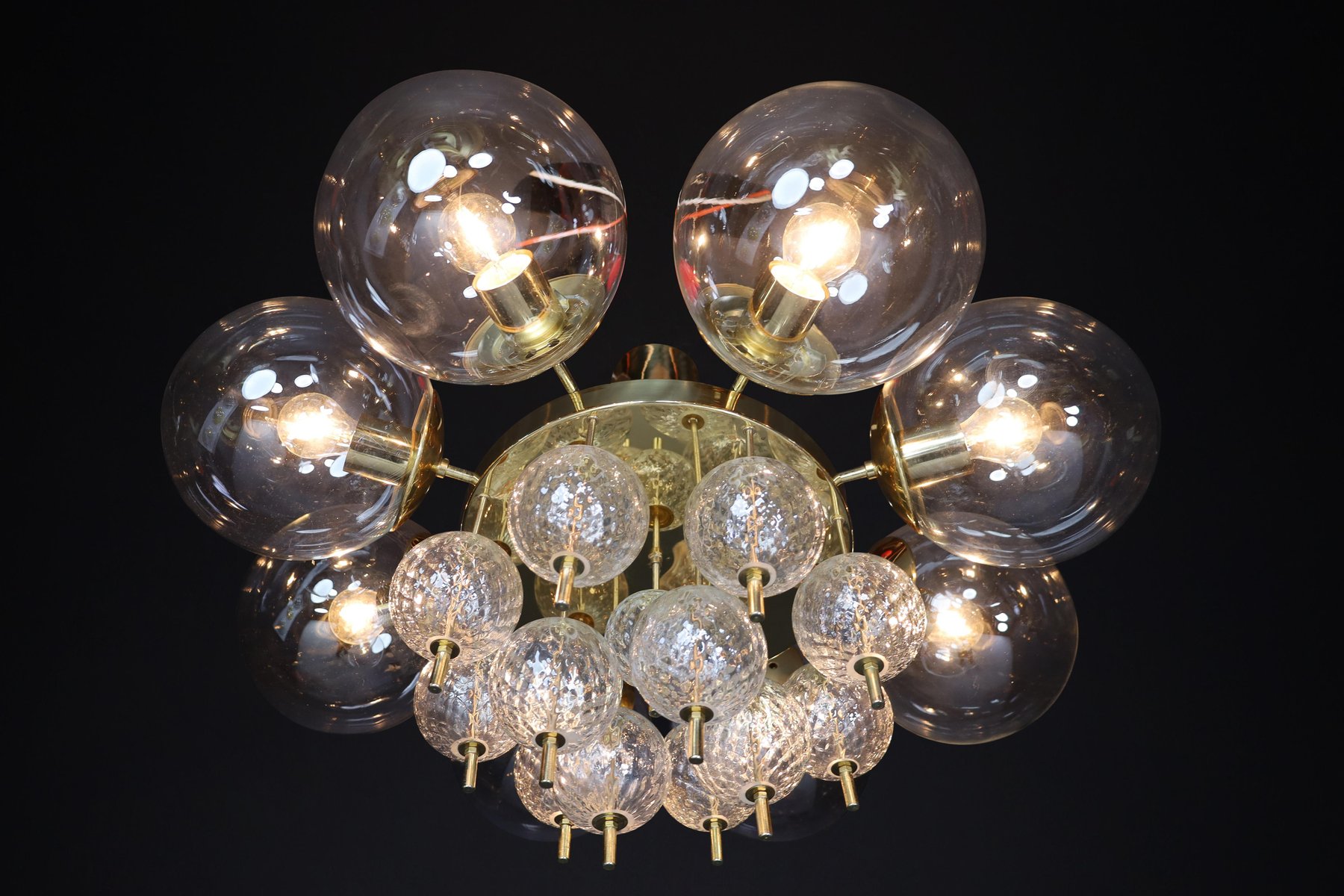 Mid-Century Brass chandelier by Preciosa in Czechia 1960s. This Mid-Century chandelier, crafted in the 1960s, boasts a brass fixture and hand-blown glass globes from the renowned Preciosa Factory in Czechia. It features eight large clear glass globes and multiple smaller structured glass globes that create a pleasant and atmospheric light. The chandelier's structured glass and brass details enhance its luxurious character, making it a perfect addition to any villa, hotel lobby, or bar. The chandelier comes equipped with porcelain E27 sockets that are compatible with US/UK/ASIA standards and are also LED compatible. It has been thoroughly cleaned, well-wired, and is in complete working order, ready for immediate use. Although the brass parts have a minor patina, the frame is in excellent condition. The chandelier can be disassembled, and all glasses can be individually wrapped. It has a diameter of 85cm and a size of 65 cm with the rod. Size: Diameter 85 cm - Size incl. Rod 60 cm - Fitted with eight E27 sockets suitable for LED. - The lights are compatible with US/UK/ASIA standards. - Cleaned, well-wired, and ready to use.