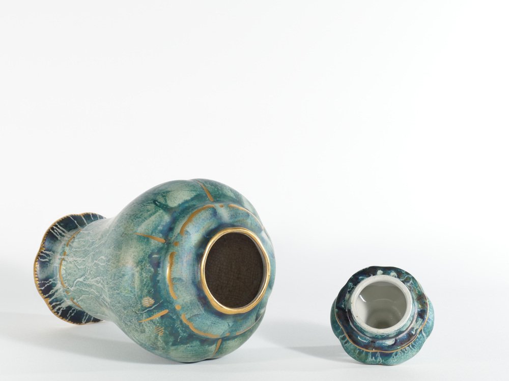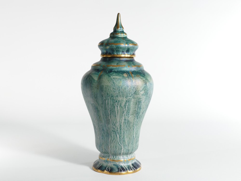 This large and exquisite handmade lidded vase, is skillfully crafted by the renowned Swedish ceramic artist Josef Ekberg. He is recognized as one of Sweden's foremost ceramic artists during his era. This particular piece is a splendid representation of Ekberg's artistic prowess, showcasing the distinctive qualities of swedish art deco. It is a meticulously hand-decorated ceramic vase, complete with an elegantly designed lid- The vase bears the signature of Josef Ekberg in the form of his monogram, along with the Gustavsbergs company mark. Adorned in a captivating hand-painted turquoise green hue, enhanced by a lustrous glaze and opulent gold decorations, it is a testament to the craftsmanship and creativity that defined Ekberg's legacy, making it a remarkable collectible for enthusiasts and connoisseurs alike. ABOUT THE DESIGNER Josef Ekberg, born February 18, 1877 in Värmdö, Stockholm, died December 7, 1945 in Gustavsberg, Stockholm, was a Swedish ceramist and designer at the Gustavsberg porcelain factory. He was artistic director at Gustavsberg 1908–1917.
