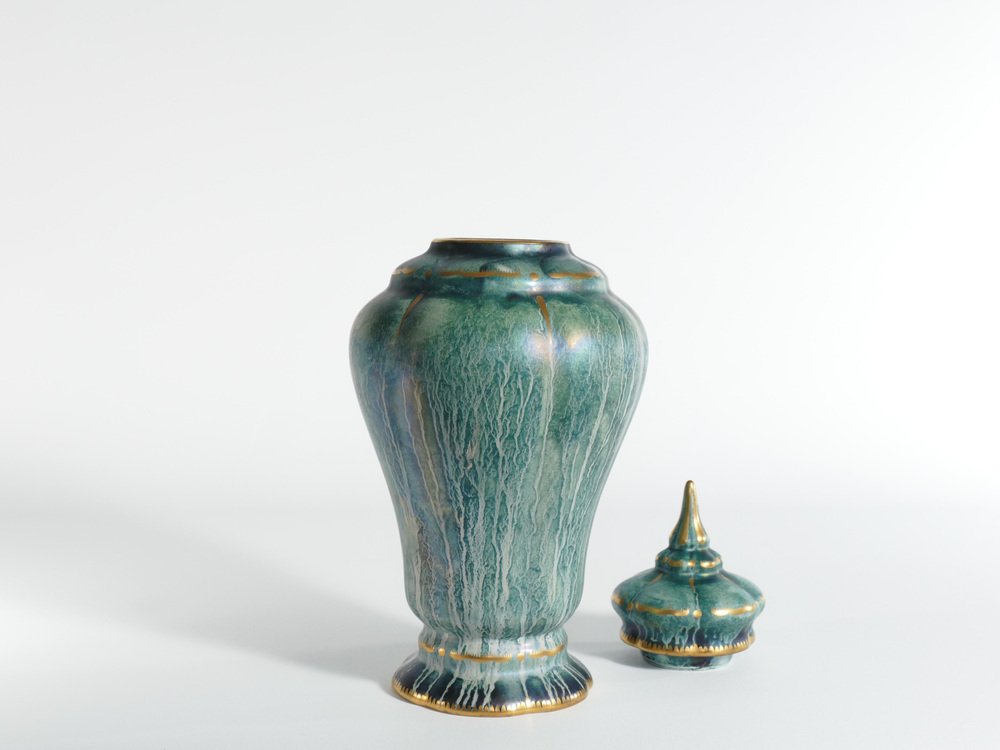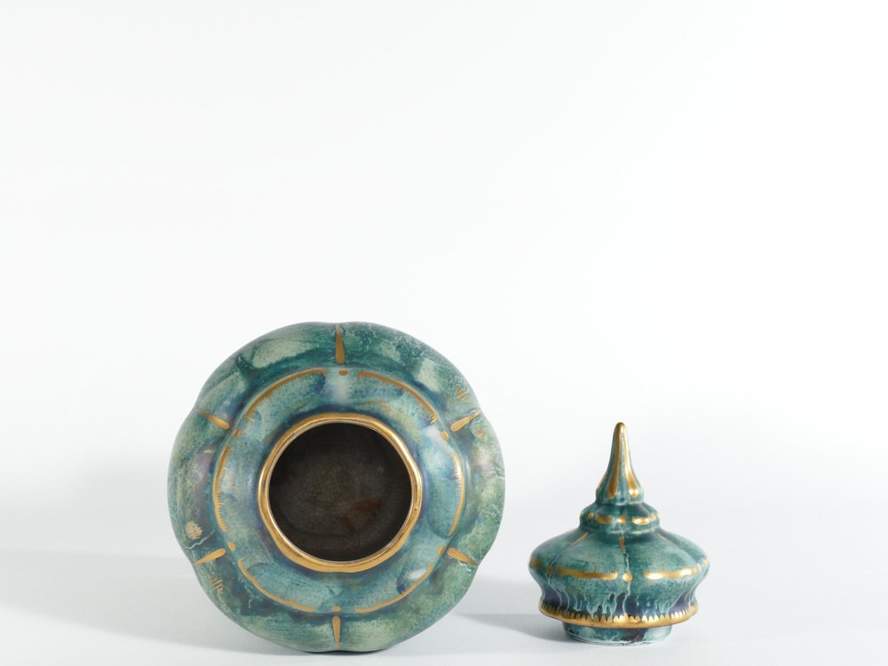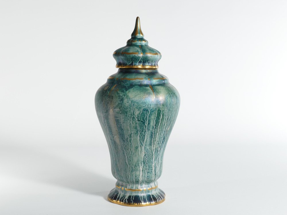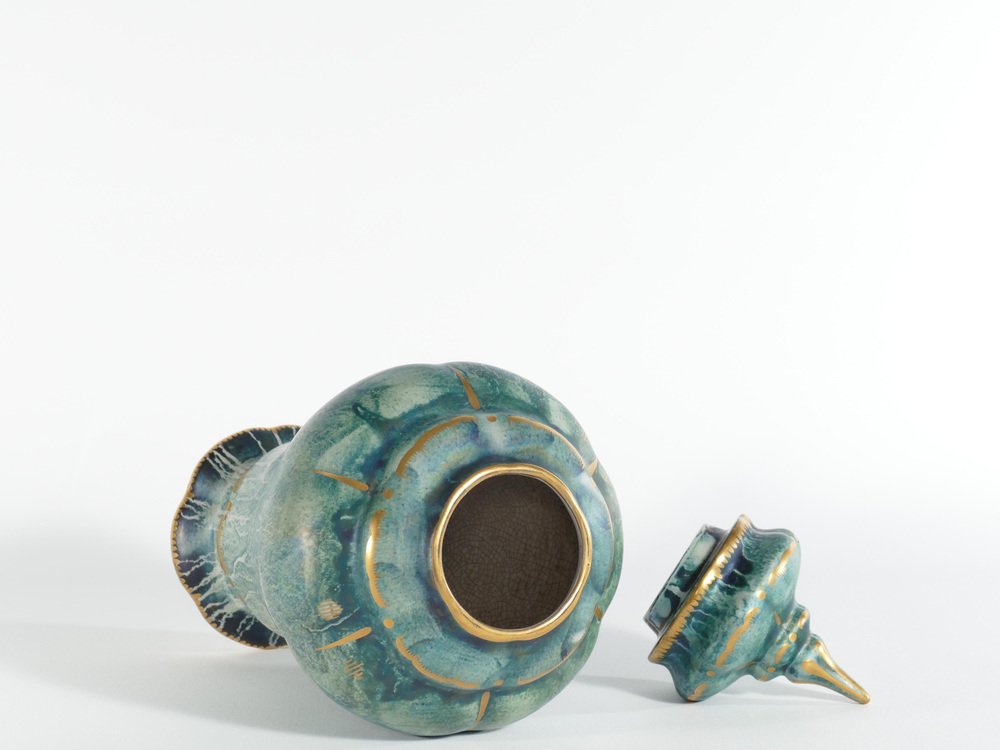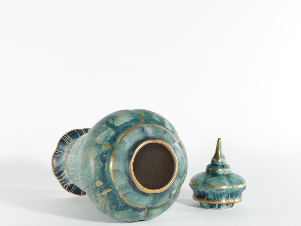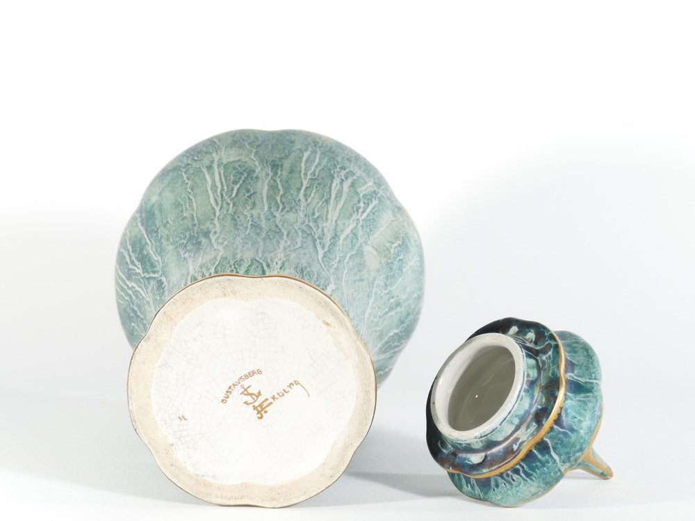 Diese große und exquisite handgefertigte Deckelvase wurde von dem bekannten schwedischen Keramikkünstler Josef Ekberg hergestellt. Er ist als einer der führenden schwedischen Keramikkünstler seiner Zeit anerkannt. Dieses besondere Stück ist eine großartige Darstellung von Ekbergs künstlerischem Können und zeigt die charakteristischen Qualitäten des schwedischen Art déco. Es handelt sich um eine sorgfältig von Hand dekorierte Keramikvase mit einem elegant gestalteten Deckel. Die Vase trägt die Signatur von Josef Ekberg in Form seines Monogramms sowie die Firmenmarke von Gustavsbergs. Die Vase ist in einem bezaubernden türkisgrünen Farbton handbemalt, der durch eine schimmernde Glasur und opulente Goldverzierungen veredelt wird. Sie ist ein Zeugnis der Handwerkskunst und der Kreativität, die Ekbergs Vermächtnis ausmachten und macht sie zu einem bemerkenswerten Sammlerstück für Liebhaber und Kenner gleichermaßen. Über den Designer Josef Ekberg, geboren am 18. Februar 1877 in Värmdö, Stockholm, gestorben am 7. Dezember 1945 in Gustavsberg, Stockholm, war ein schwedischer Keramiker und Designer in der Porzellanfabrik Gustavsberg. Er war von 1908 bis 1917 künstlerischer Leiter von Gustavsberg.