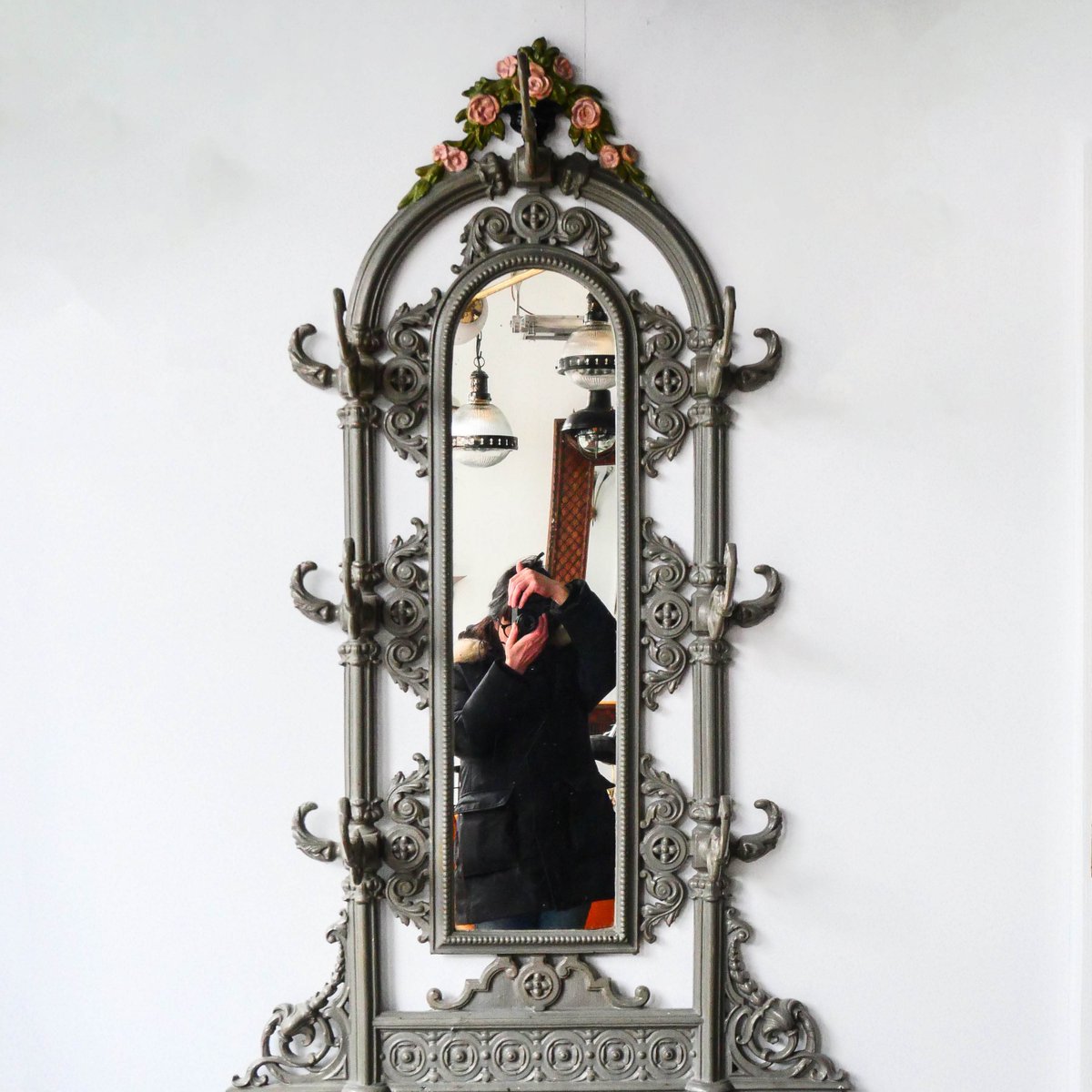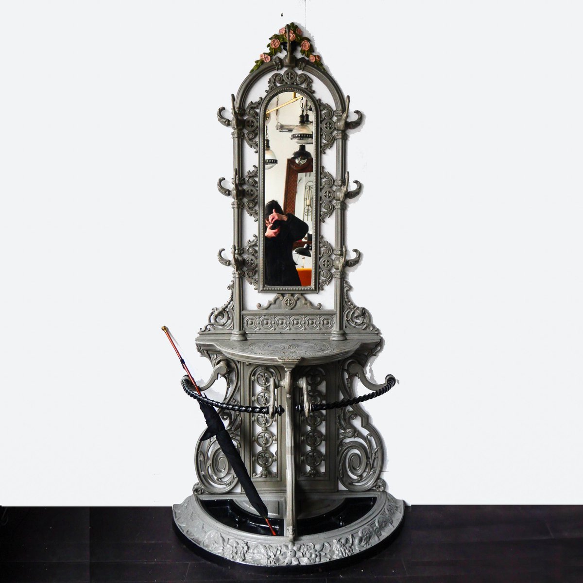 This cast iron hall tree designed by Alfred Corneau embodies the elegance and functionality typical of Art Nouveau. Through its sinuous lines and delicate floral designs, the work reflects the artistic movement that sought to merge beauty with practicality. The integration of the mirror not only adds light to the space, but also highlights the idea of making an object functional while remaining an aesthetic work.