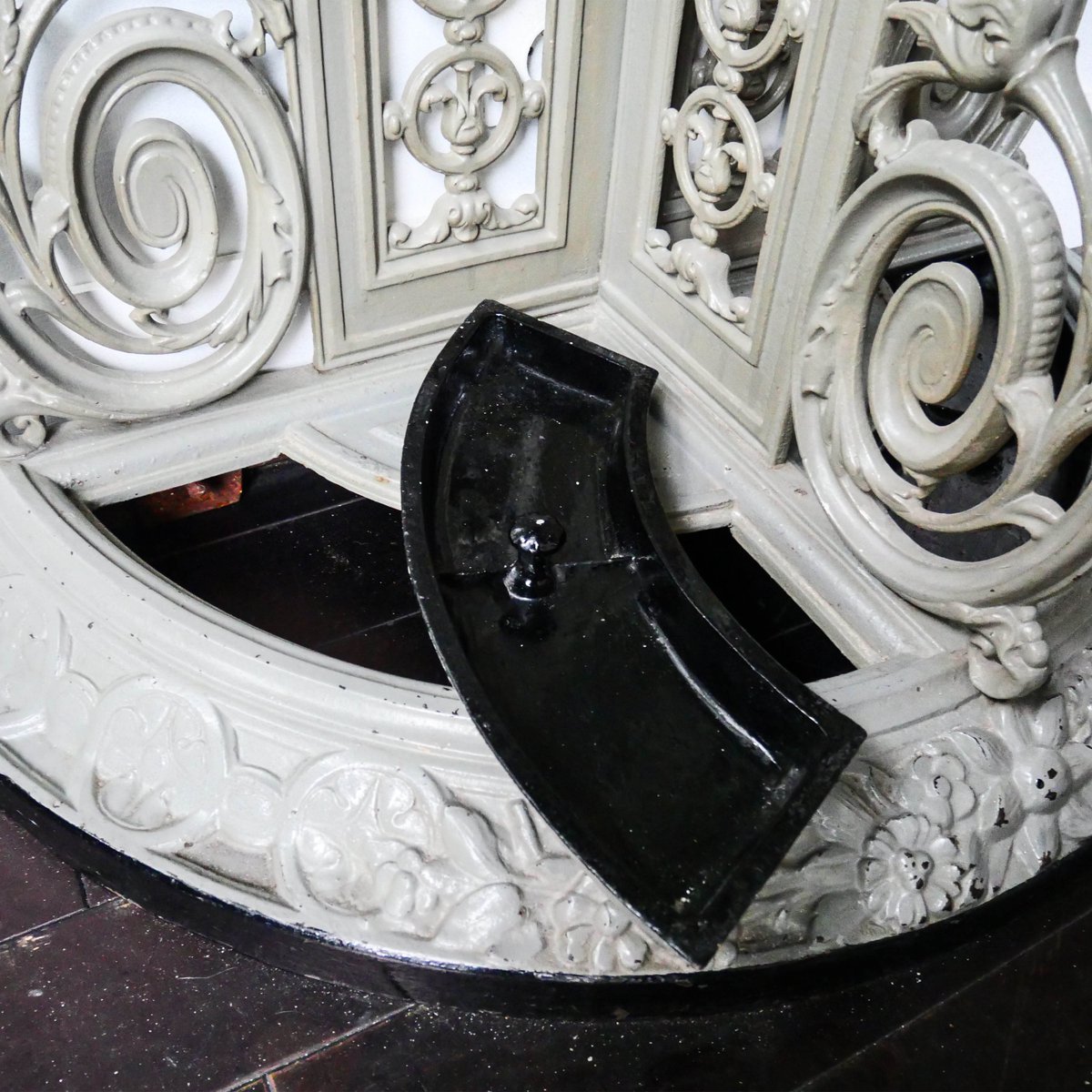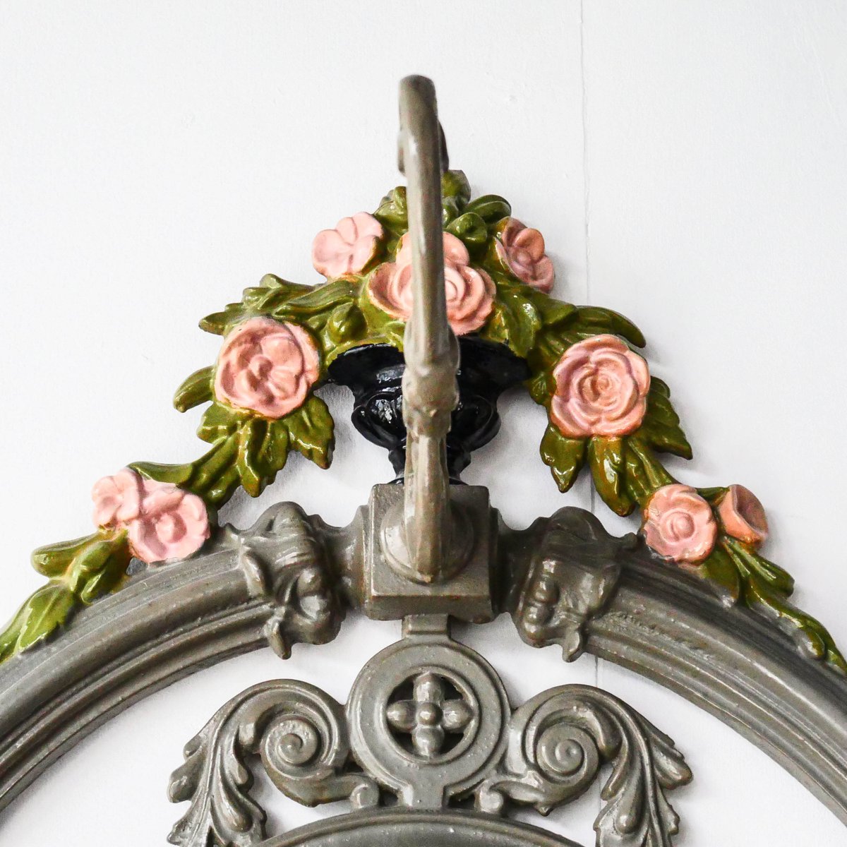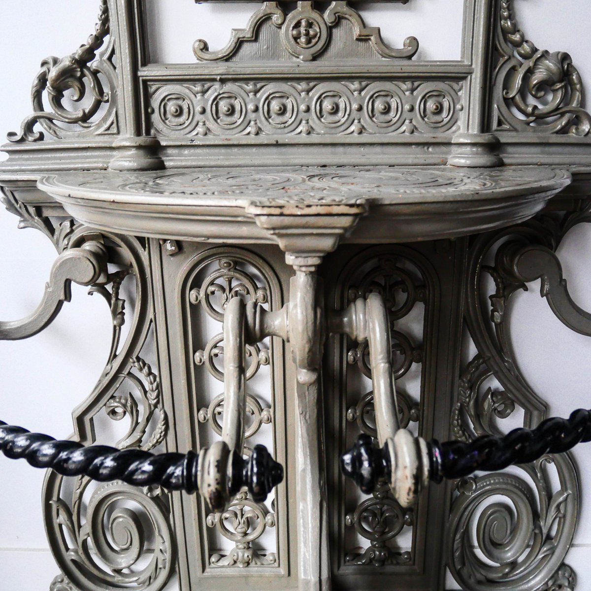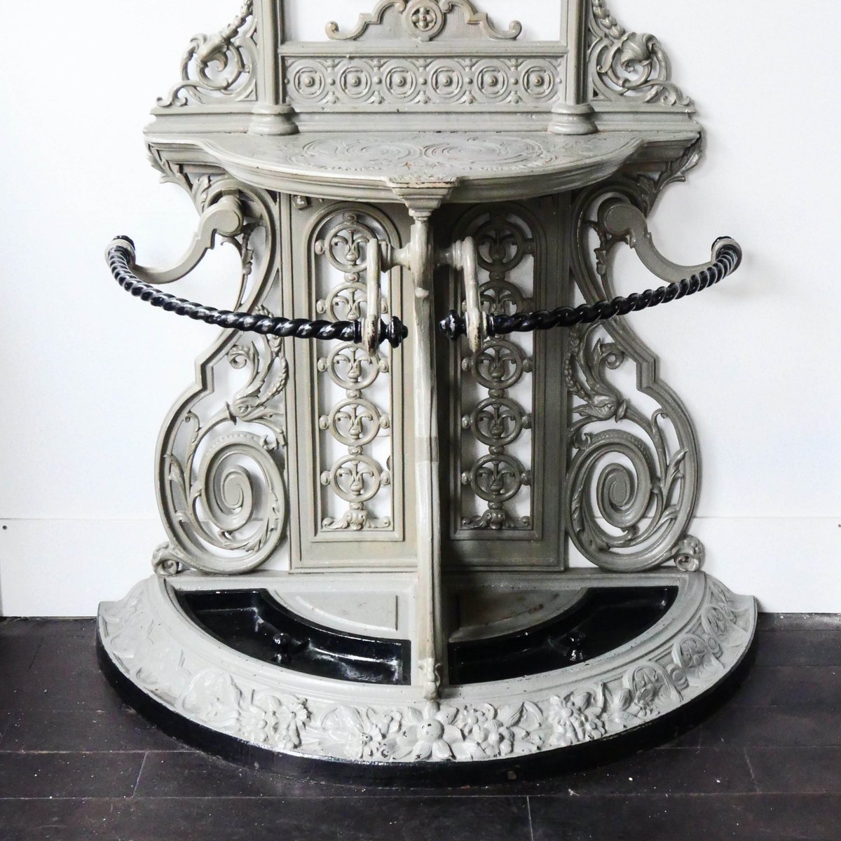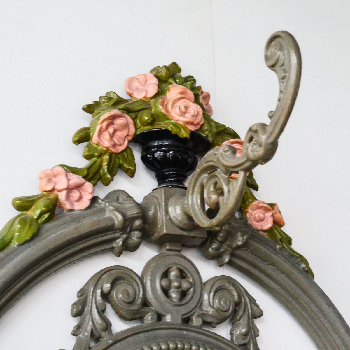 The six hooks, carefully made, allow practical organization while visually enriching the whole. The half-moon shelf and removable receptacles bring an additional dimension to the object, making this entryway tree as useful as it is artistic. Cast iron, a material chosen for its robustness, allows this piece to last over time while remaining visually light, a key characteristic of the Art Nouveau style.