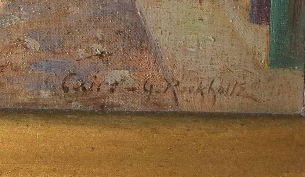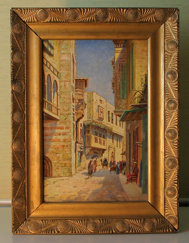 The painting is signed in the lower right corner with "G. Rockholtz, Cairo." Housed in its original, intricately decorated frame, the artwork is in good condition with minor age-related wear.