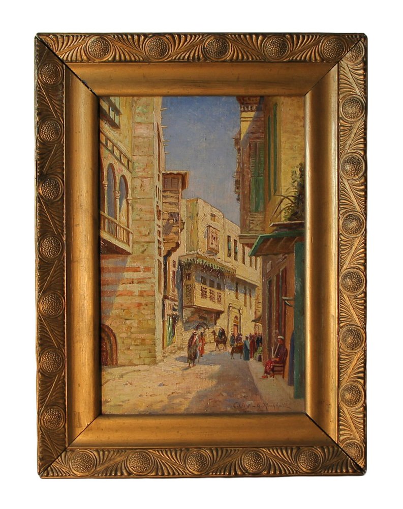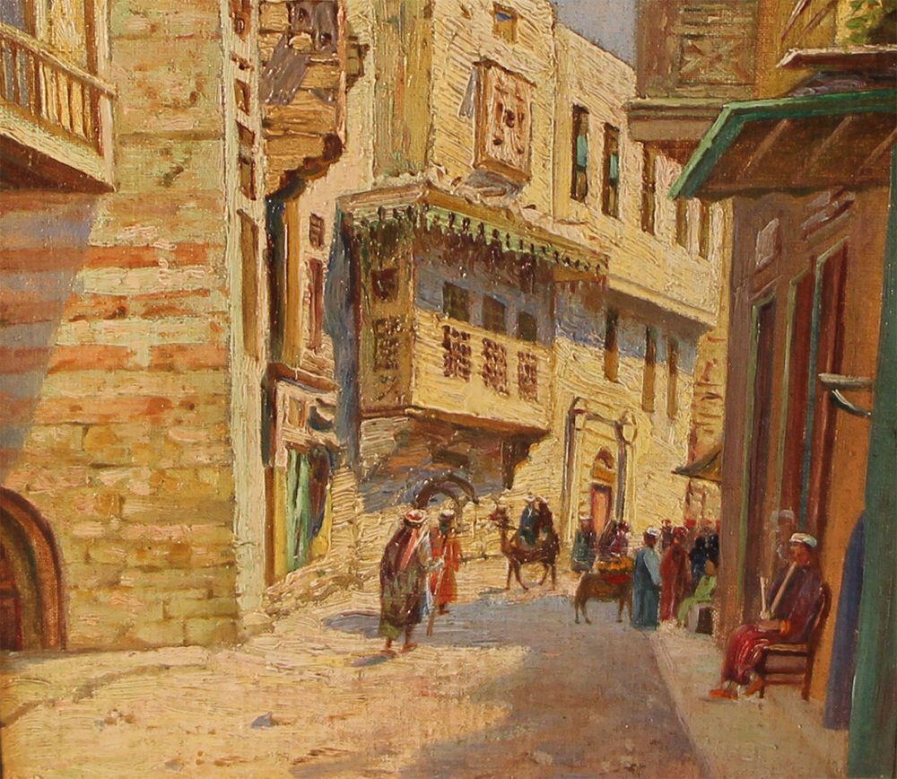 Dieses exquisite Ölgemälde des renommierten deutschen Orientalisten Gustav Rockholtz (1869-1938) zeigt eine lebhafte Straßenszene in Kairo, die reich an architektonischen Details und Alltagsleben ist. Das auf Karton gemalte Kunstwerk zeigt eine lebhafte, sonnenbeschienene Gasse, die von traditionellen orientalischen Gebäuden mit verzierten Fassaden, Balkonen und Bogenfenstern flankiert wird. Die Straße ist von Figuren bevölkert, die verschiedenen Aktivitäten nachgehen, was der Komposition eine dynamische und authentische Note verleiht.