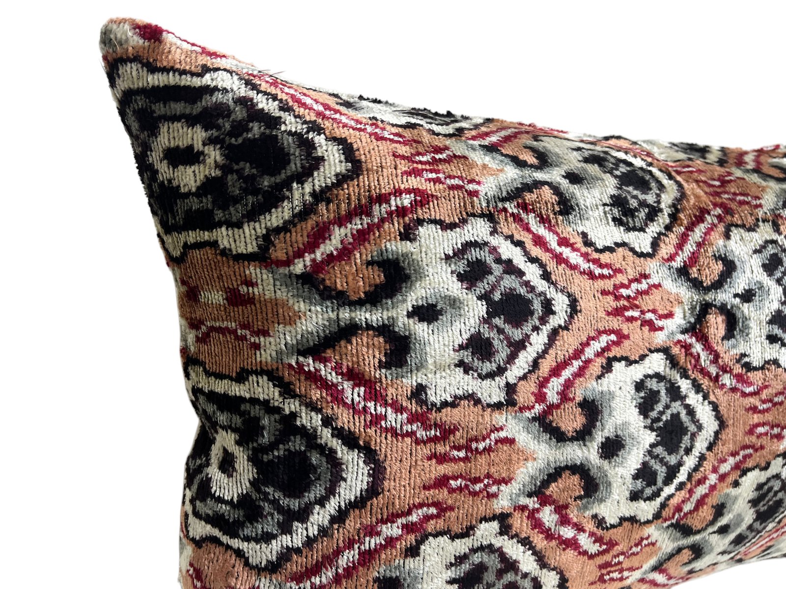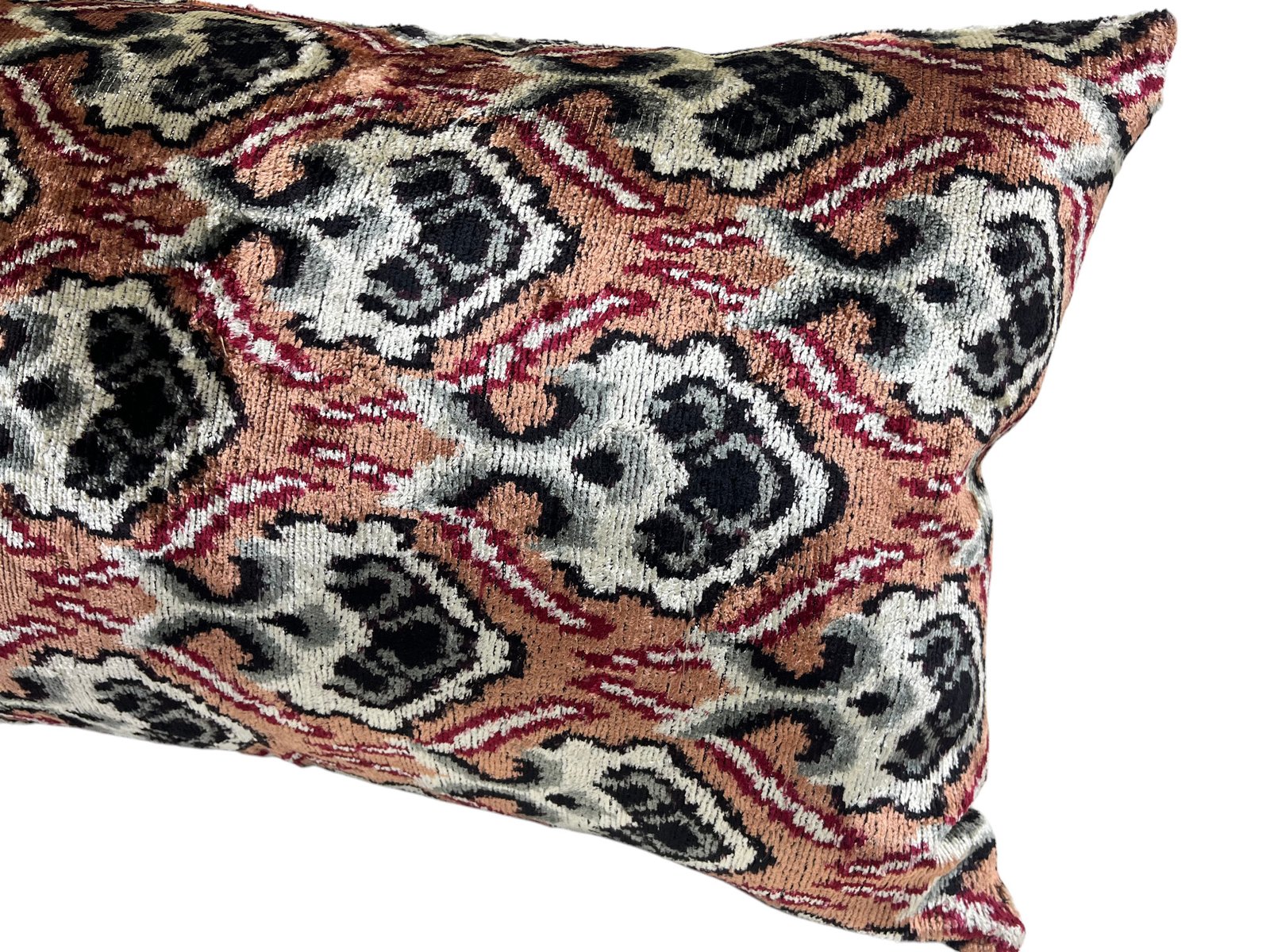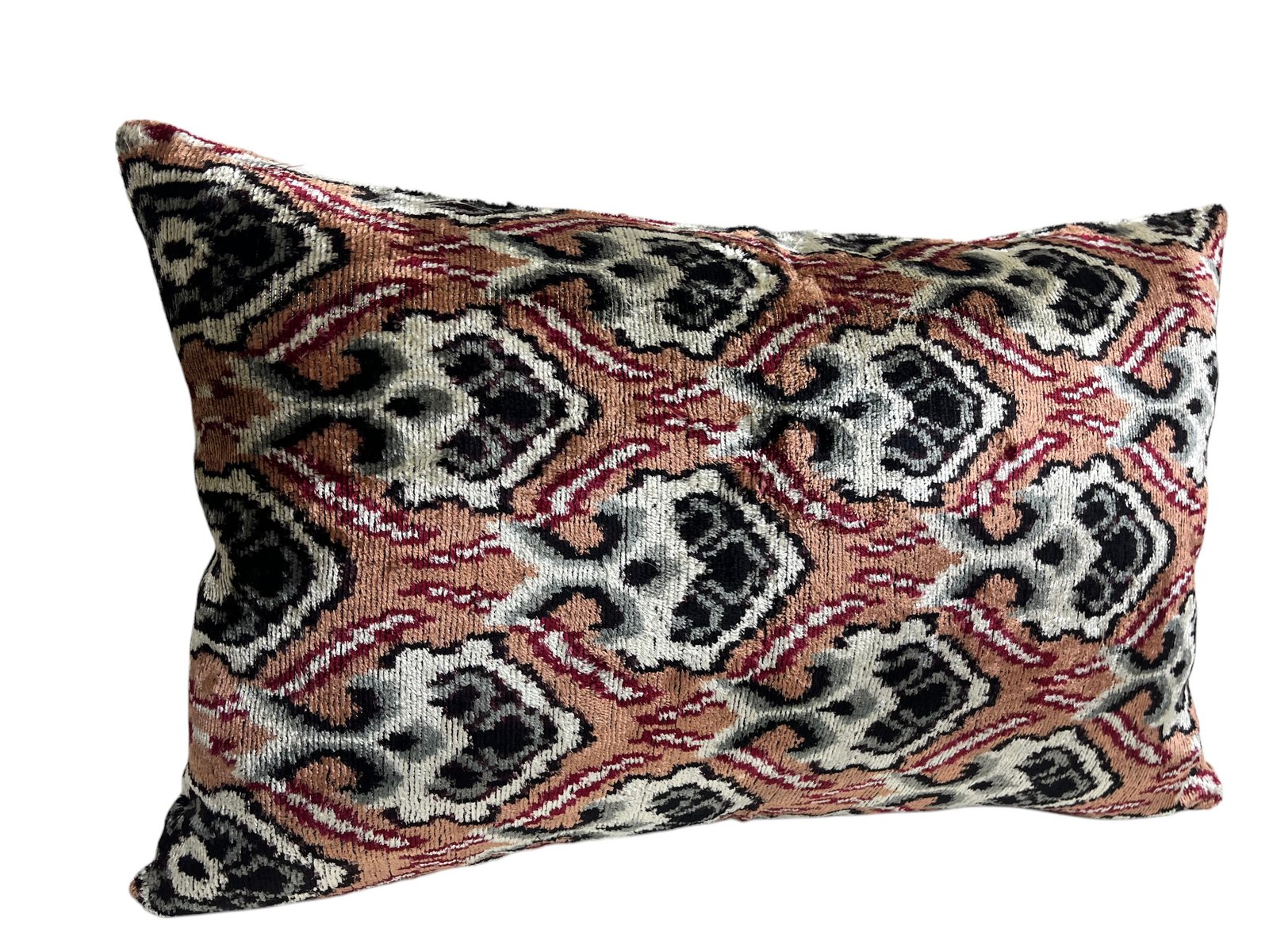 This pillow case features a luxurious silk velvet fabric with an ikat pattern, adding a touch of elegance and sophistication to any space. The unique weaving technique of ikat creates a striking, artistic design, while the softness of the silk velvet ensures both comfort and visual appeal. Perfect for accenting your living room, bedroom, or any area in need of a stylish, refined statement piece.