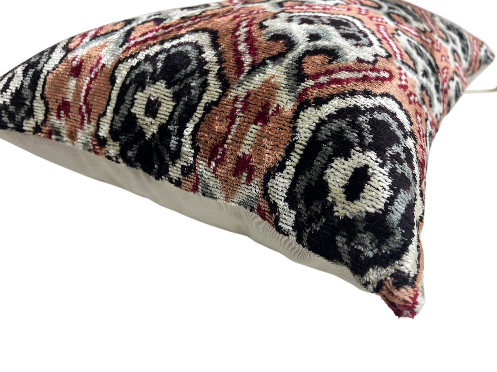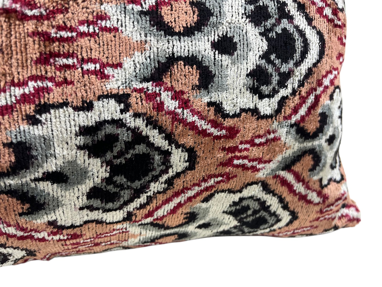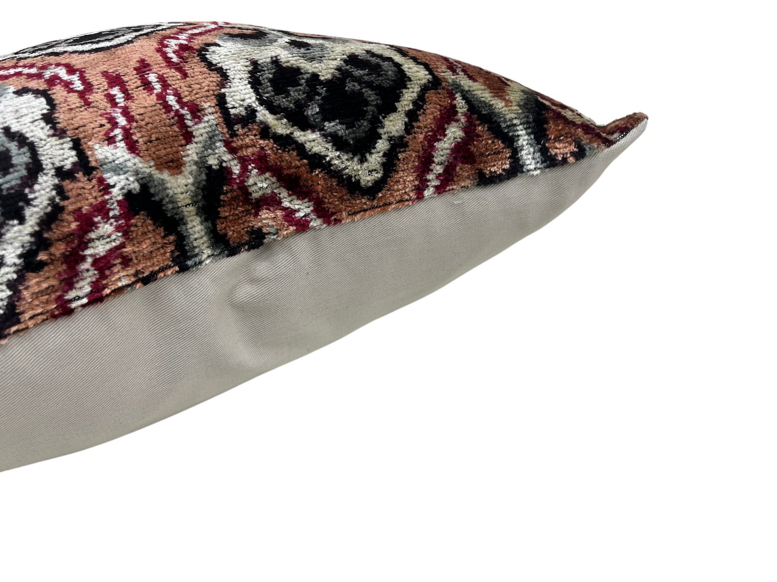 Dieser Kissenbezug besteht aus luxuriösem Seidensamt mit Ikat-Muster und verleiht jedem Raum einen Hauch von Eleganz und Raffinesse. Die einzigartige Webtechnik von Ikat schafft ein auffallendes, künstlerisches Design, während die Weichheit des Seidensamts sowohl Komfort als auch optische Attraktivität gewährleistet. Perfekt für die Akzentuierung Ihres Wohnzimmers, Schlafzimmers oder eines anderen Bereichs, der ein stilvolles, raffiniertes Highlight braucht.