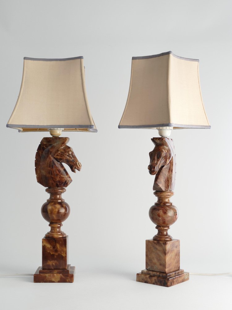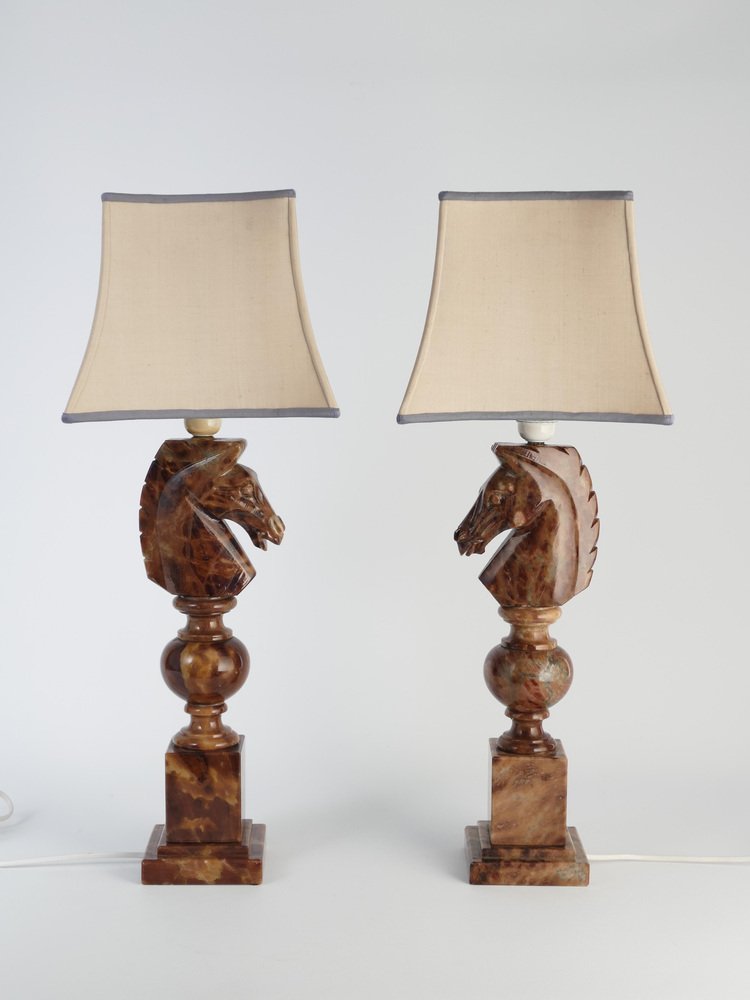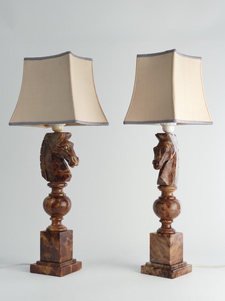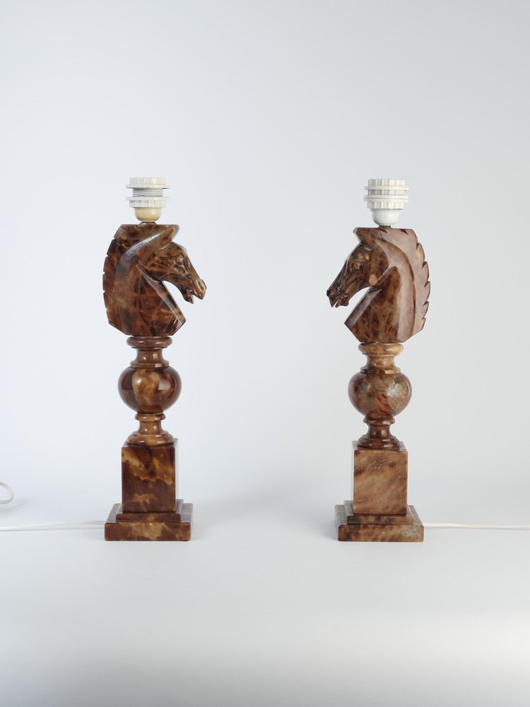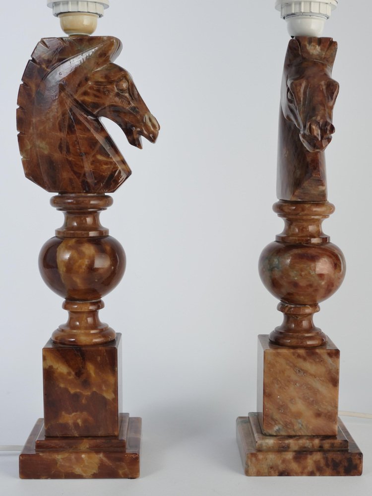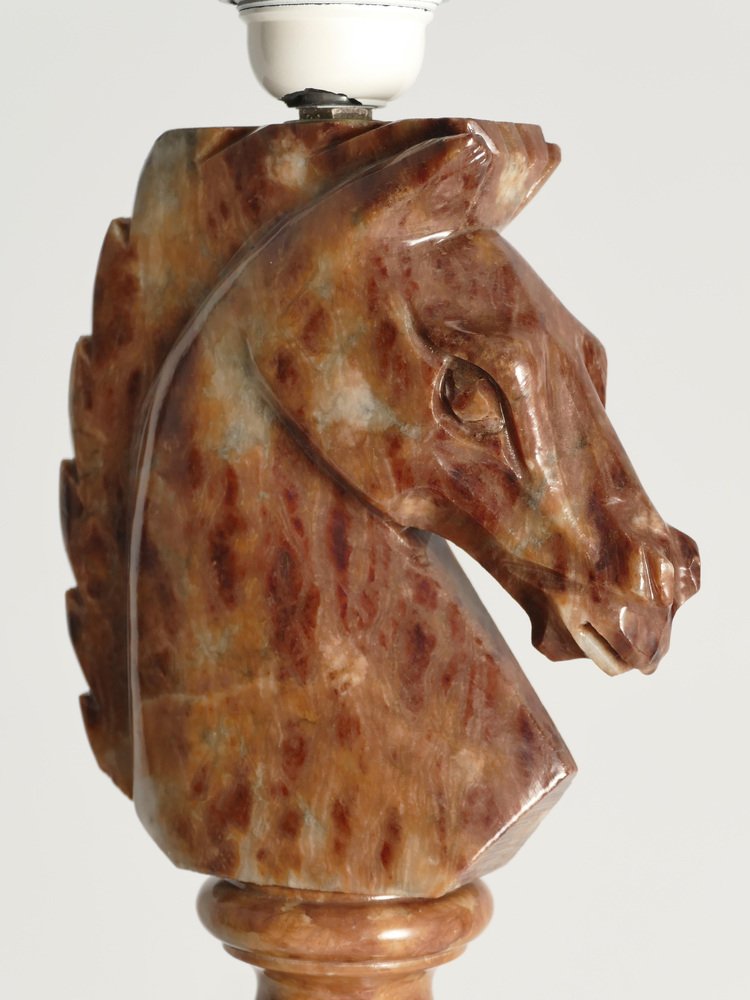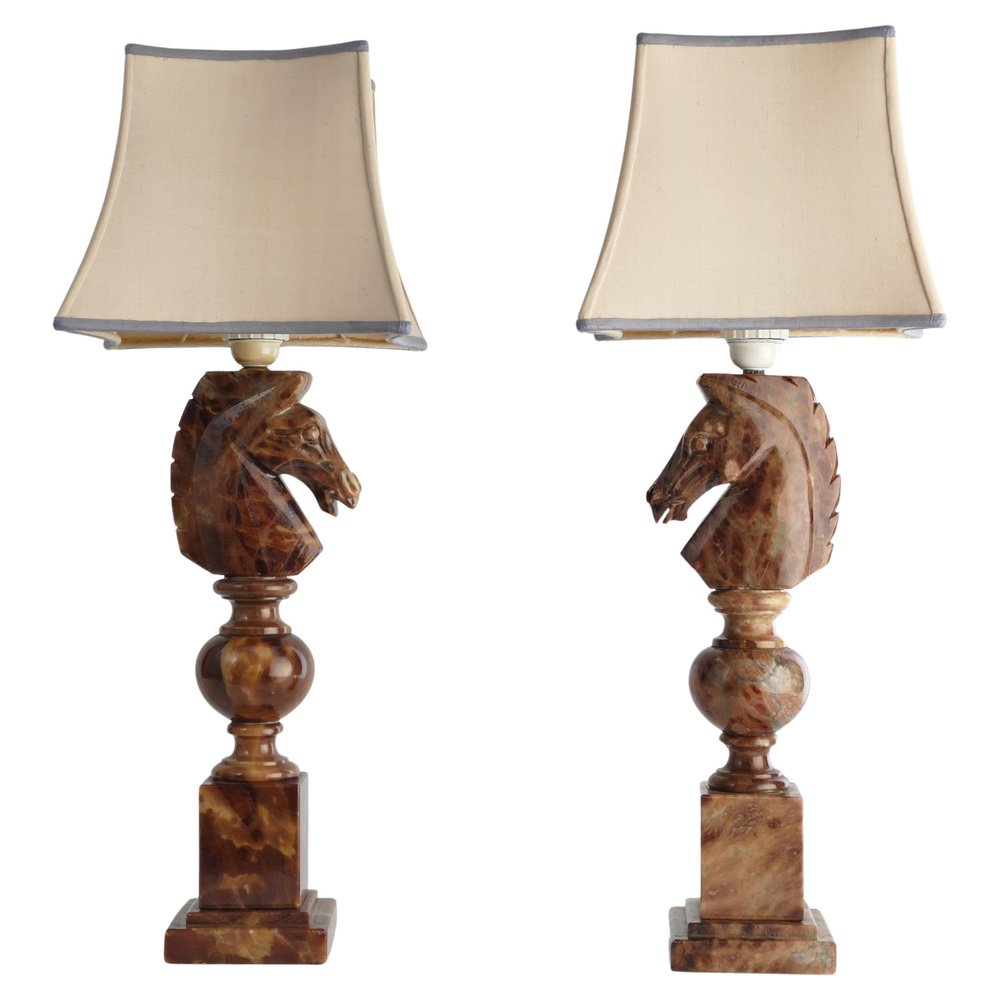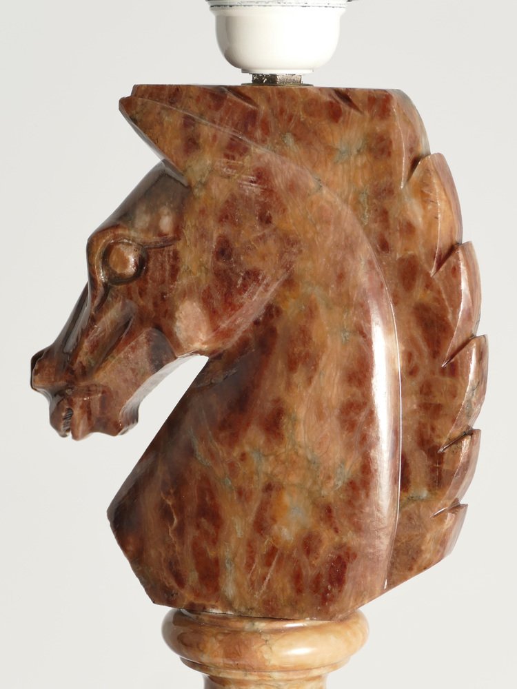 An astonishingly beautiful pair of Swedish-Italian hand-carved brown alabaster knight horse head table lamps, Nordiska Kompaniet, made in the 1970s. The knight, an essential piece in the game of chess, is symbolized by a horse's head and neck, renowned for its distinctive movement pattern on the board. Crafted from beautiful brown alabaster with natural light brown inlays, these table lamps feature exquisite detailing, with the horse's head atop ball and square blocks of the same alabaster. Each lamp is labeled with a sticker "Genuine Alabaster Hand Carved Made in Italy". Most likely these lamps were designed by NK designers and produced by skilled artisans in Italy. DIMENSIONS Height: 48 cm (40 cm without socket) Lamp base: 11 x 11 cm Width (horses profile): 13 cm