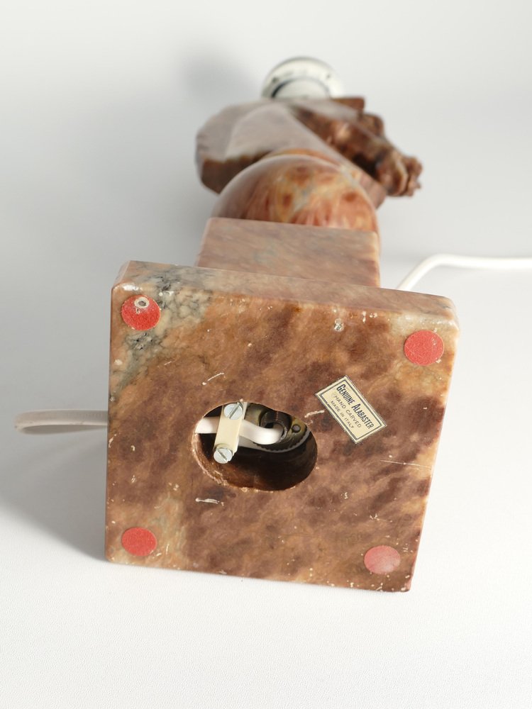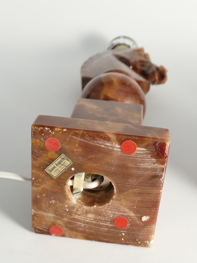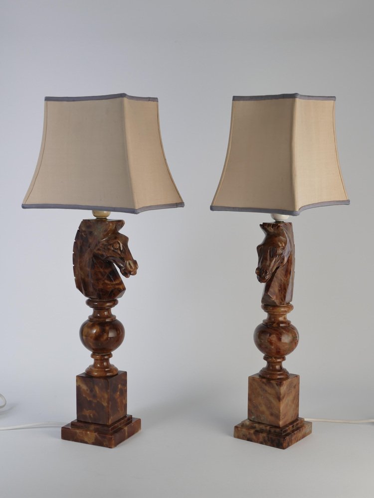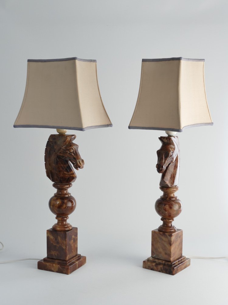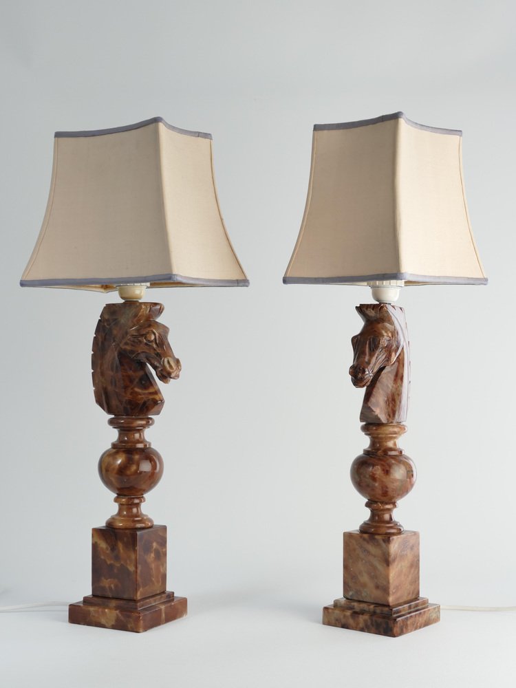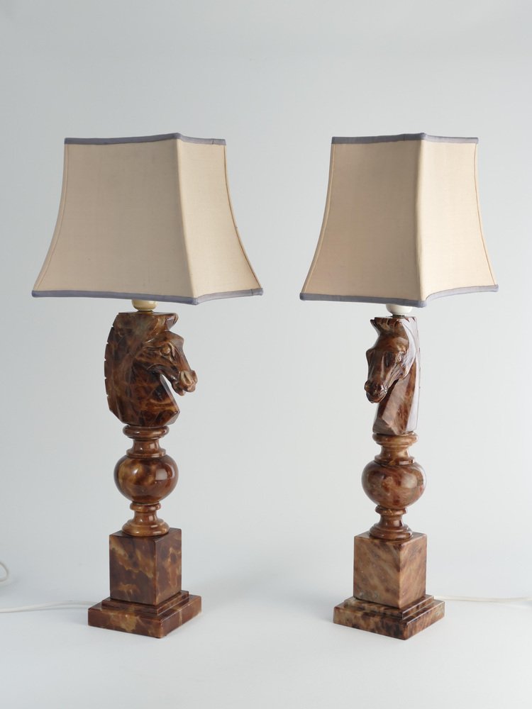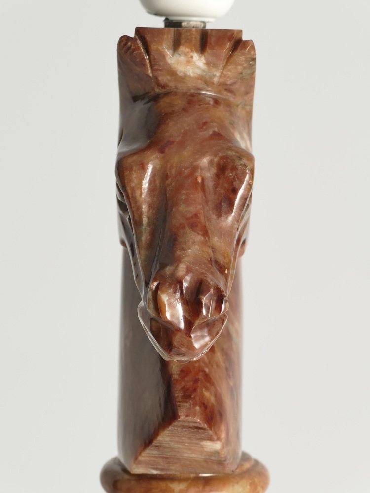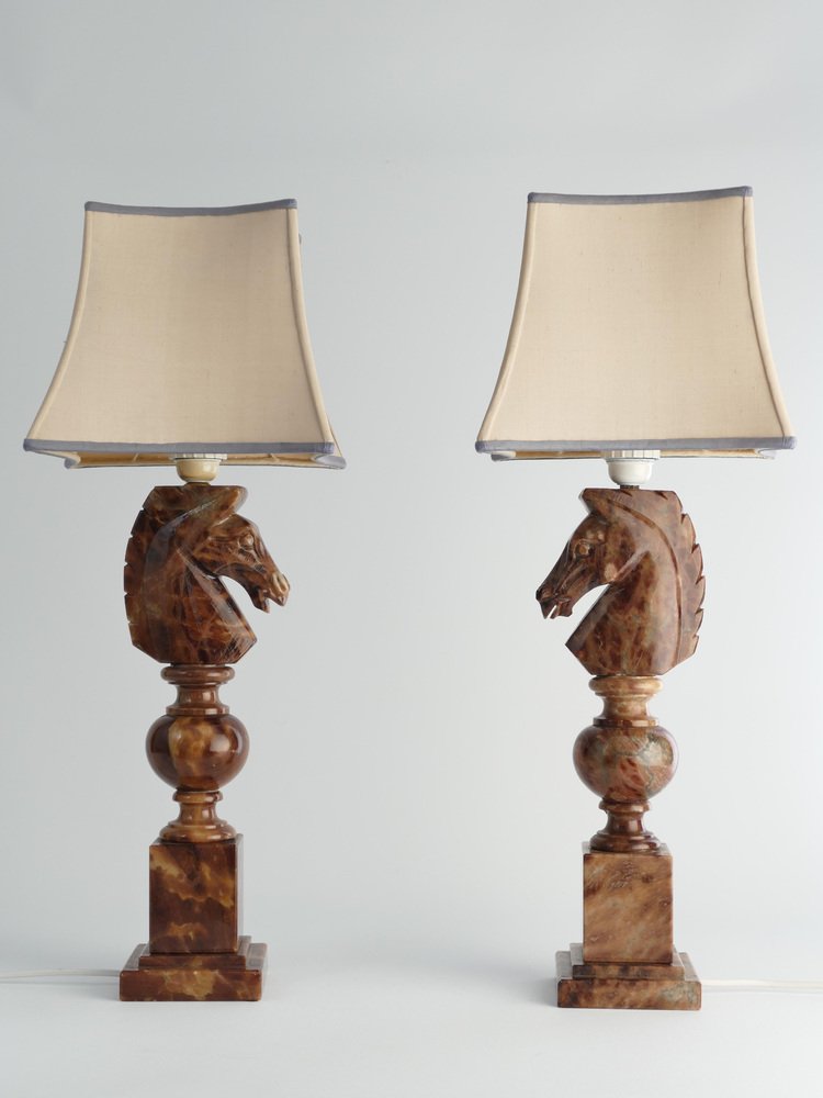 An astonishingly beautiful pair of Swedish-Italian hand-carved brown alabaster knight horse head table lamps, Nordiska Kompaniet, made in the 1970s. The knight, an essential piece in the game of chess, is symbolized by a horse's head and neck, renowned for its distinctive movement pattern on the board. Crafted from beautiful brown alabaster with natural light brown inlays, these table lamps feature exquisite detailing, with the horse's head atop ball and square blocks of the same alabaster. Each lamp is labeled with a sticker "Genuine Alabaster Hand Carved Made in Italy". Most likely these lamps were designed by NK designers and produced by skilled artisans in Italy. DIMENSIONS Height: 48 cm (40 cm without socket) Lamp base: 11 x 11 cm Width (horses profile): 13 cm
