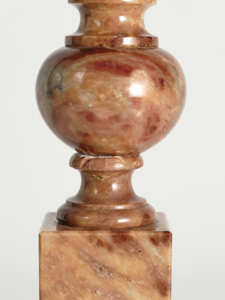 Ein erstaunlich schönes Paar schwedisch-italienischer, handgeschnitzter Tischlampen aus braunem Alabaster mit Pferdekopf, Nordiska Kompaniet, hergestellt in den 1970er Jahren. Der Springer, eine wichtige Figur im Schachspiel, wird durch den Kopf und den Hals eines Pferdes symbolisiert, das für sein charakteristisches Bewegungsmuster auf dem Brett bekannt ist. Diese Tischlampen sind aus wunderschönem braunem Alabaster mit natürlichen hellbraunen Einlagen gefertigt und zeichnen sich durch exquisite Details aus, wobei der Pferdekopf auf Kugel- und Quadratblöcken aus demselben Alabaster ruht. Jede Lampe ist mit einem Aufkleber "Genuine Alabaster Hand Carved Made in Italy" versehen. Höchstwahrscheinlich wurden diese Lampen von NK-Designern entworfen und von geschickten Kunsthandwerkern in Italien hergestellt. ABMESSUNGEN Höhe: 48 cm (40 cm ohne Fassung) Lampenfuß: 11 x 11 cm Breite (Pferdeprofil): 13 cm