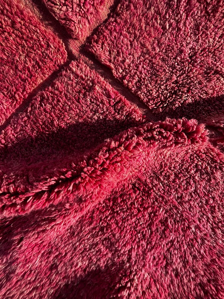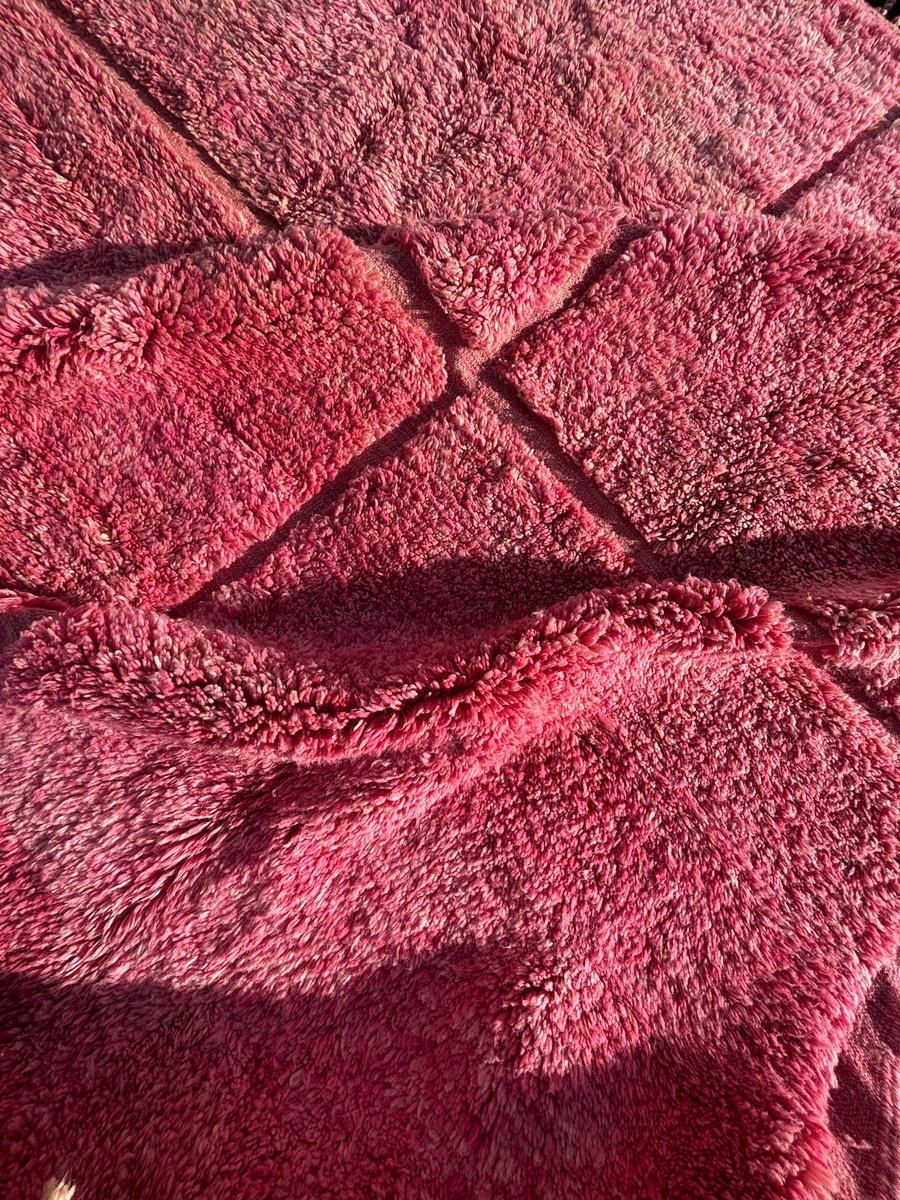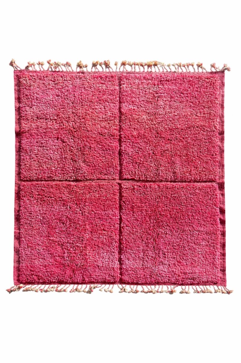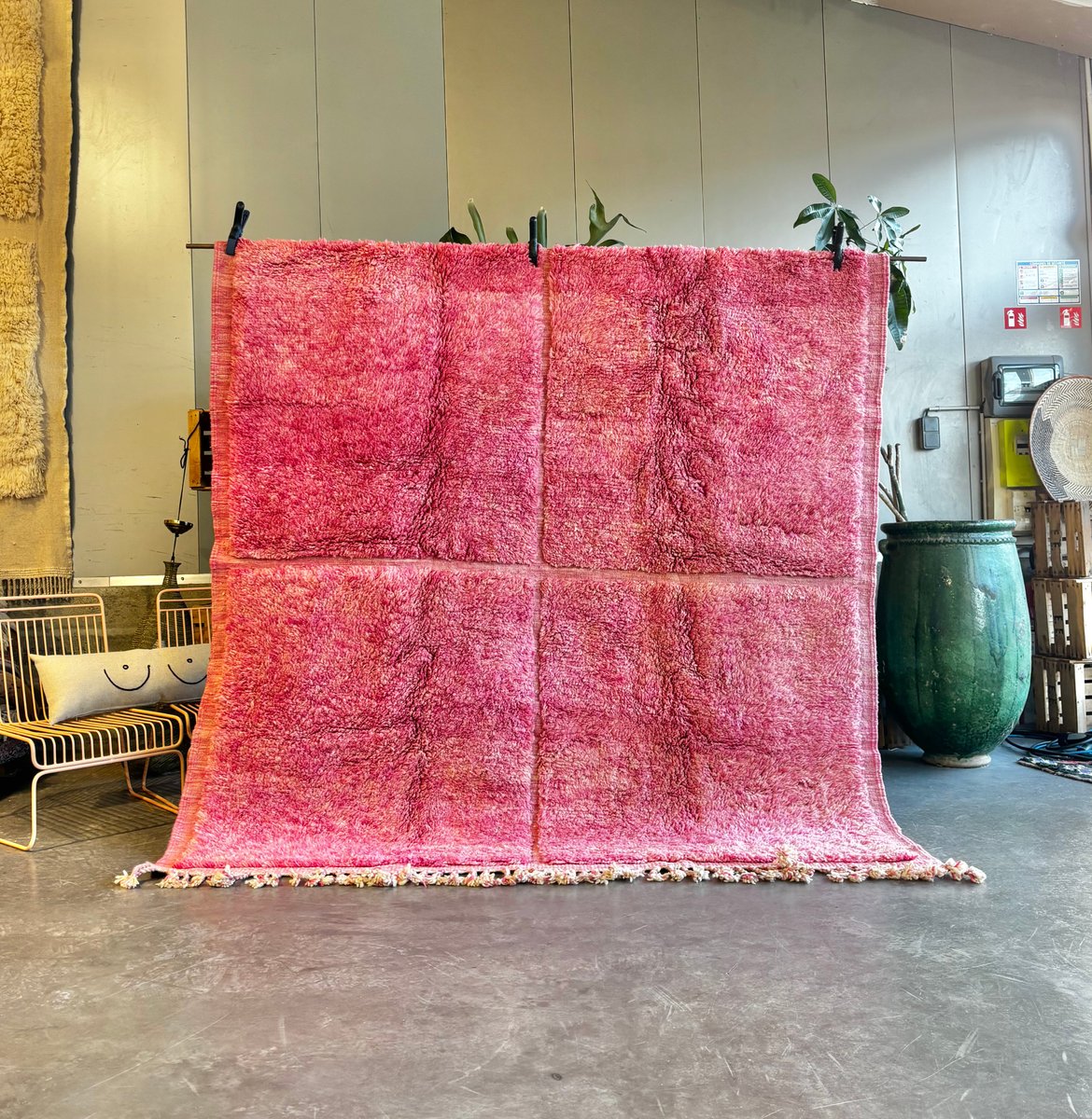 Technik: Handgewebt, Doppelknoten Material: 100 % Naturwolle Maße: 230 × 250 cm Farbtöne: Rosa mit natürlichen Wollnuancen Flor: Dick und dicht Fransen: Auf einer Seite vorhanden Zustand Sehr guter Zustand. Professionell gereinigt und gebrauchsfertig. Geringfügige Unregelmäßigkeiten sind typisch für handgefertigte marokkanische Teppiche und beeinträchtigen weder die Qualität noch die Struktur.