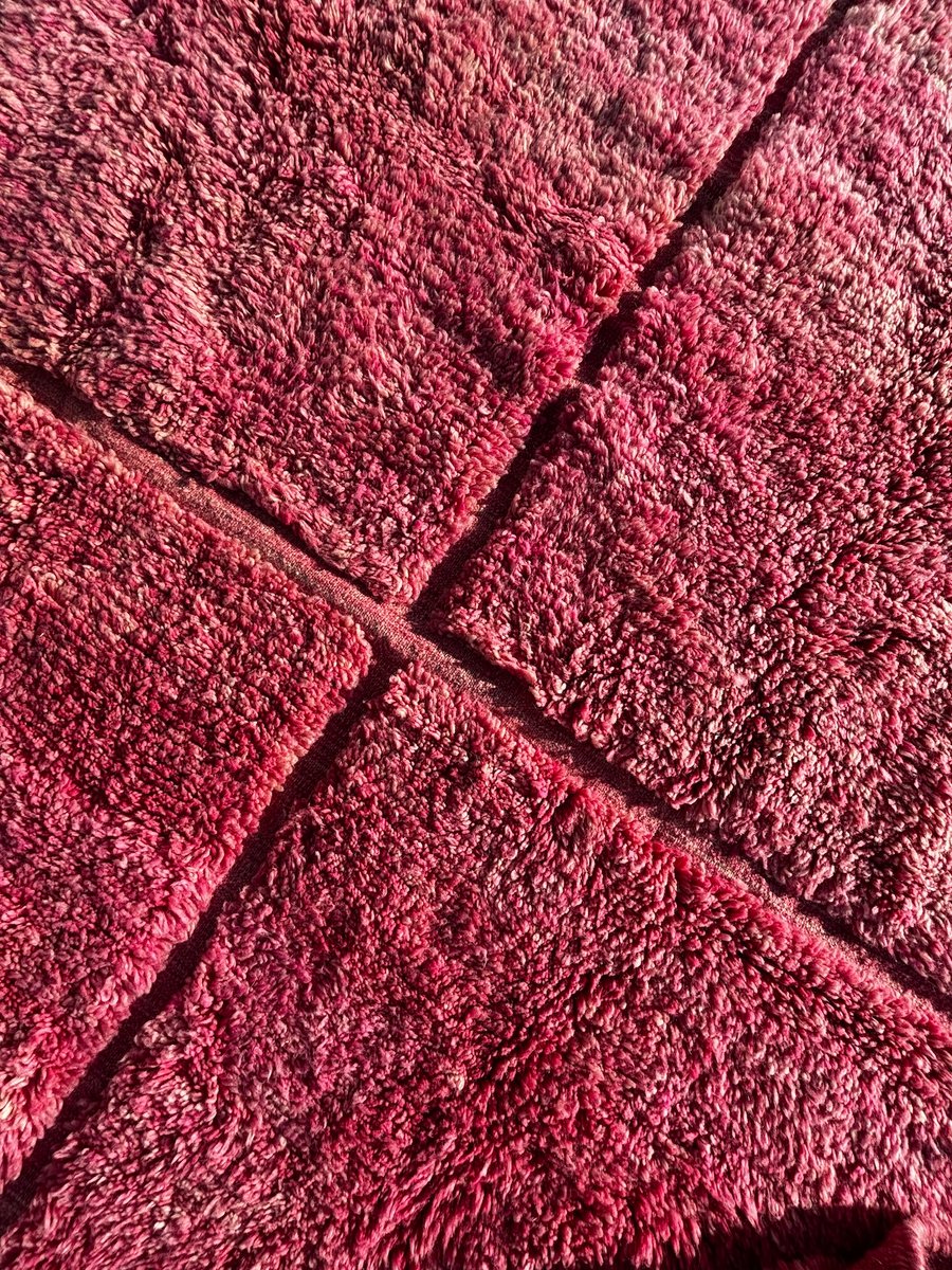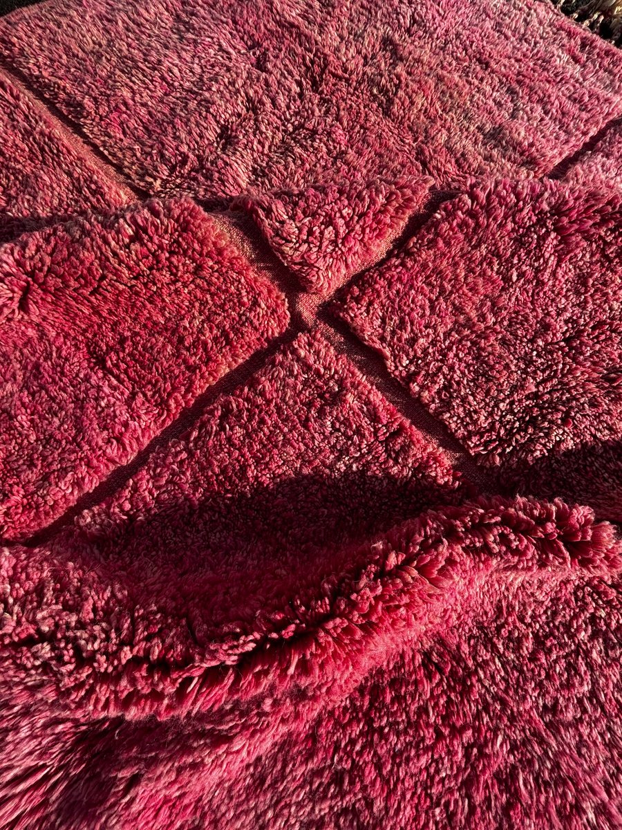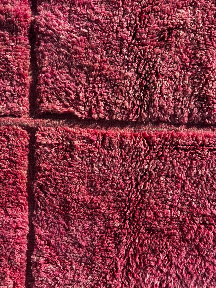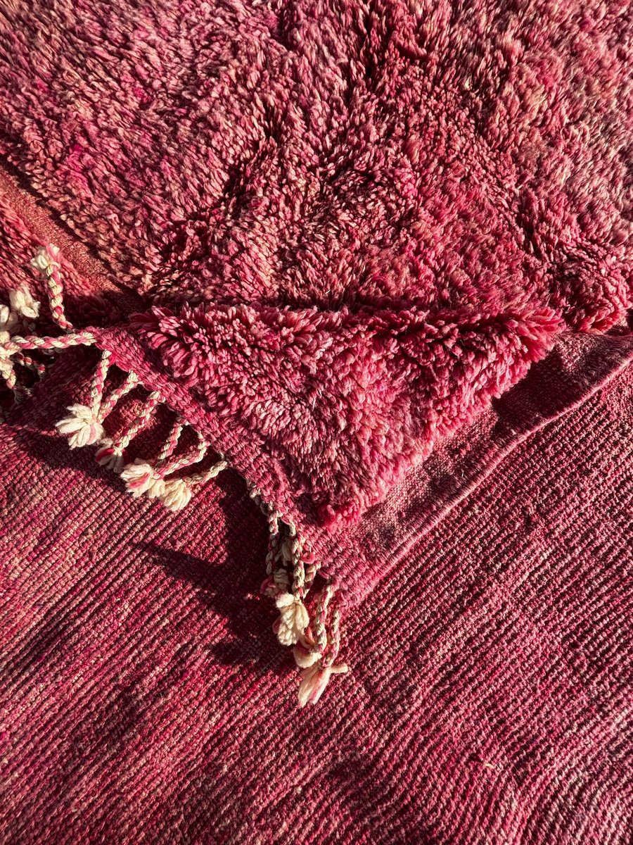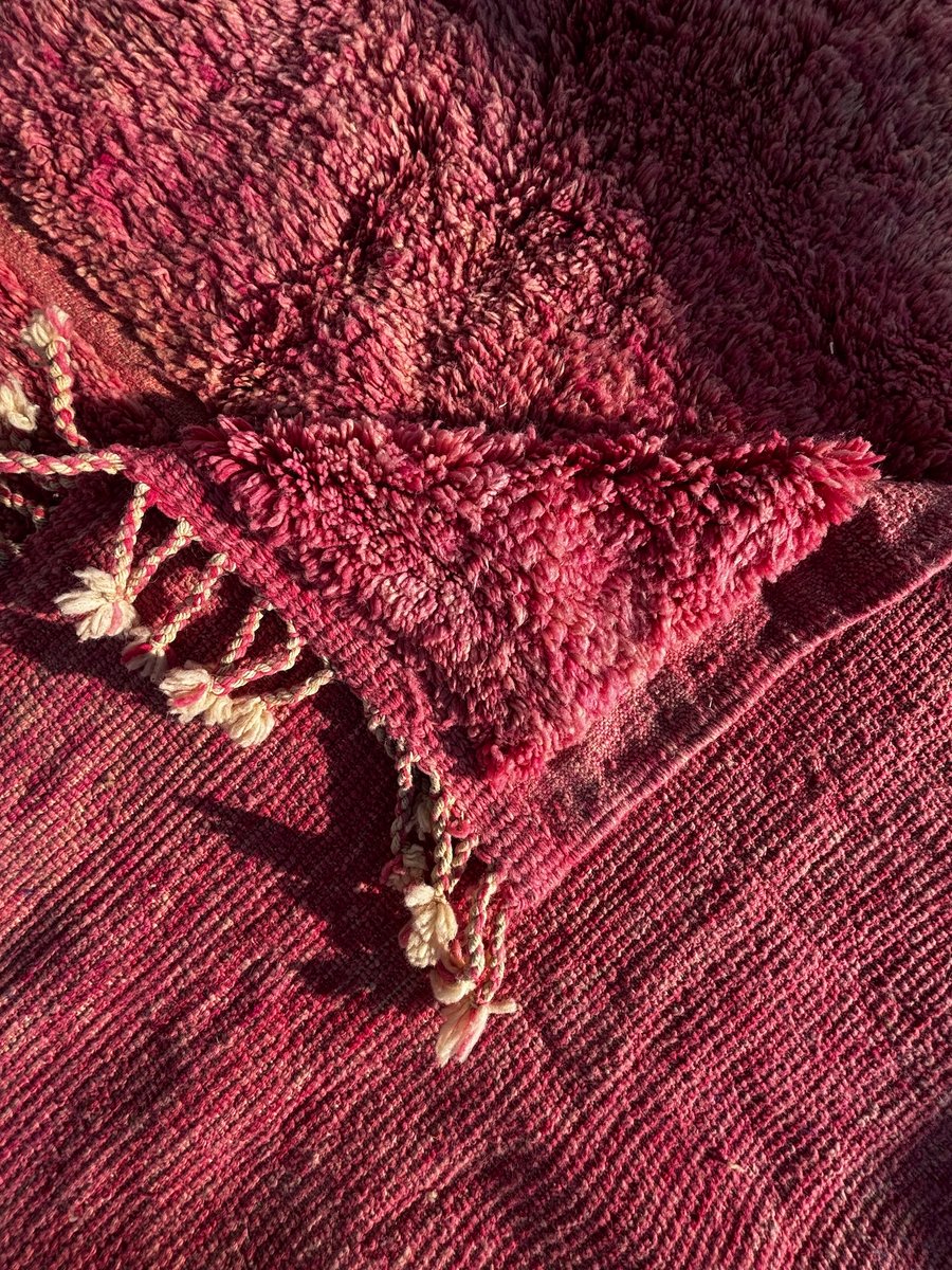 Technik: Handgewebt, Doppelknoten Material: 100 % Naturwolle Maße: 230 × 250 cm Farbtöne: Rosa mit natürlichen Wollnuancen Flor: Dick und dicht Fransen: Auf einer Seite vorhanden Zustand Sehr guter Zustand. Professionell gereinigt und gebrauchsfertig. Geringfügige Unregelmäßigkeiten sind typisch für handgefertigte marokkanische Teppiche und beeinträchtigen weder die Qualität noch die Struktur.