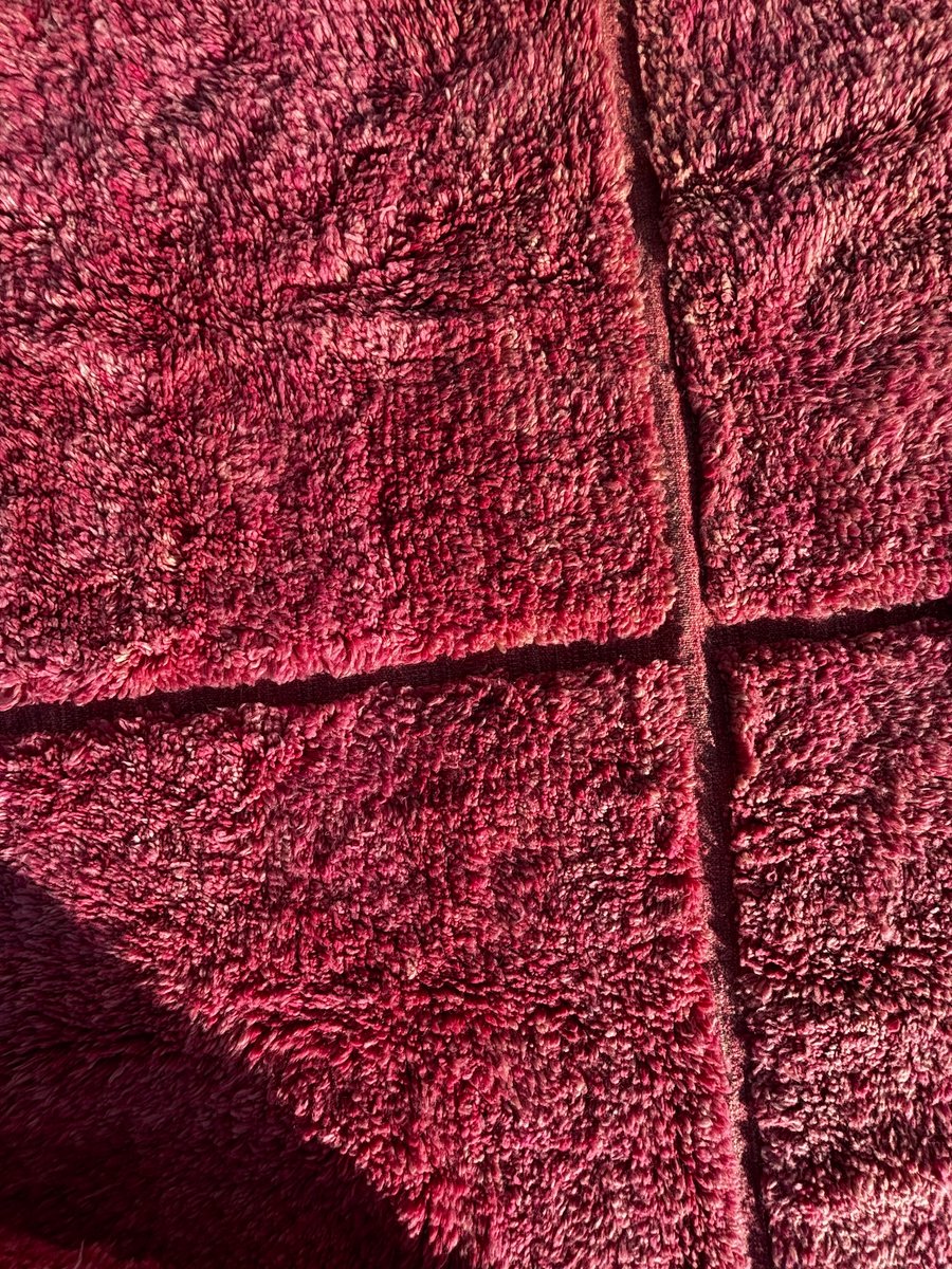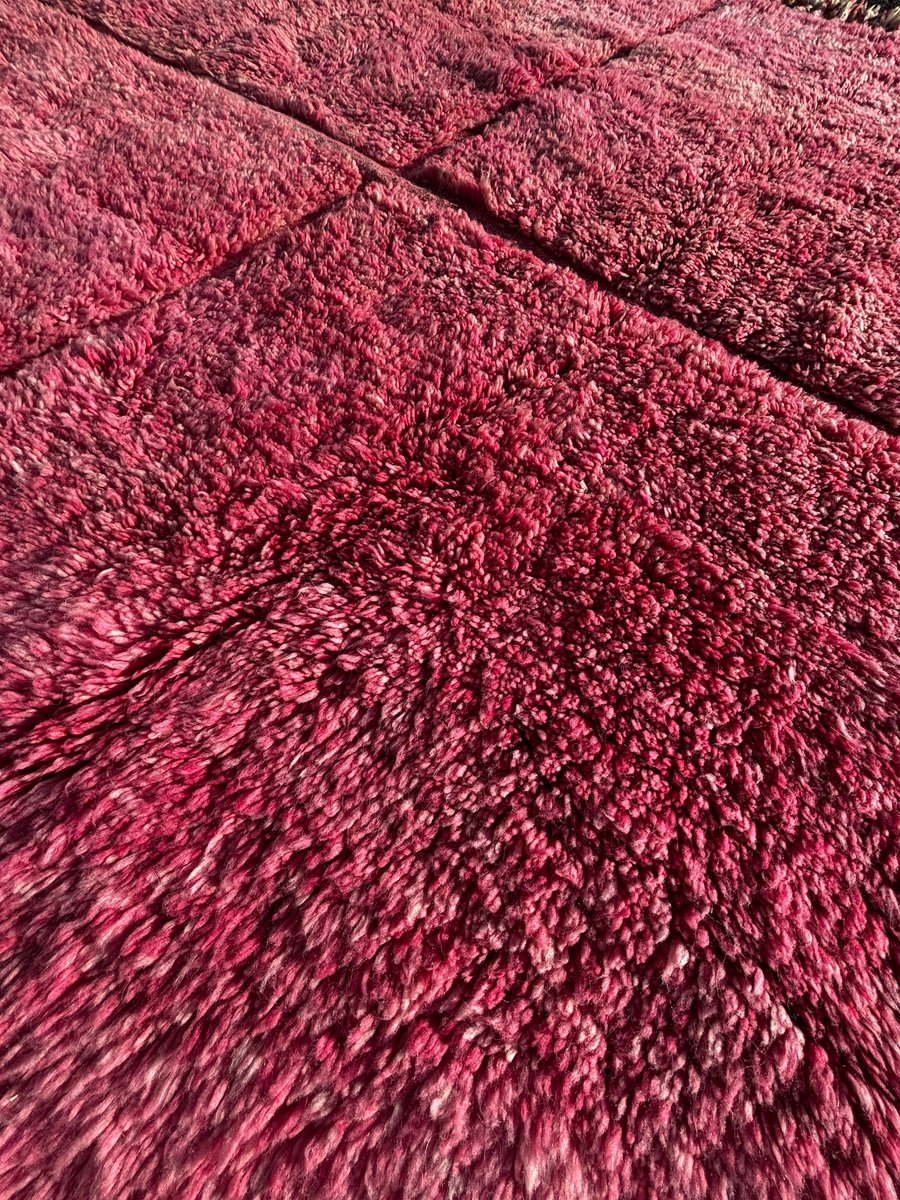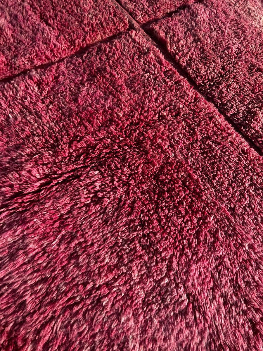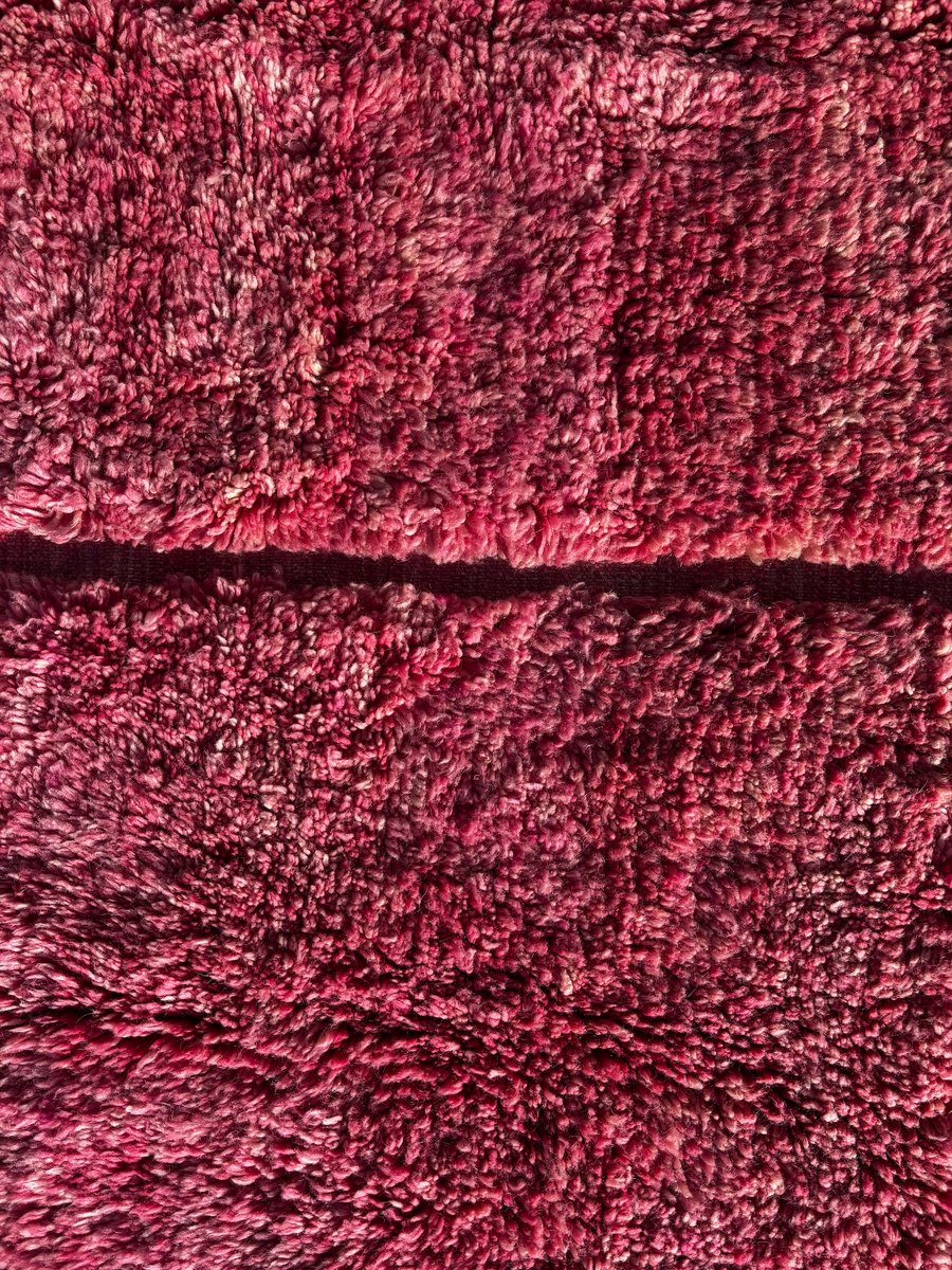 Technik: Handgewebt, Doppelknoten Material: 100 % Naturwolle Maße: 230 × 250 cm Farbtöne: Rosa mit natürlichen Wollnuancen Flor: Dick und dicht Fransen: Auf einer Seite vorhanden Zustand Sehr guter Zustand. Professionell gereinigt und gebrauchsfertig. Geringfügige Unregelmäßigkeiten sind typisch für handgefertigte marokkanische Teppiche und beeinträchtigen weder die Qualität noch die Struktur.