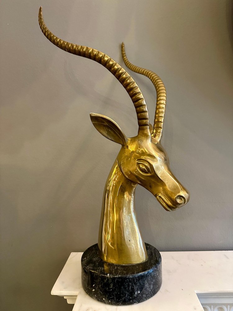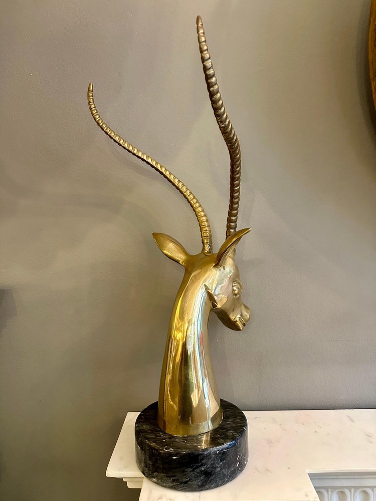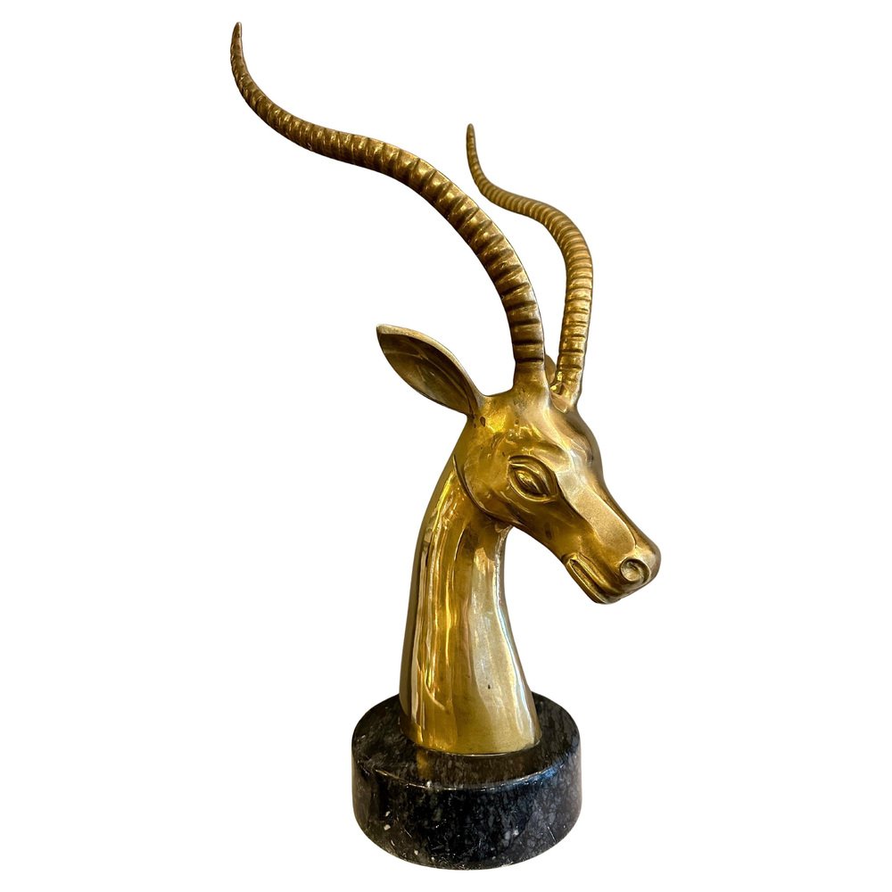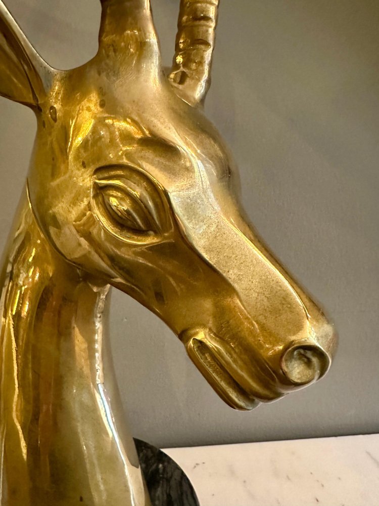 Impala Kopf aus Messing mit Hörnern auf schwarzem Marmorsockel, 1970er