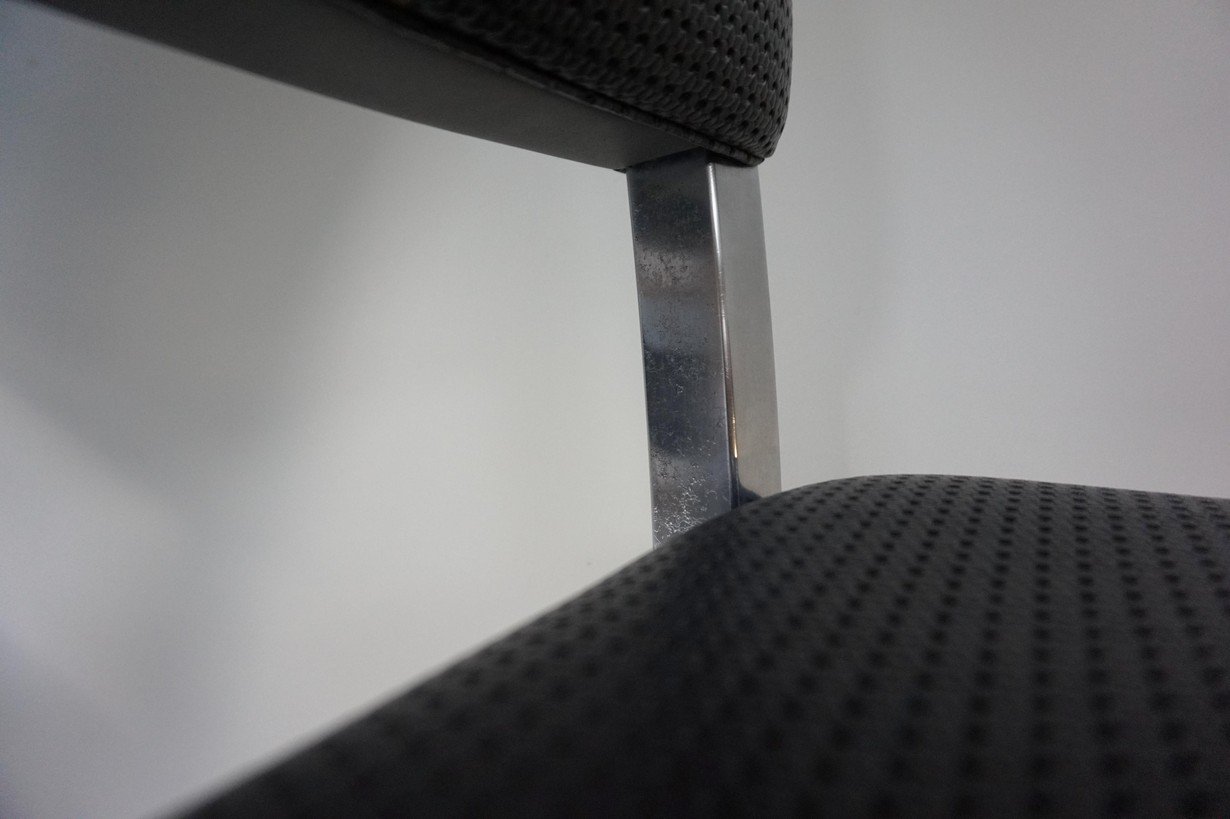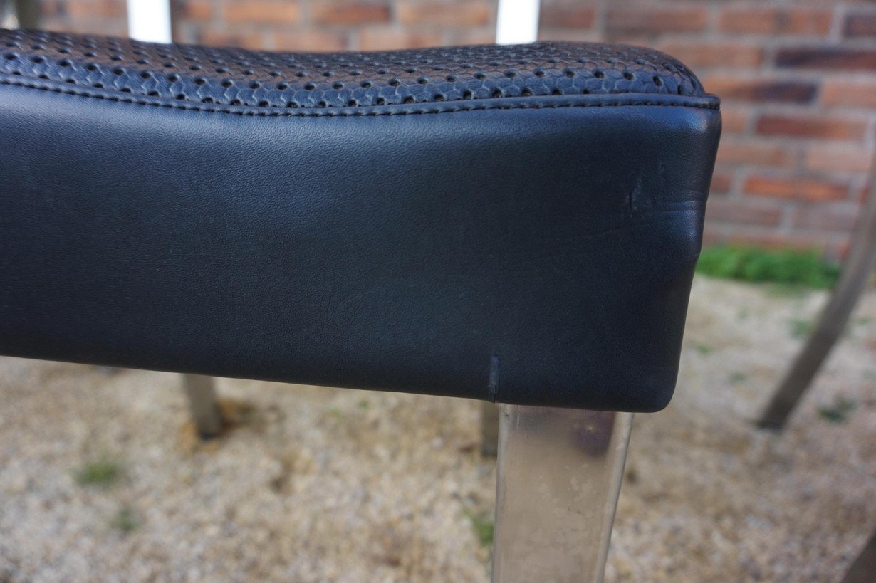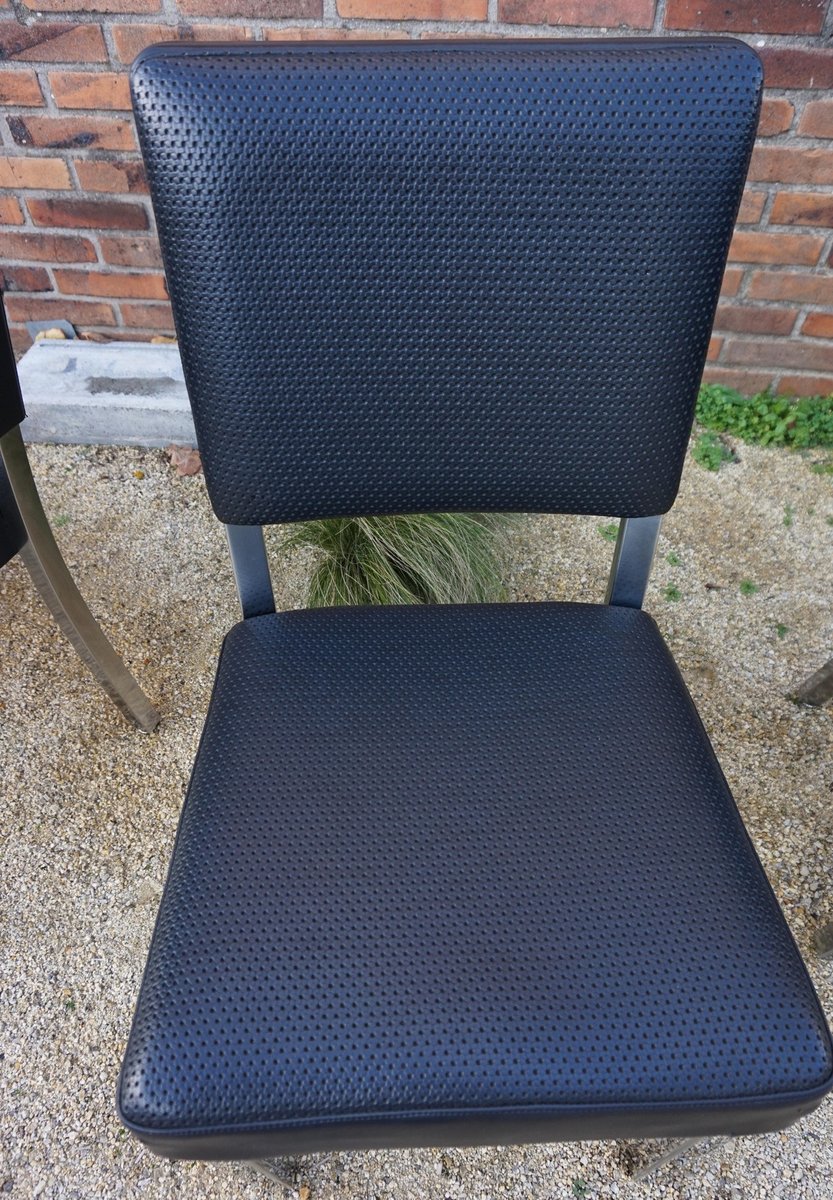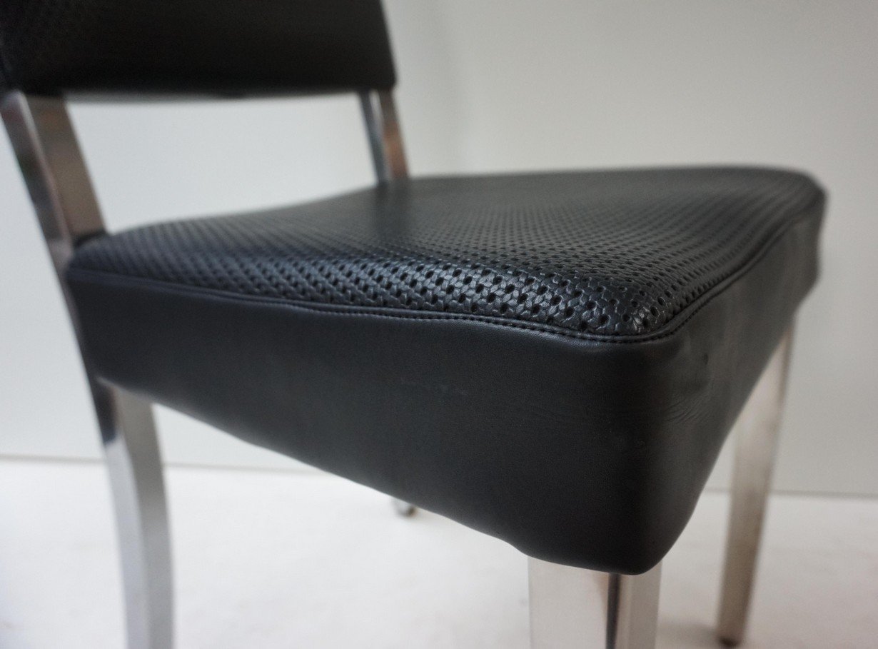 Sehr gut verarbeitet in Stahl, Chrom und schwarzem perforiertem Kunstleder. Unter dem Stuhl befindet sich ein gut geformtes, gelochtes Untergestell aus armeegrünem Metall mit einer sternförmigen Stützkonstruktion