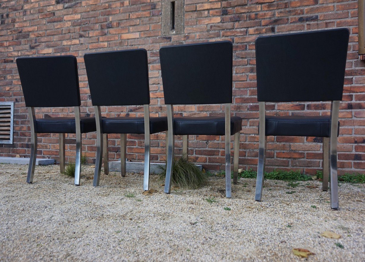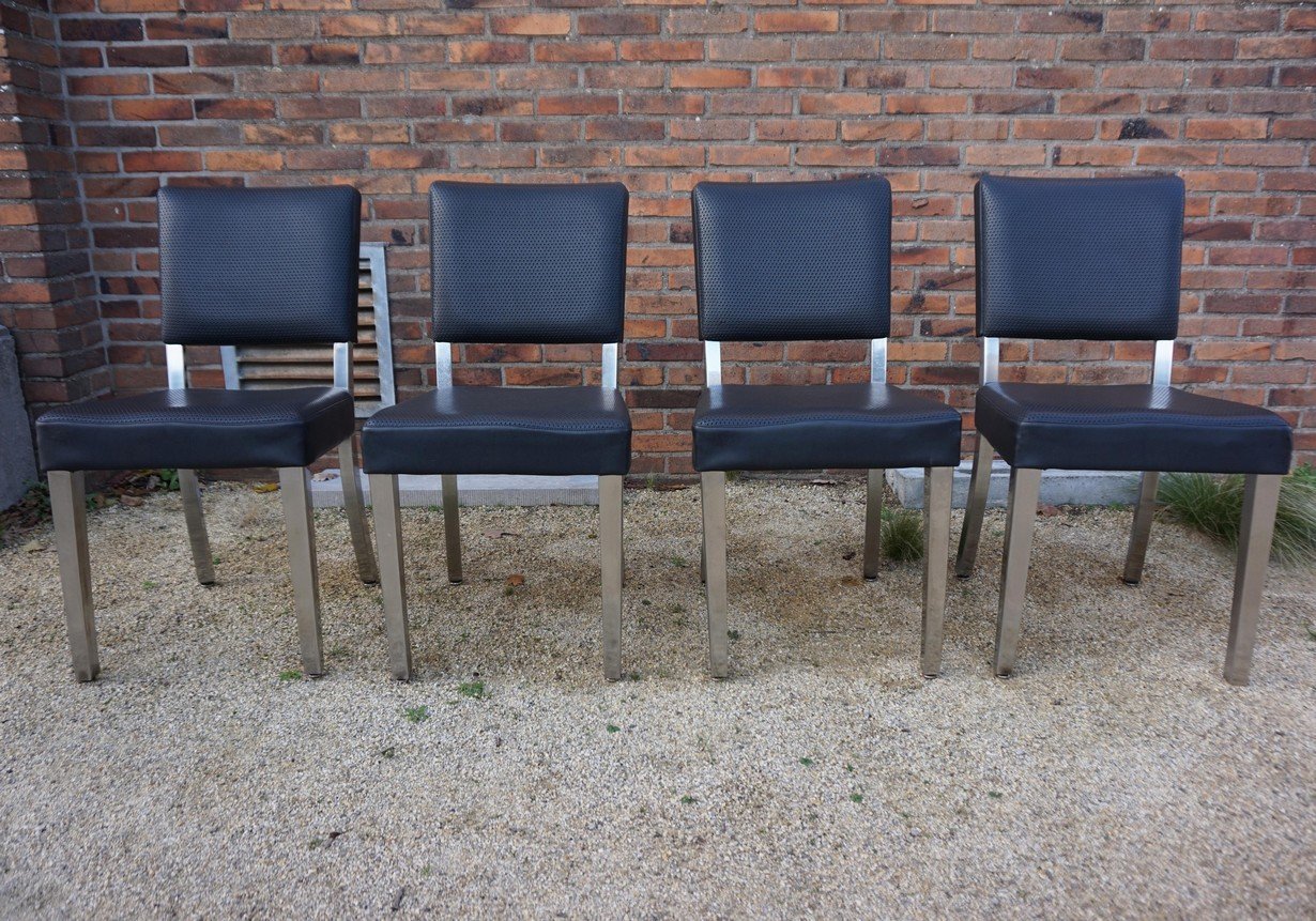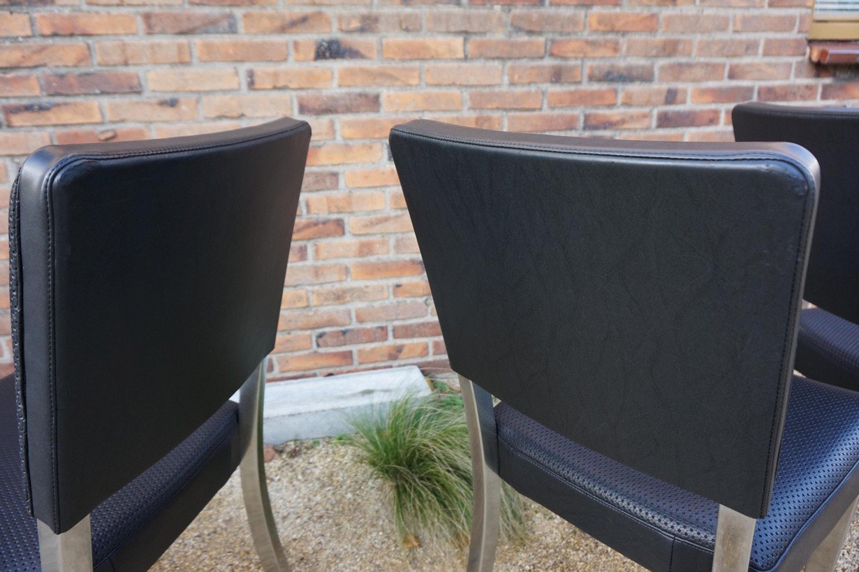 Sehr gut verarbeitet in Stahl, Chrom und schwarzem perforiertem Kunstleder. Unter dem Stuhl befindet sich ein gut geformtes, gelochtes Untergestell aus armeegrünem Metall mit einer sternförmigen Stützkonstruktion