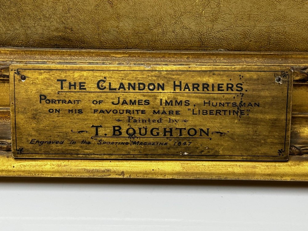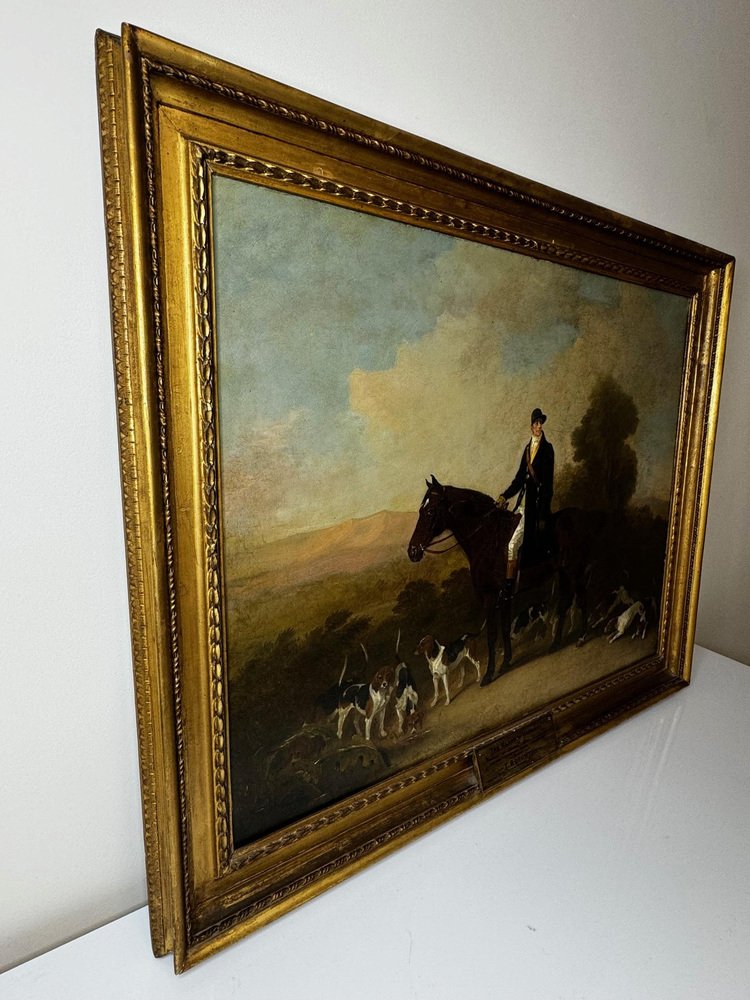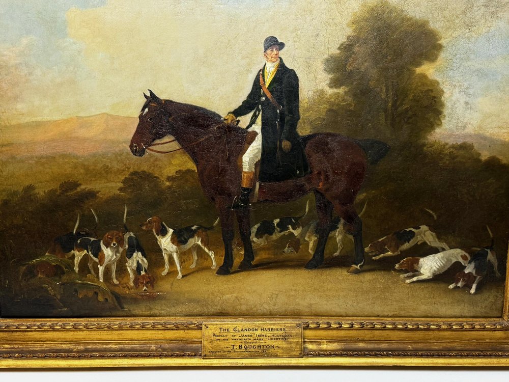 1 British Victorian Oil Painting The Clandon Harriers Hunt John Imms of Ringmer Up Mare Libertine with Scent Hound Dogs. 1 British Victorian Oil Painting The Clandon Harriers Hunt John Imms of Ringmer Up Mare Libertine with Scent Hound Dogs. Impress your clients & guests with this hunting masterpiece statement artwork for your office or home wall space. Title “The Clandon Harriers Portrait of James Imms, Huntsman, on his favourite mare Libertine” by Richard Barrett Davis. Oil on canvas, set in a traditional original gilt wood frame. Having vivid hues, greens, brown, white, sky blue & black hue colours. Circa 1840's mid 19th century earlyVictorian era. Unsigned. By the known British artist Richard Barrett Davis. In our opinion this is an exceptional example of his work. Subject hunting portrait of the known huntsman John Imms who is in full side profile riding up on his favourite bay hunter mare horse Libertine, he is holding her reins in one hand ans is looking back towards the right, he is wearing his black hat with dark green hunting overcoat, with white trousers & tan brown & black riding boots. He has stopped in a clearing in the countryside. His pack of scent hound dogs are below around him sniffing the scent of the fox prey, further back to the right a tall lush green tree with a line of smaller trees further along. In the distance views of the Sussex Downs in open countryside, above the sky light blue with white scattered clouds. An impressive display size with the frame being 87 cm high and 107.5 cm wide. with hanging thread on the back ready for immediate home wall display. Artist biography Artist biography Richard Barrett Davis RBA (1782–1854) was an animal and landscape painter. Davis was born at Watford in Hertfordshire 1782. In 1789 his dad became huntsman to the King George III, after seeing his sons drawings he persuaded Francis Bourgeois to teach the young artist. Davis studied under William Evans of Eton, under William Beechey, he was also in the Royal Academy where he first exhibited in 1802. He later joined the Society of British Artists in 1829, and was appointed animal painter to William IV in 1831. Then to Queen Victoria. from 1836 he made a series of prints for publishers A. H. Bailey & Co. titled ‘The Hunter's Annual’ (1836-41). He also made some 30 illustrations for the ‘Sporting Magazine’. He died in Kensington in 1854. His paintings have been exhibited in galleries & sold in auction houses around the world, the highest sold price is $40,623 US dollars. His work Near Virginia Water is in South Kensington Museum. The Clandon harriers were established by their noble owner, the Earl of Onslow, then Lord Cranley, of Clandon Park, Surrey, in the year 1800. The hounds selected were from the best blood in the east of Sussex, as the following names fully justify-namely: Harrison Carrs, Beddingham; Mr. Augers, Eastbourne; Mr. Ellman, Glynde; and the Brookside harriers. with the hounds, their late huntsman, James Imms (whose portrait occupies the centre of this painting), was transplanted from the Sussex downs to the Surrey hills. from the first formation of the pack to the present period, his lordship has ever bestowed the greatest attention on the improvement of the hounds, sparing neither time, trouble, nor expense. Wherever there was a superior hound, whose breeding was known to be right, care was always taken either to secure him or to procure a cross. The result of this extraordinary attention, it will readily be supposed, was the production of a perfect animal, both as regards beauty of form and hunting qualities. with these qualities, however, his lordship was not content: he determined to carry the excellence of the pack further, and therefore made a rule that every hound must have tan coloured head and ears. This combination of excellence and elegance might have satisfied the most fastidious; but not so the noble owner, for the "music of the pack" was quite as much an object of care with Lord Onslow as the shape, size, and uniform colour of the hounds. Such, indeed, was the delicacy of his lordship's ear, that he immediately detected the note of discord; and the hound failing in this particular, however good his qualities in other respects, was immediately condemned. The cry of the pack is, in consequence, music itself; and to describe the effect produced the first time it falls on the ear is impossible. It can be compared to nothing so happily as a well-attuned ring of joyful bells, full of life and mirth, without a single jar to mar the melody. The harmony of a pack of hounds, if ever attempted, has, we believe, never before been accomplished, and is a taste which could be gratified only by a person having an ample purse and liberal hand, as the voice of the hound will change with his years. Often would Imms, when a favourite hound or known good one had failed in his note, plead his age in extenuation, and feelingly beg for his retention in the pack; but so inexorable was his lordship's rule, that in no instance was the prayer successful. The old huntsman, presuming on his standing, would sometimes venture to disobey orders, taking especial care, however, not to have the condemned hound with the pack when his lordship was in the field; but this availed nothing: sooner or later, the note of discord was sounded in the kennel-cry; and then the imperative mandate went forth, and Imms was reluctantly obliged to succumb, and part with his favourite. The pack are good hunters, and have the reputation of being the fastest harriers in England, and certainly in beauty of form and colour cannot be surpassed. They are a large hound, are well eared, and have plenty of tongue, a great desideratum in a pack of harriers; whilst their bodies have a very strong resemblance to that of the foxhound. The last cross of any great extent was from the Reigate pack, in 1840. They have also been crossed with the blood of Thomas Meagre, Esquire, of Pitt Place, near Croydon.
