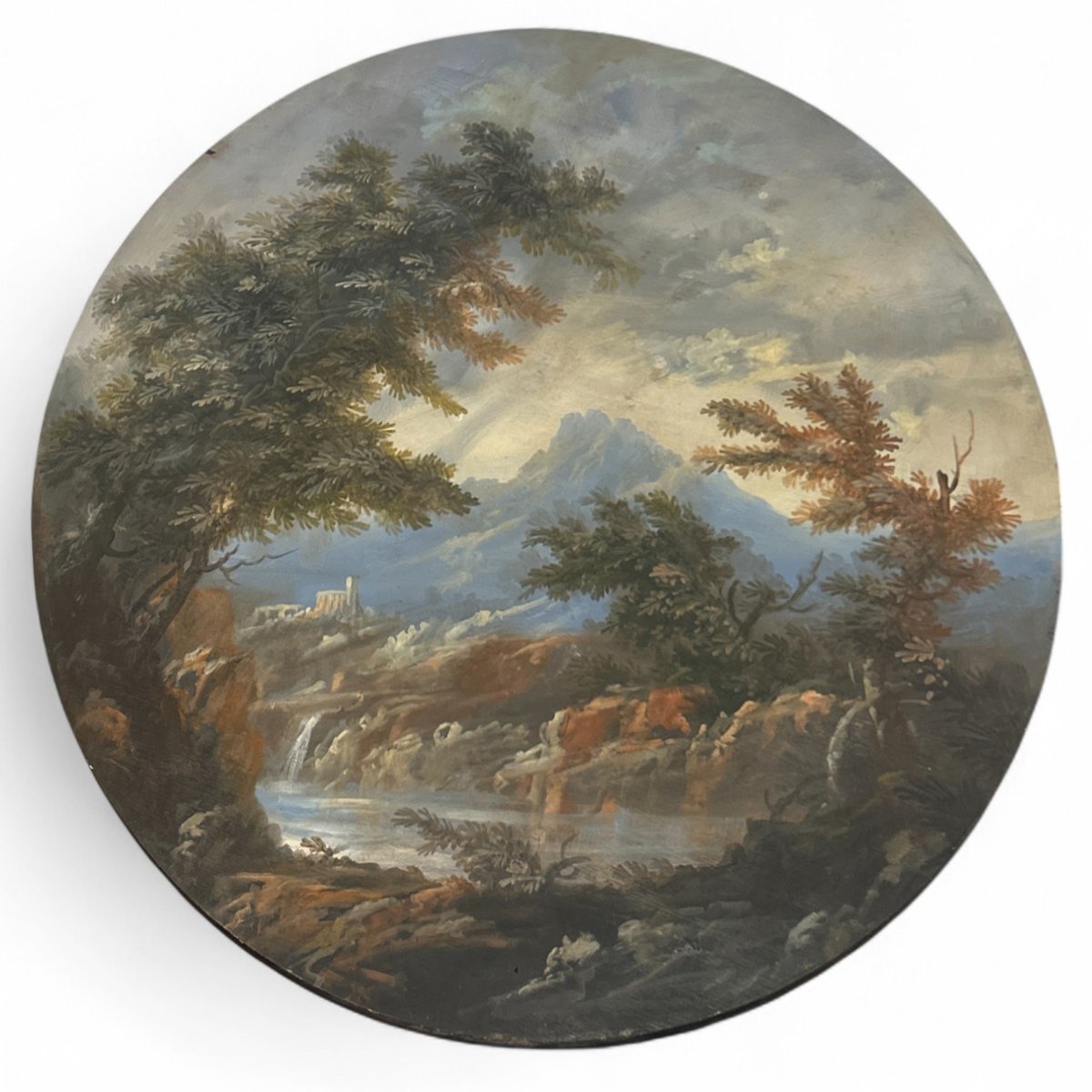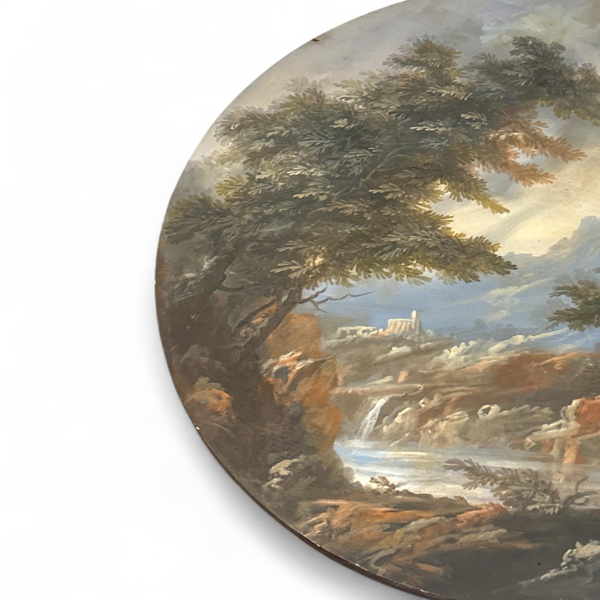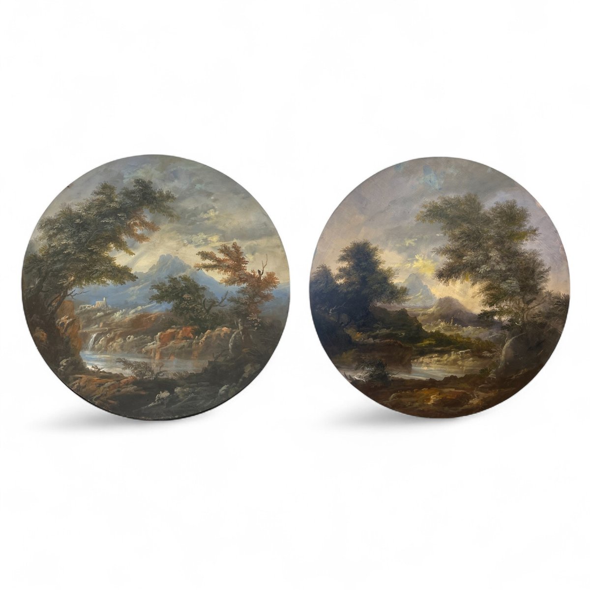 Kreisförmige Tafeln mit Landschaft, Öl auf Leinwand, 1890er-1910er, 2er Set