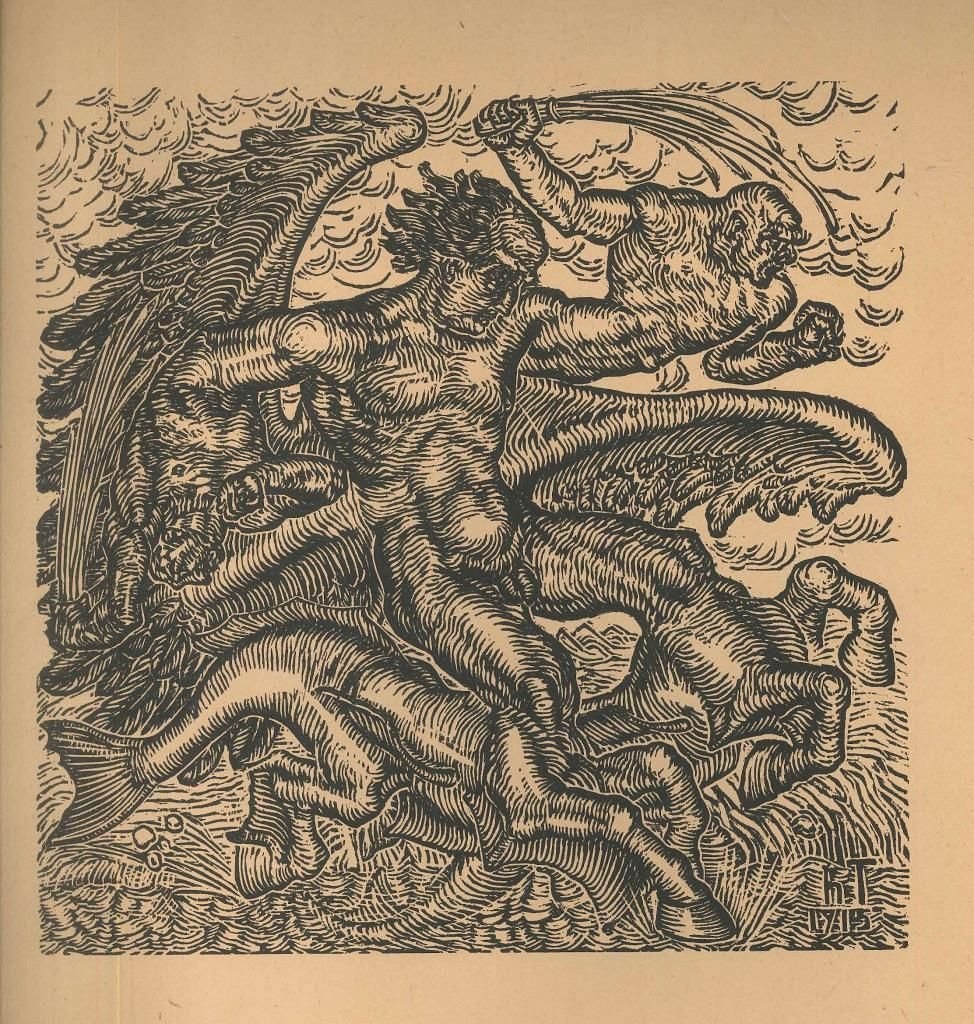 Krieg (''War'') is an original artwork realized by Hans Trudel in 1915. The monogram of the artist appears on the lower right margin. The xilograph is part of a portfolio including five graphic works realized by different artists and published in 1917. Good conditions except for a rip on the central right margin and other two small rips on the lower and on the upper right margin. Krieg (''War'') is a representation of a fight. In the center of the xilograph there is the figure of a naked creature that is throwing a shot. At the bottom, there are some animal-like parts of bodies: the paws of a horse, the tail of a fish, and two big wings appear in the background. On the right, a small figure of a man is about to fight back with violence. The creature is a monstrosity: it has animal attributes instead of limbs. In the background there are some clouds. The style of this artwork presents typical expressionist features; in 1915, Hans Trudel moved to Wien to attend the Academy of Fine Arts: Wien was influenced by Jugendstil and Expressionism. Trudel became famous for his xilographs, appreciated especially by the German editors. Hans Trudel (Zürich, 1881 – Zürich, 1958) was a Swiss sculptor, painter and engraver. He worked as a machine designer in Baden. In 1915, he abandoned his bourgeois lifestyle to move to Wien where he attended the Academy of Fine Arts. Viennese culture was still influenced by Art Nouveau and Jugendstil. In Wien, Trudel met Herrn von See, who became his patron. During the same period, he realized several xilographs that captured the interests of the German editor Cassierer. After the Viennese years, he returned to Baden, where he worked and lived, and where he founded an art gallery. He was the husband of Pauline Frey and the father of Wally Trudel, (Baden, 1908 - Zürich, 1995), another artist and painter. This artwork is shipped from Italy. Under existing legislation, any artwork in Italy created over 70 years ago by an artist who has died requires a licence for export regardless of the work’s market price. The shipping may require additional handling days to require the licence according to the final destination of the artwork.