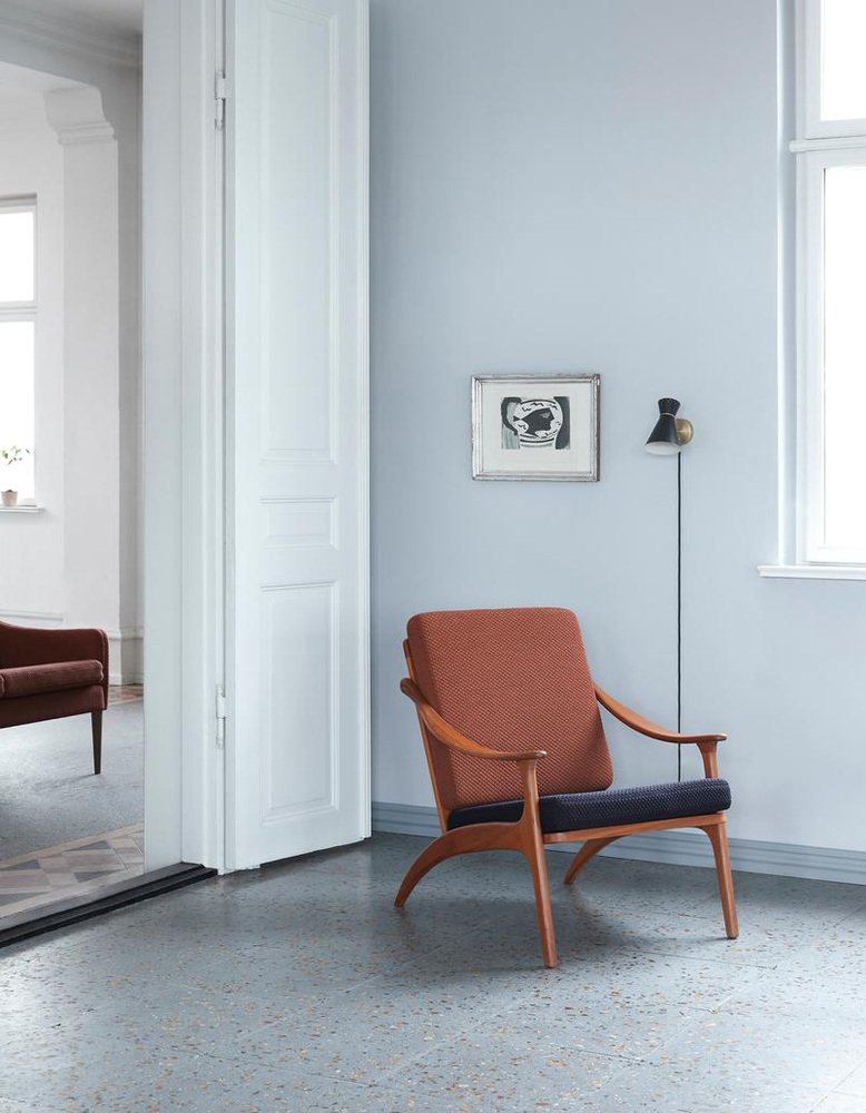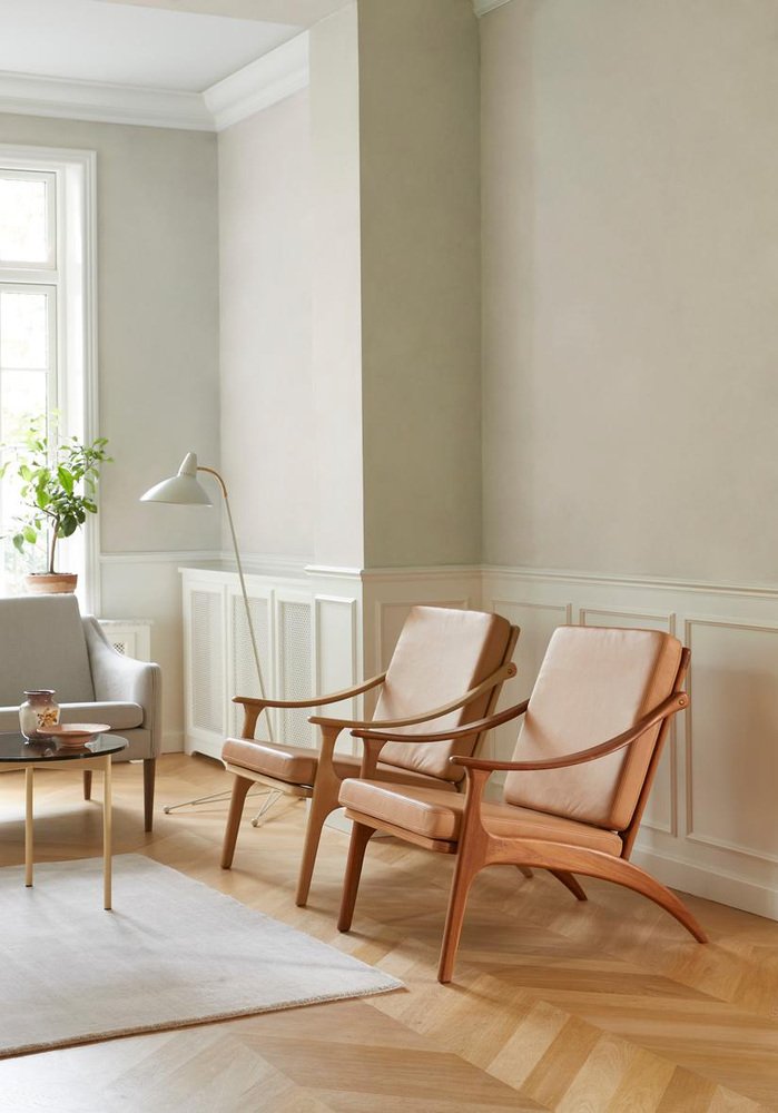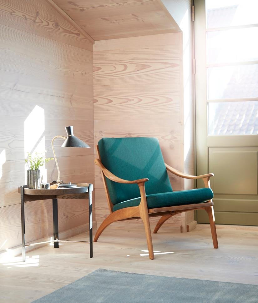 Lean back lounge chair Soavé teak nature by Warm Nordic Dimensions: D 68 x W 78 x H 78 cm Material: Solid teak, foam, leather Weight: 9 kg. Lean Back is an elegant, reclining lounge chair in 1950s design, created by the acclaimed Danish furniture designer, Arne Hovmand Olsen. Despite the lightness and an almost floating expression, the lounge chair is incredibly comfortable to sit in, perfect for long conversations around the coffee table or immersion in the world of books and magazines. The solid wood armrests are so elegantly designed that their soft sway could almost be mistaken for leather. What is particularly special about the design of the Lean Back lounge chair is that it looks beautiful from any angle, so it can stand freely in a room. The lounge chair comes with leather seat cushions for a totally classic look or upholstered seat cushions in canvas or velour for a more courageous look.