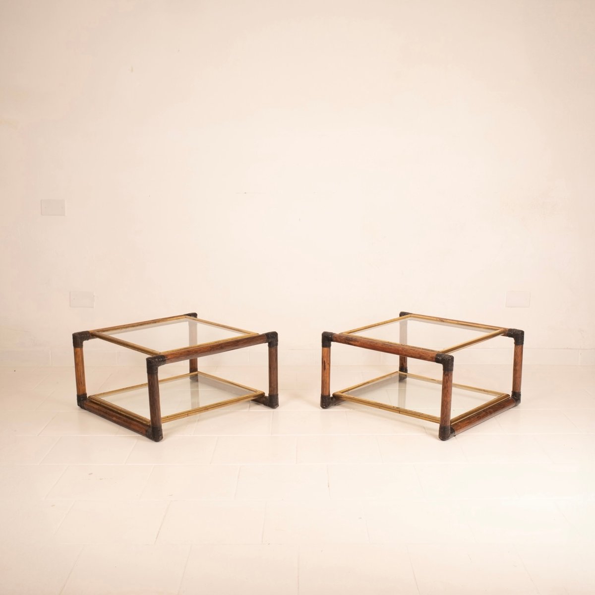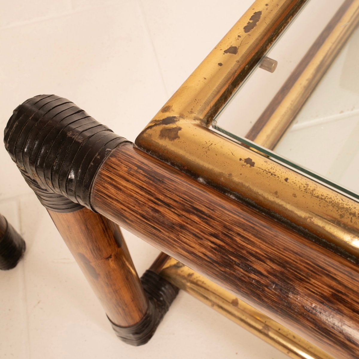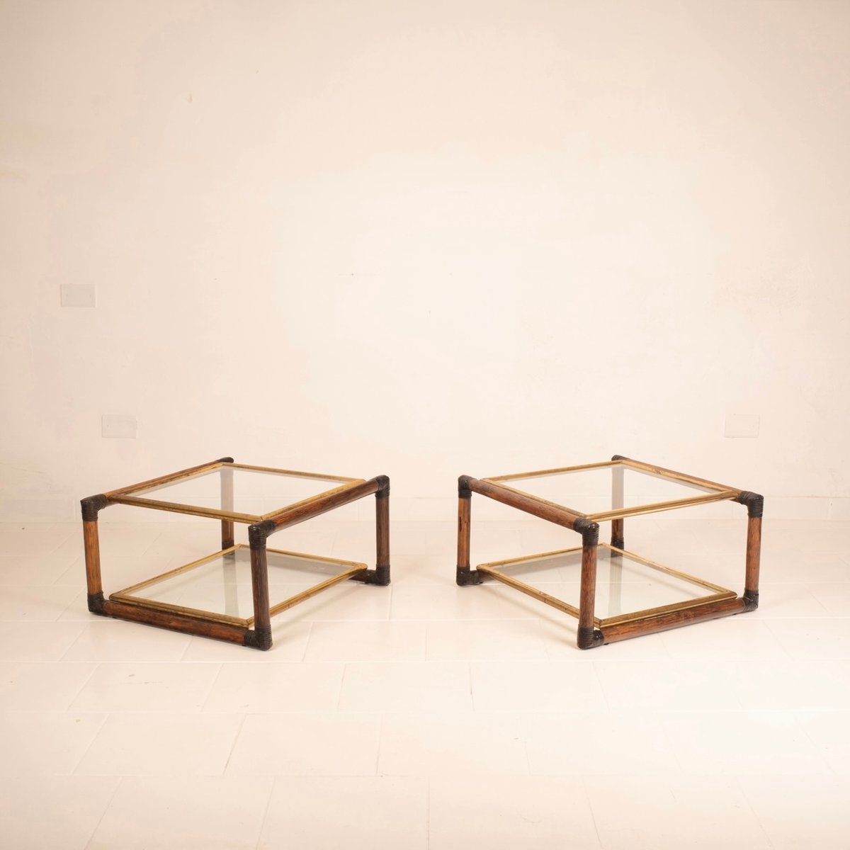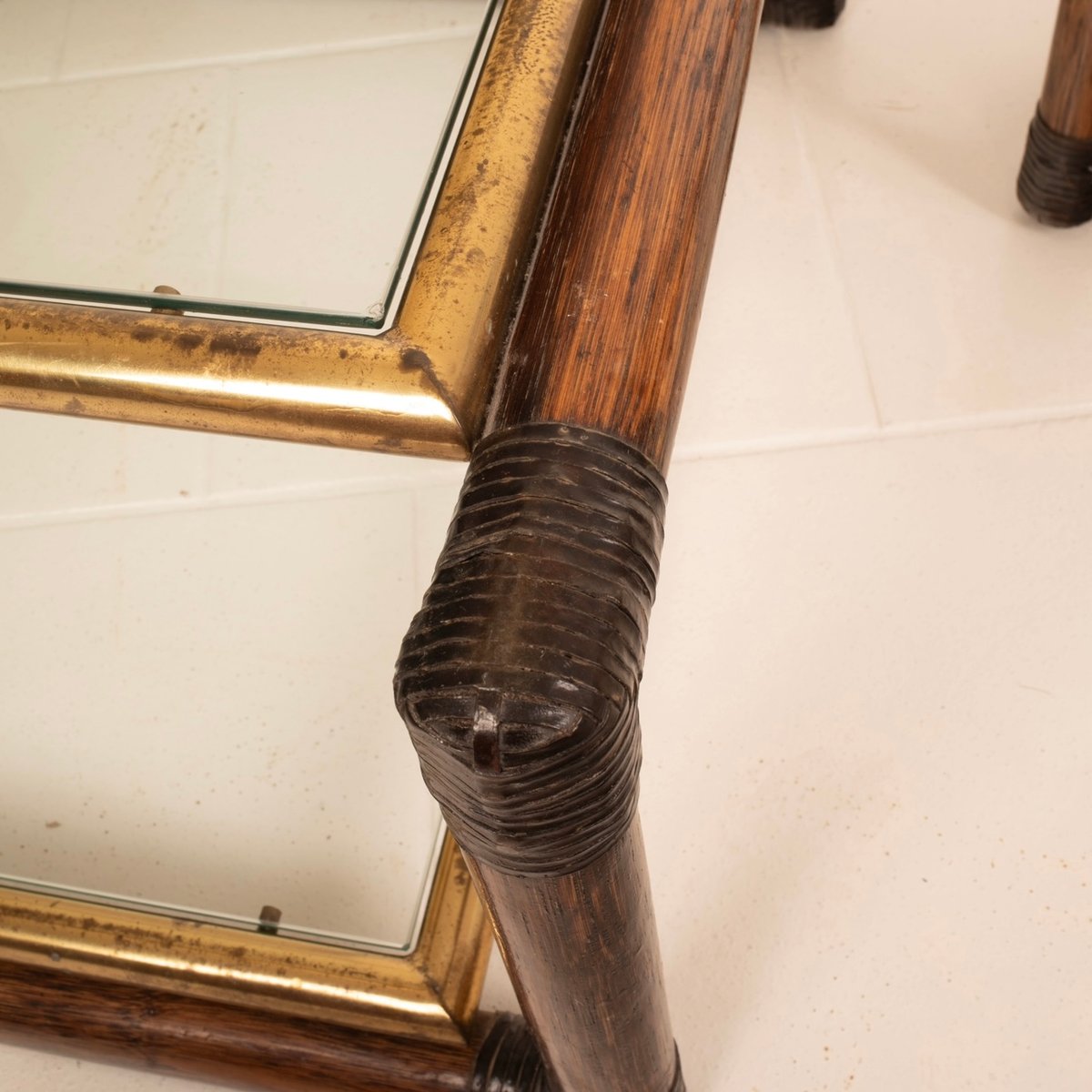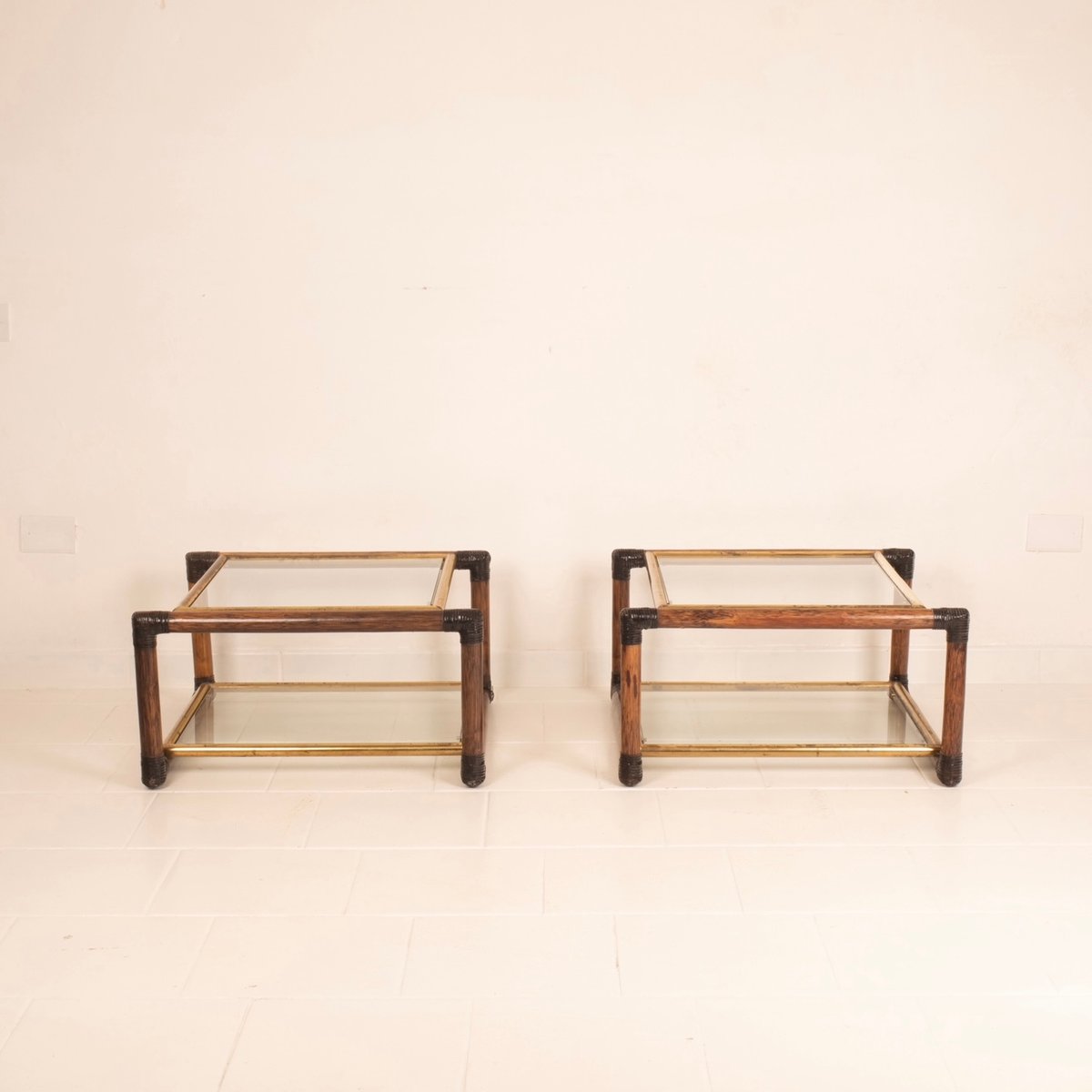 Die Nachttische enthalten und verkörpern die hohe italienische Meisterschaft und Handwerkskunst der Zeit mit erstaunlichen Details an den Ecken in Ledergeflecht, mit Messingprofilen und italienischem Schilfrohr.