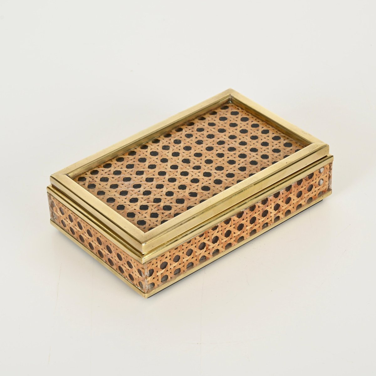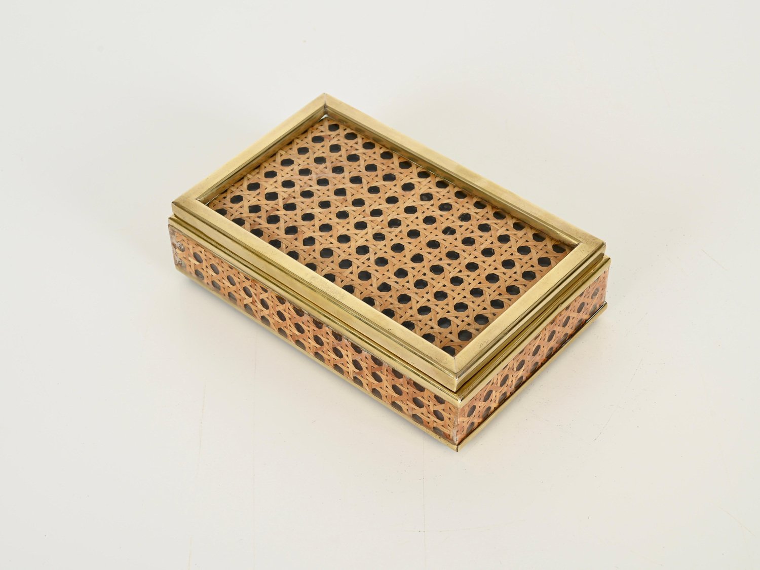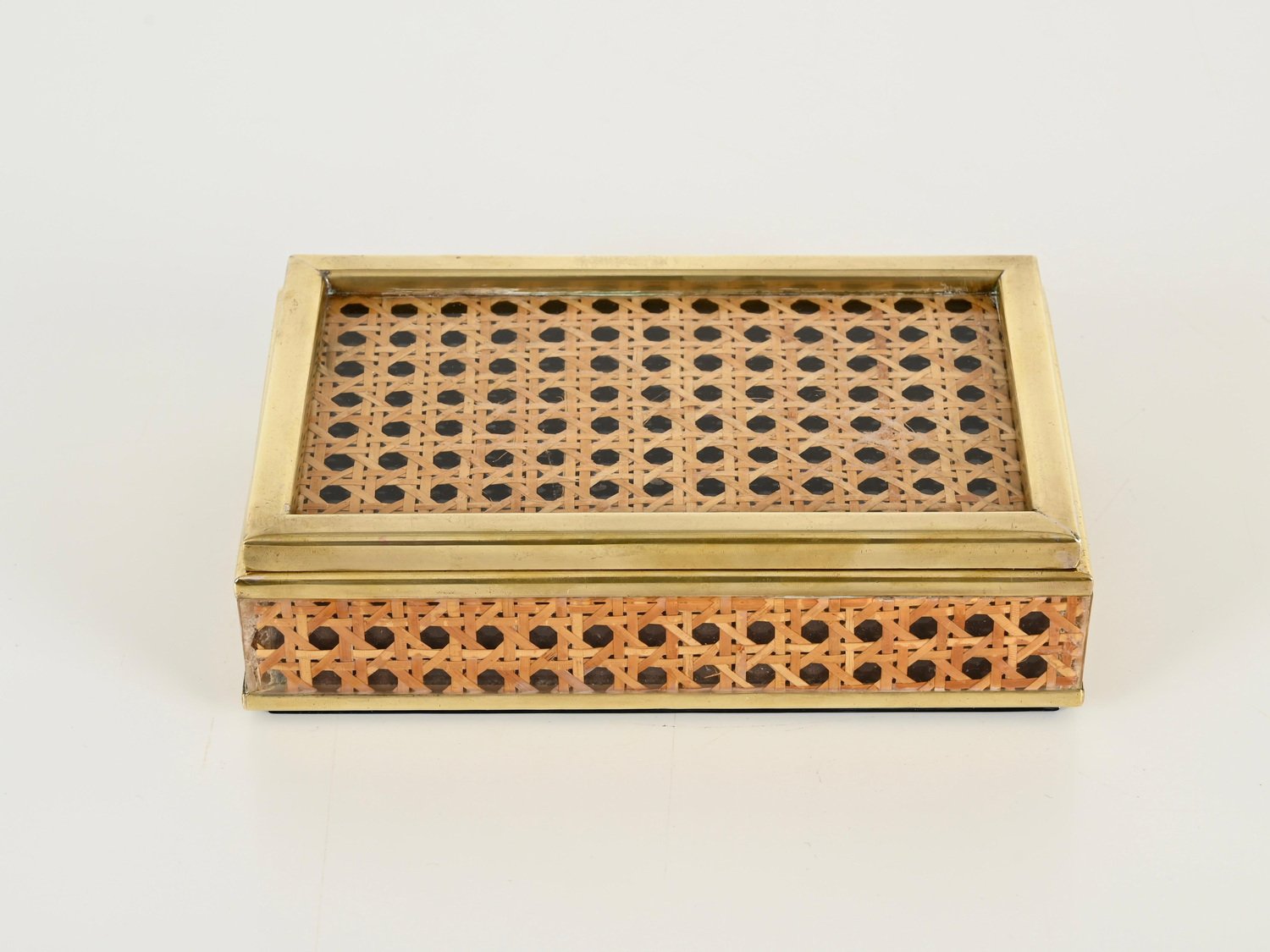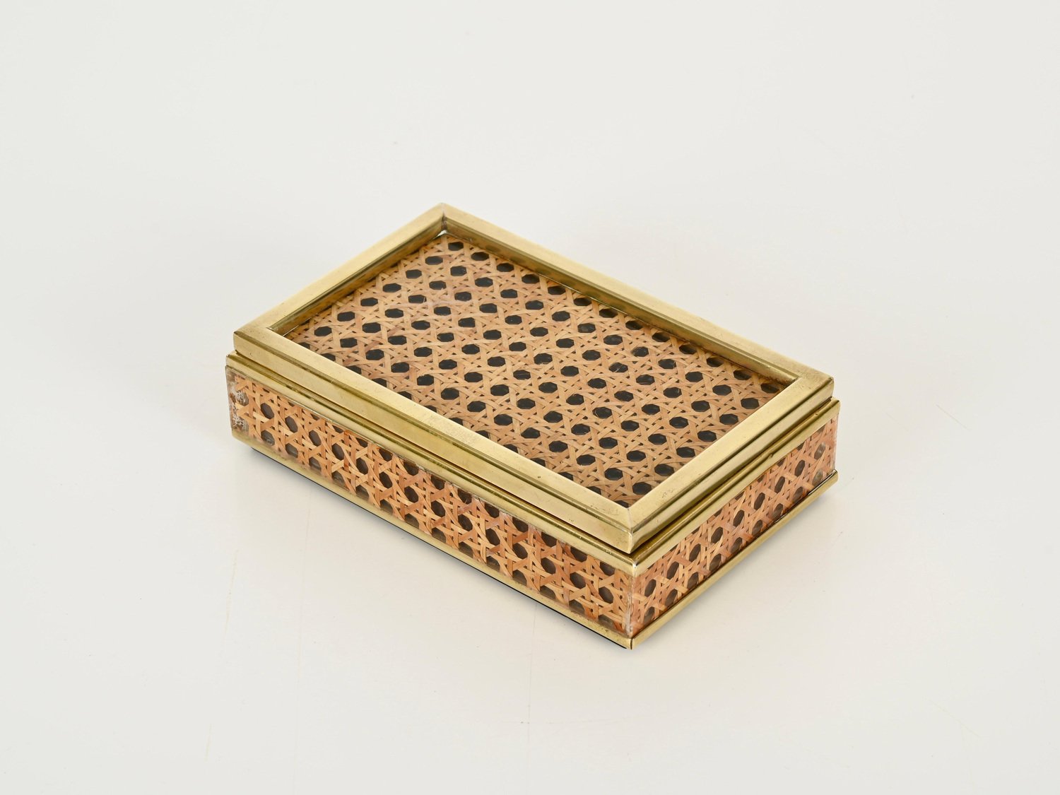 Mid-Century Dekorative Dose aus Messing, Acrylglas & Wiener Stroh von Christian Dior, Italien, 1970er