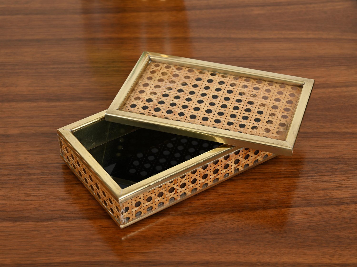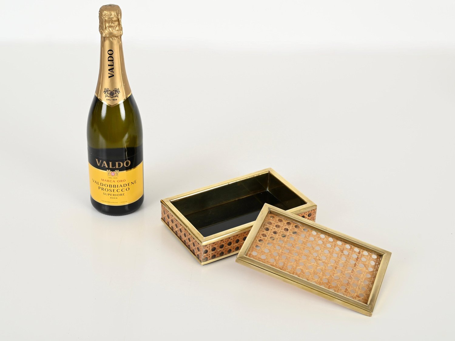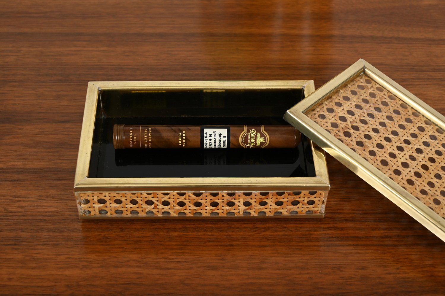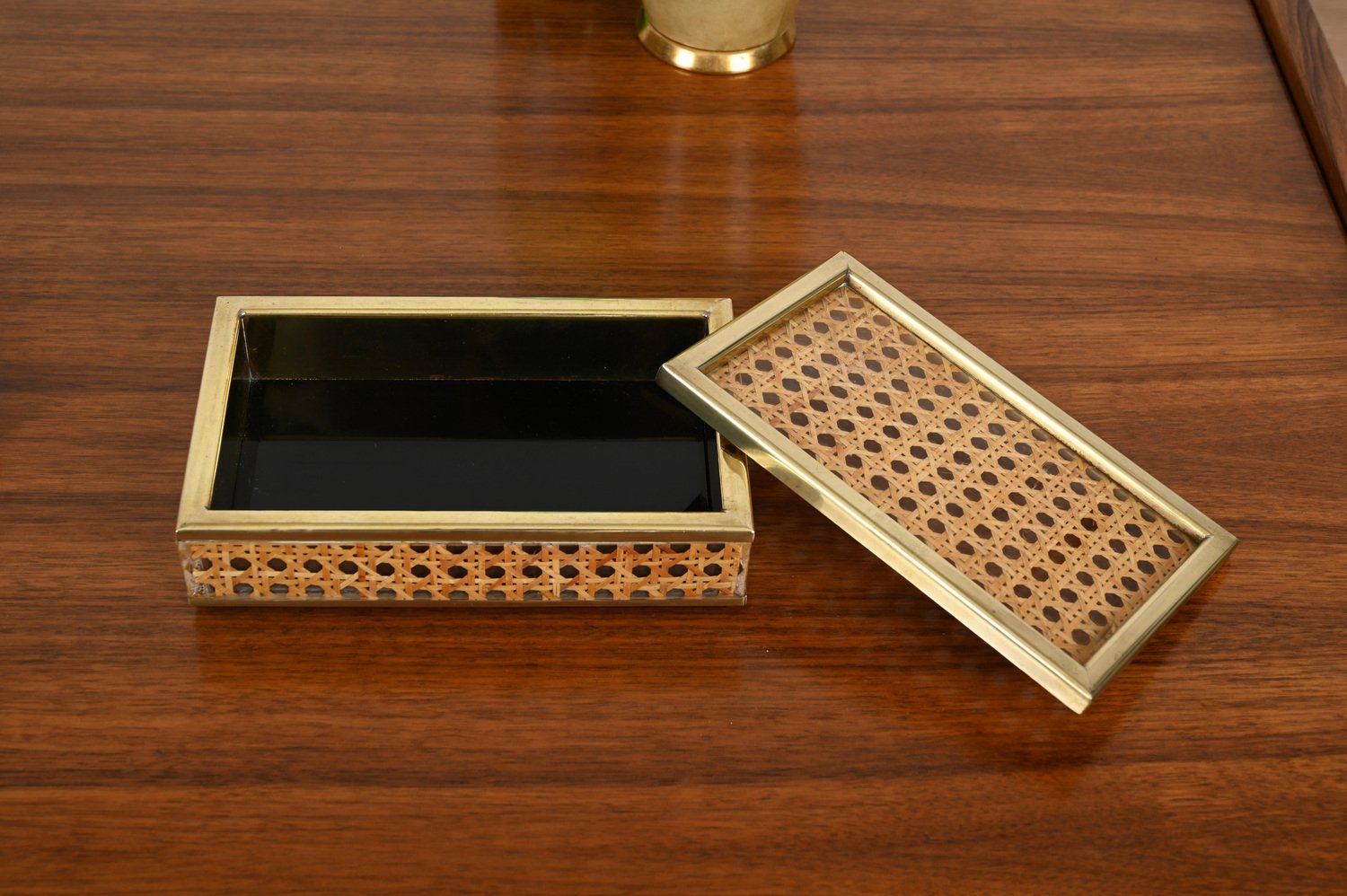 Mid-Century Dekorative Dose aus Messing, Acrylglas & Wiener Stroh von Christian Dior, Italien, 1970er