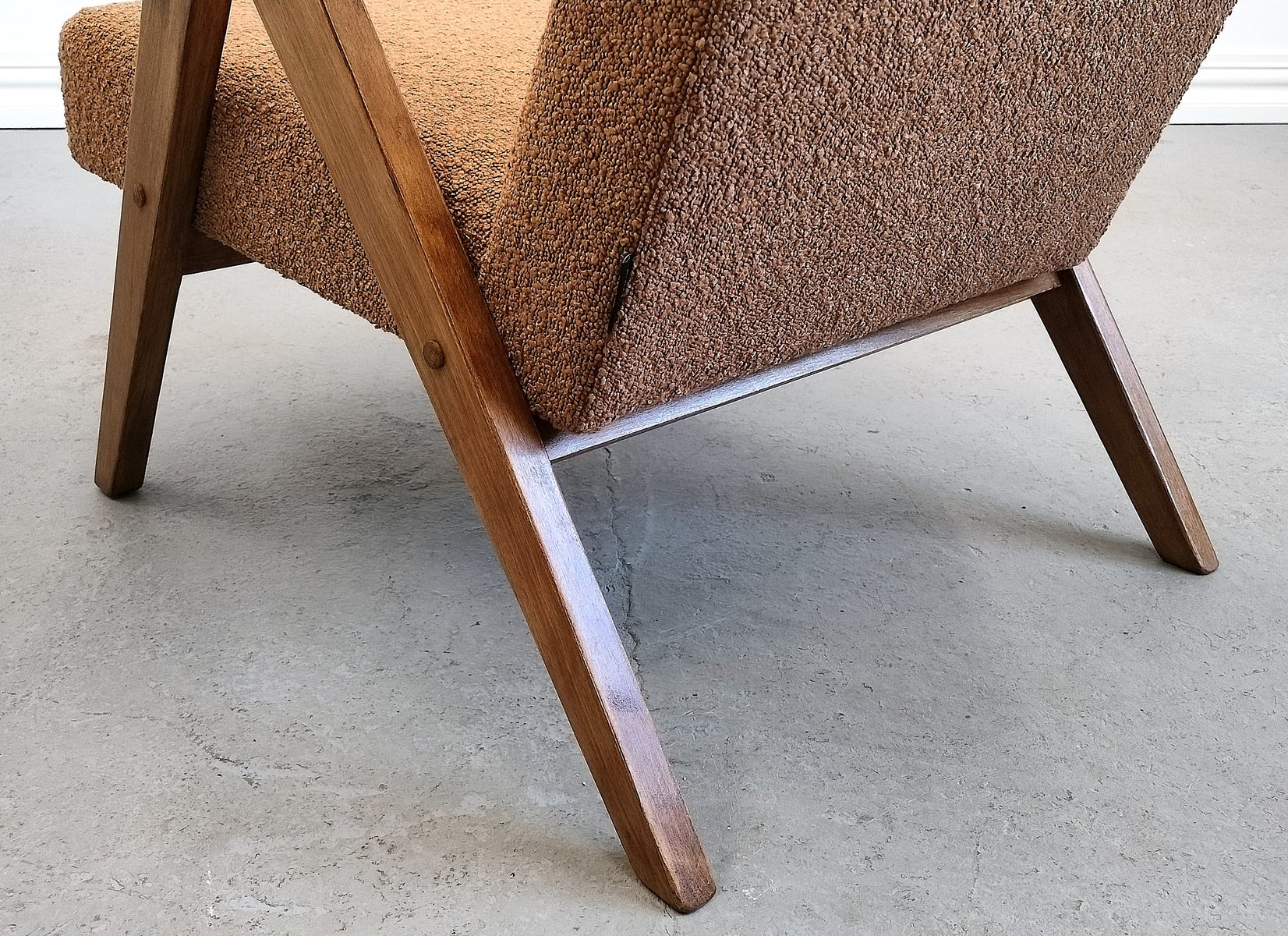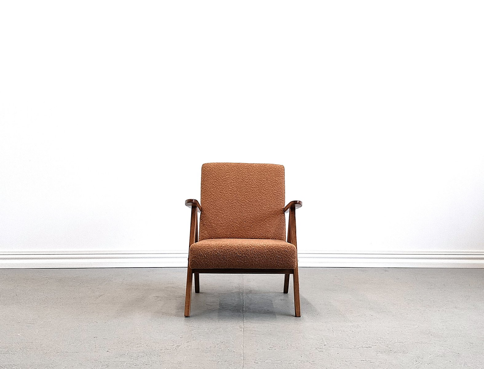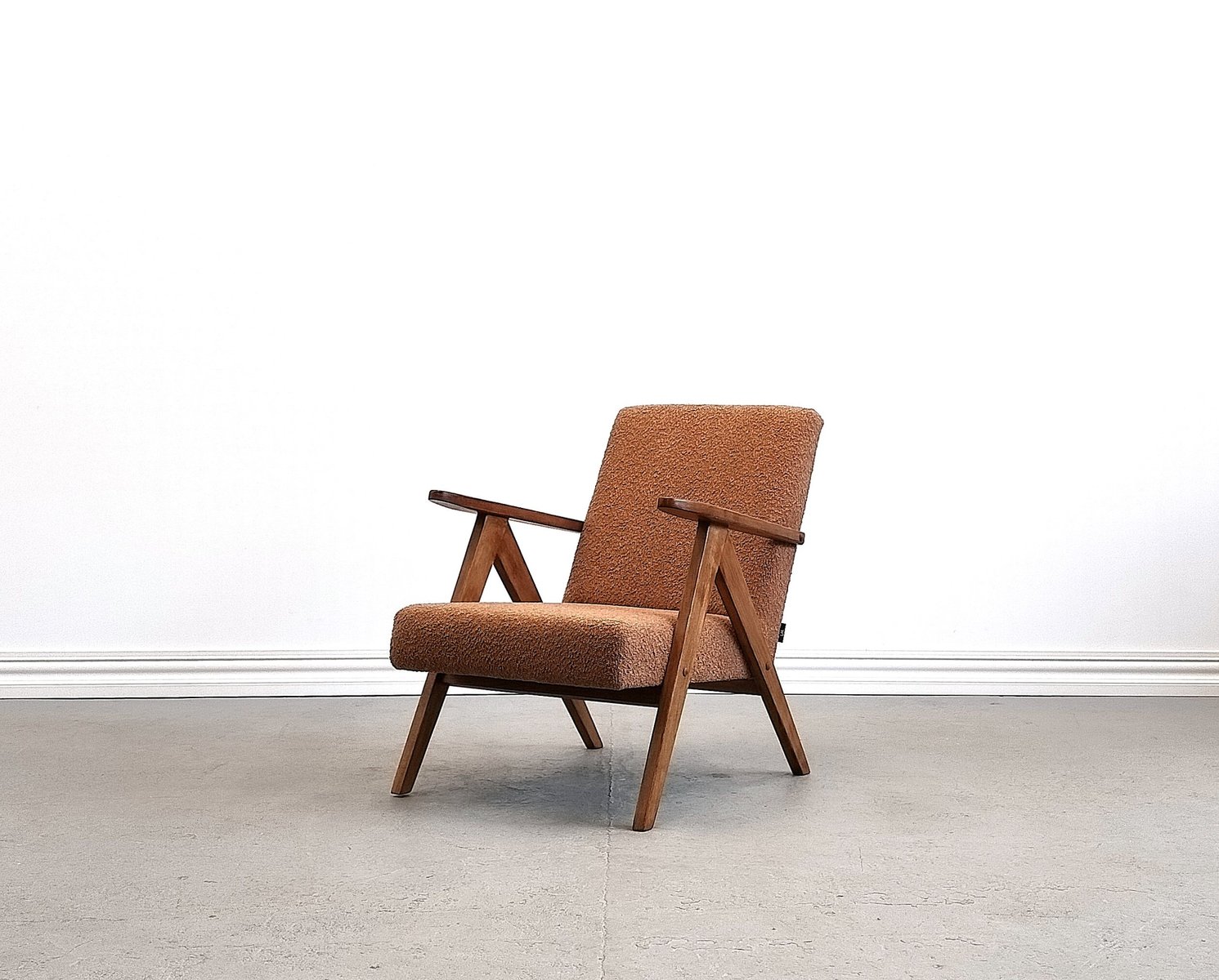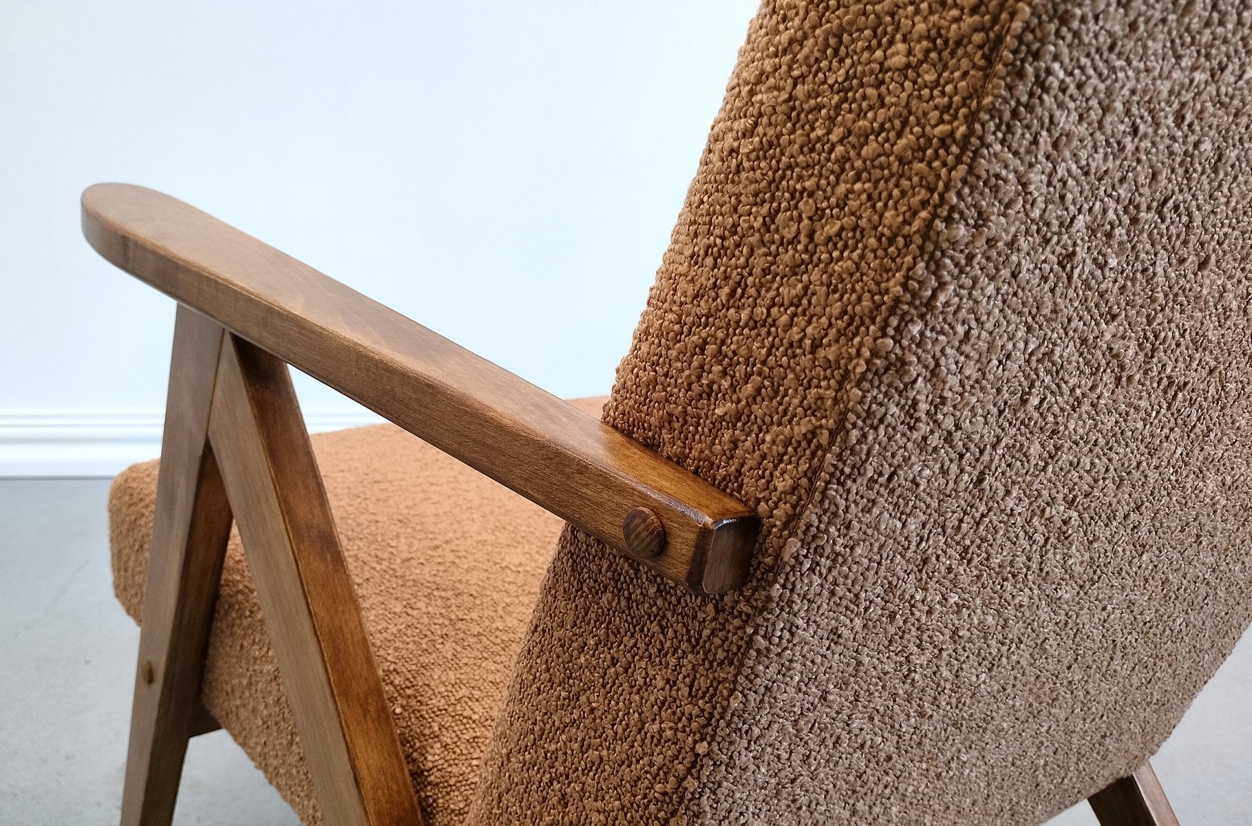 Dies ist ein sehr berühmter Stuhl, Modell B-310 VAR, der in den 60er Jahren in Polen hergestellt wurde. Diese Stühle wurden vor allem für den Export in andere Länder mit einer begrenzten Anzahl auf dem lokalen Markt zur Verfügung produziert. Der Stuhl wurde einer kompletten Restaurierung unterzogen. Er wurde zerlegt, das gesamte Innenleben wurde ersetzt, Schaumstoffe, Innenleinen, Stützgurte und neu gepolstert mit mokkafarbenem Boucle. Die Form wurde in jedem Detail originalgetreu beibehalten. Das Holz wurde geschliffen, gebeizt und mit Mattlack gesichert, wodurch eine schöne Patina zum Vorschein kommt. Der verwendete Stoff ist von hoher Qualität.