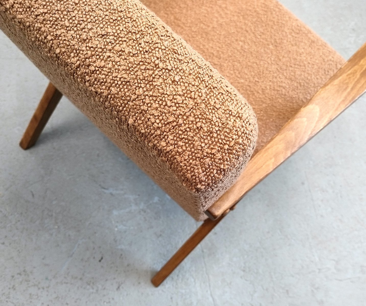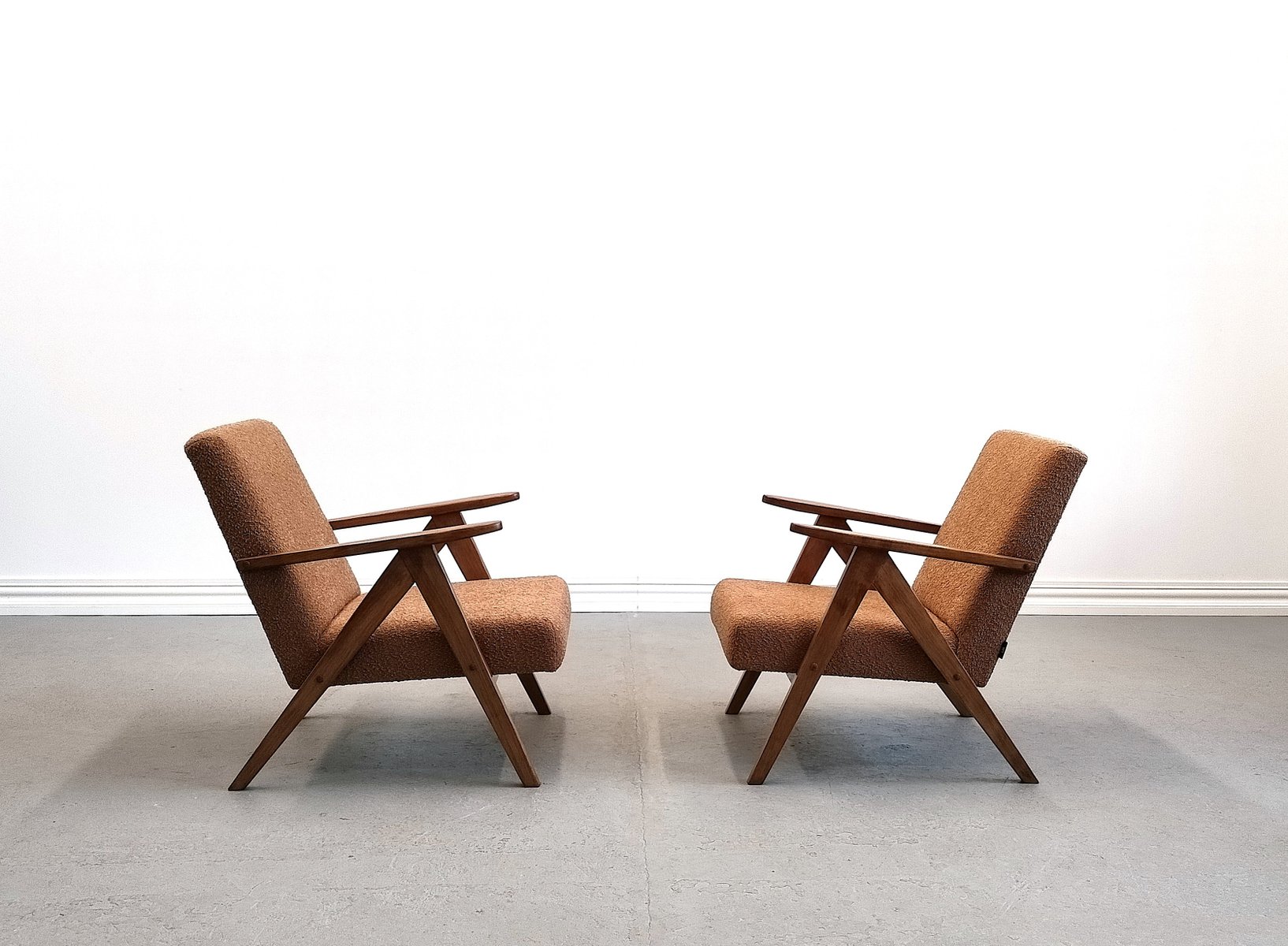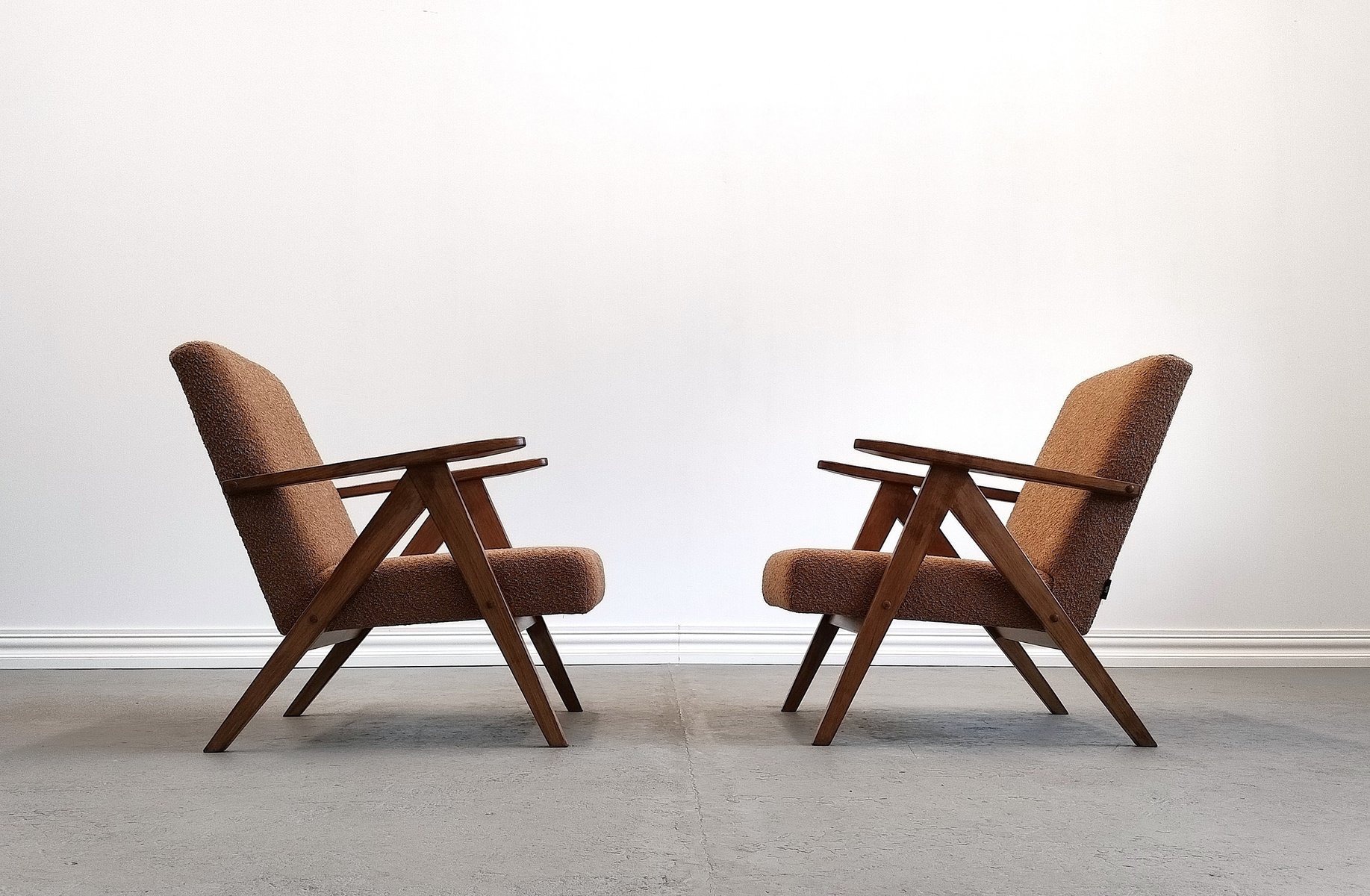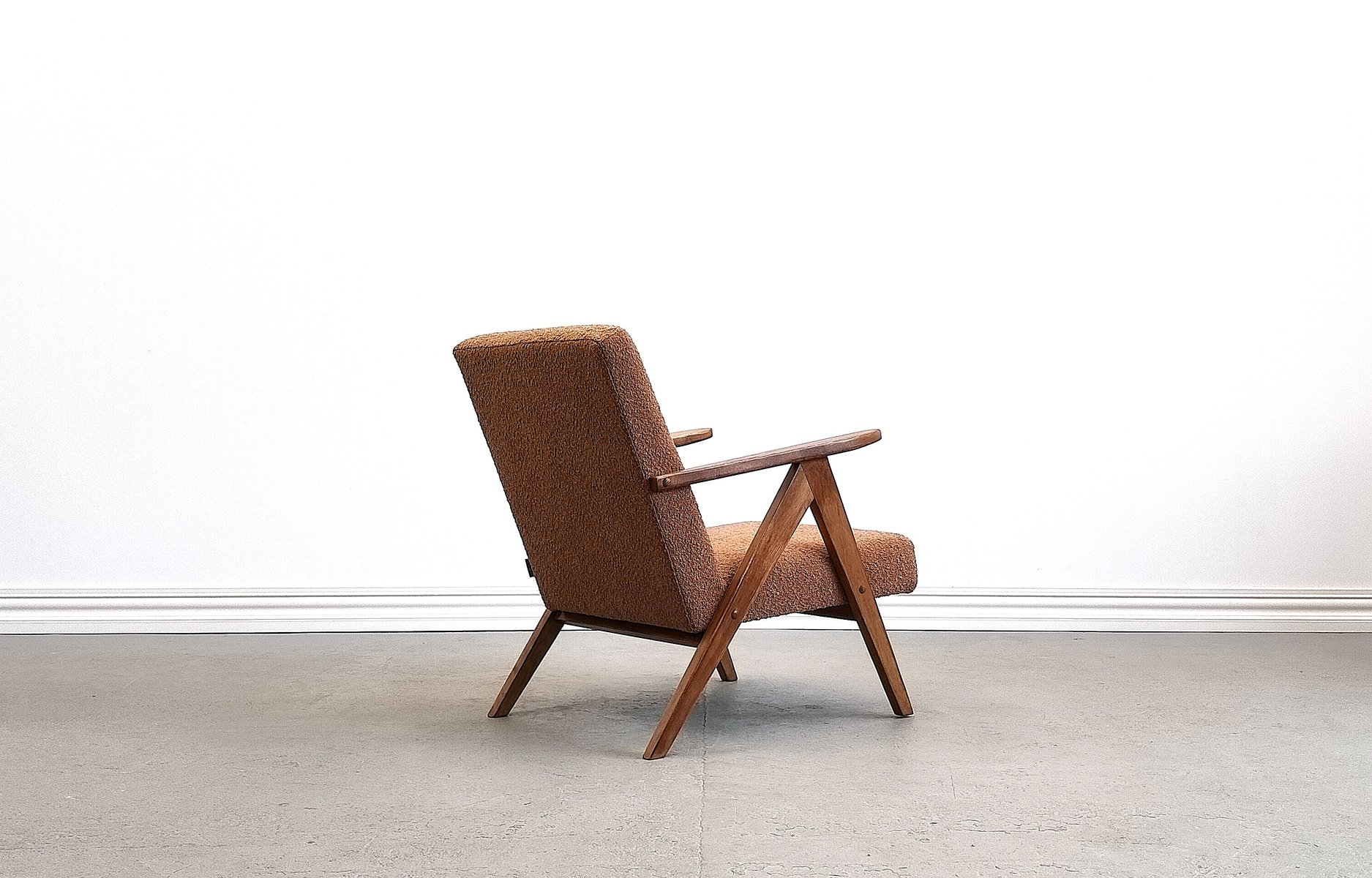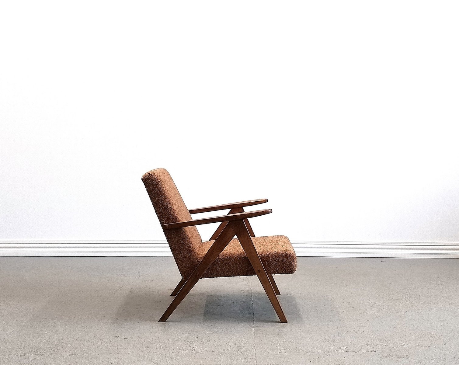 Dies ist ein sehr berühmter Stuhl, Modell B-310 VAR, der in den 60er Jahren in Polen hergestellt wurde. Diese Stühle wurden vor allem für den Export in andere Länder mit einer begrenzten Anzahl auf dem lokalen Markt zur Verfügung produziert. Der Stuhl wurde einer kompletten Restaurierung unterzogen. Er wurde zerlegt, das gesamte Innenleben wurde ersetzt, Schaumstoffe, Innenleinen, Stützgurte und neu gepolstert mit mokkafarbenem Boucle. Die Form wurde in jedem Detail originalgetreu beibehalten. Das Holz wurde geschliffen, gebeizt und mit Mattlack gesichert, wodurch eine schöne Patina zum Vorschein kommt. Der verwendete Stoff ist von hoher Qualität.