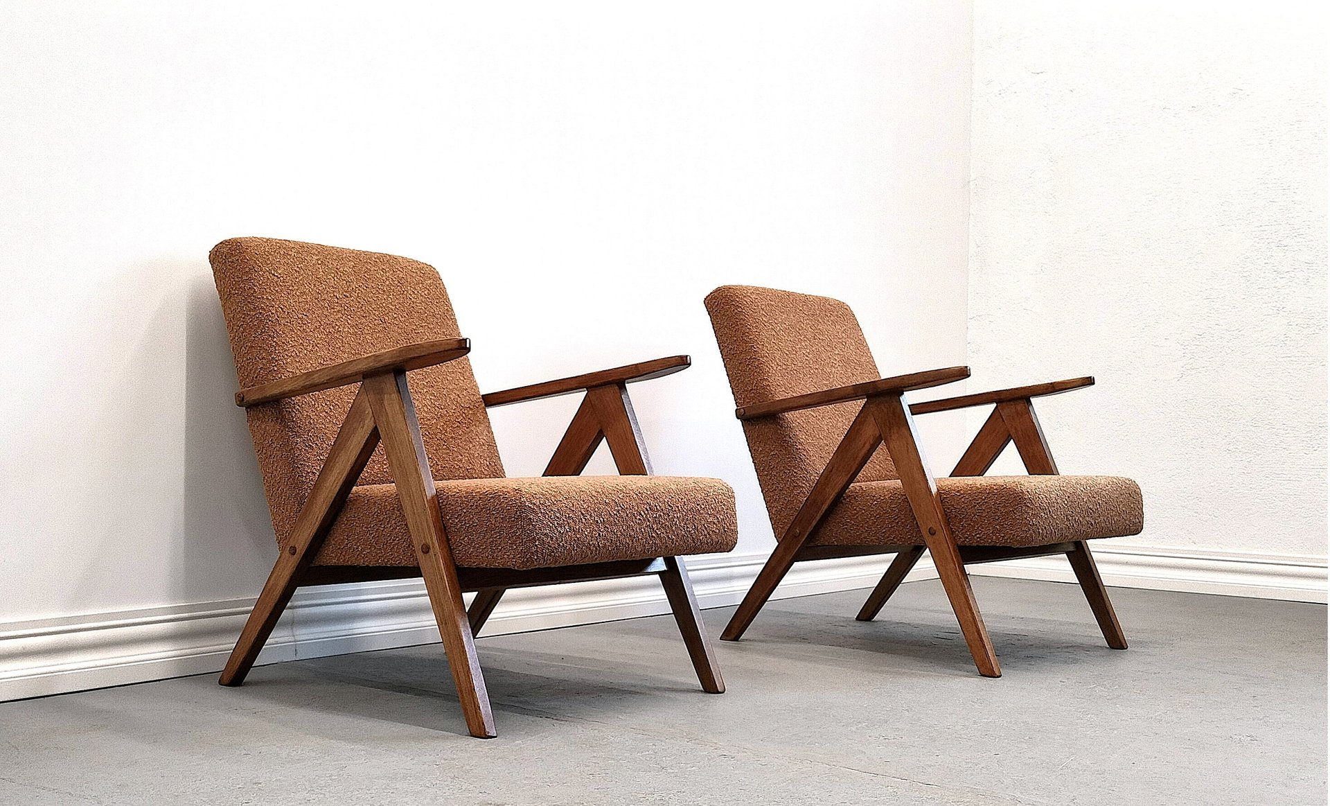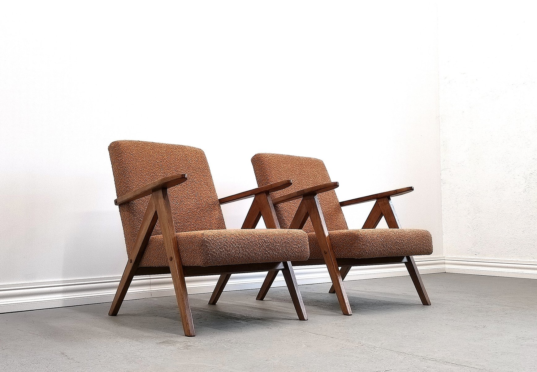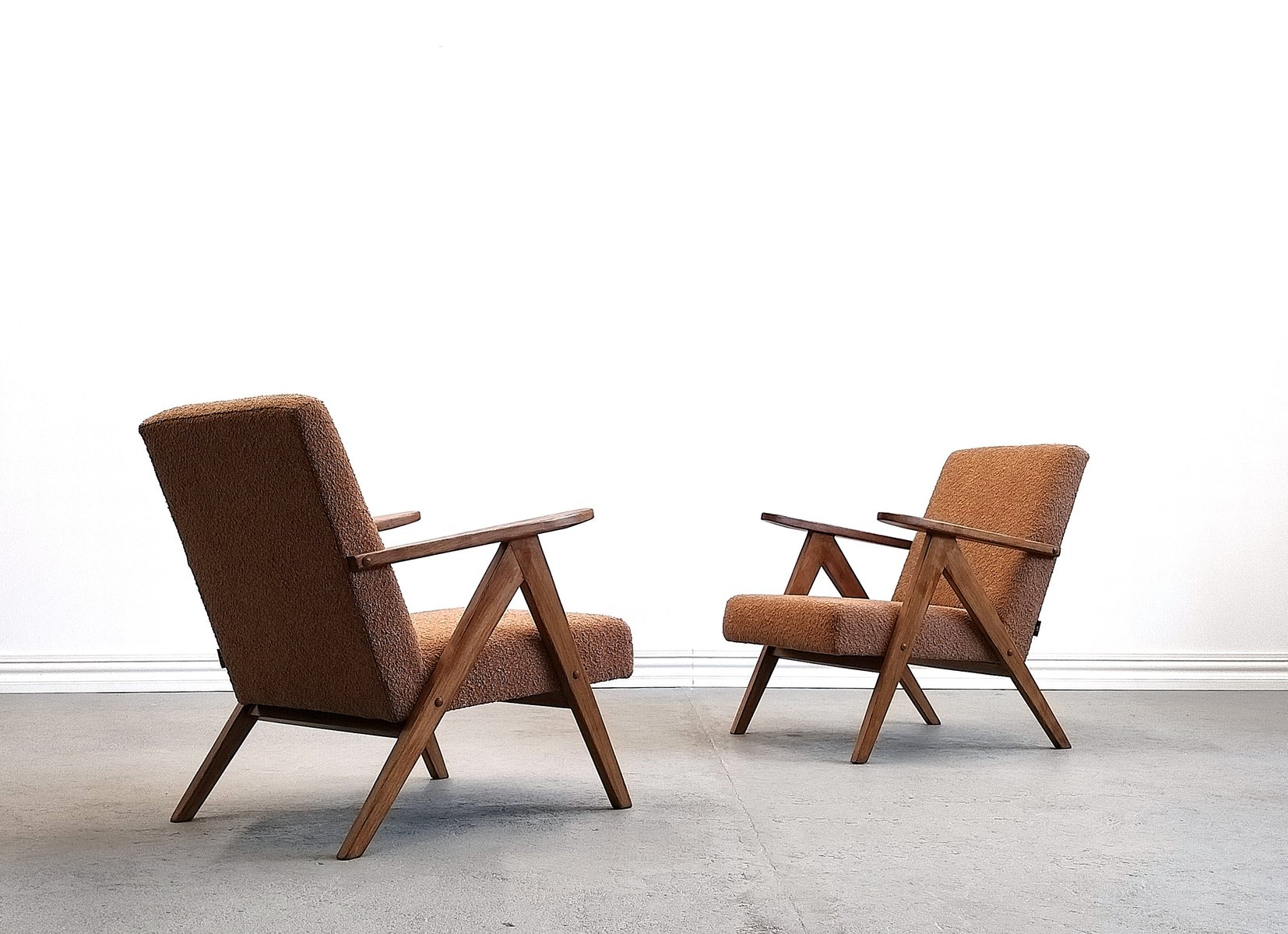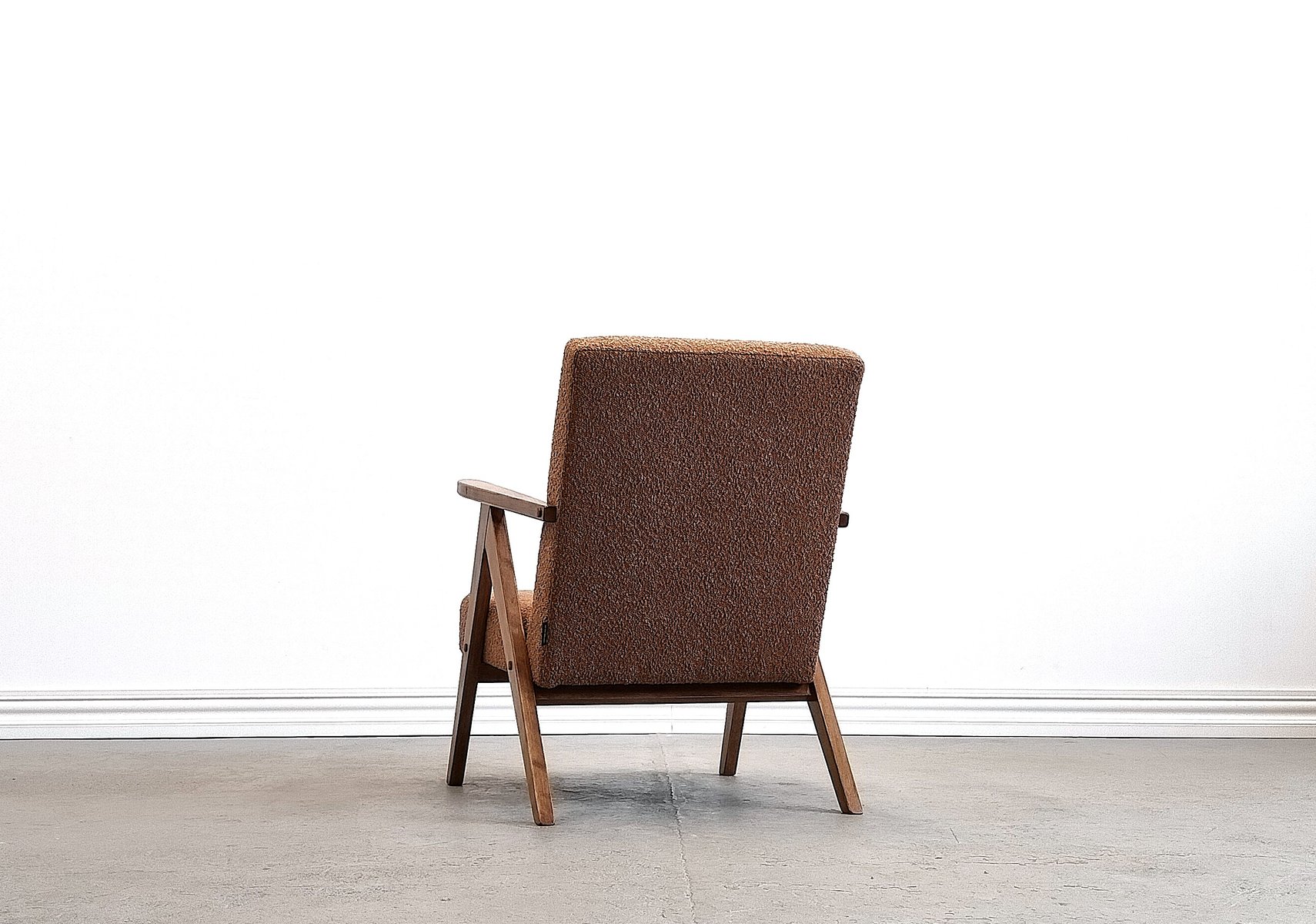 Dies ist ein sehr berühmter Stuhl, Modell B-310 VAR, der in den 60er Jahren in Polen hergestellt wurde. Diese Stühle wurden vor allem für den Export in andere Länder mit einer begrenzten Anzahl auf dem lokalen Markt zur Verfügung produziert. Der Stuhl wurde einer kompletten Restaurierung unterzogen. Er wurde zerlegt, das gesamte Innenleben wurde ersetzt, Schaumstoffe, Innenleinen, Stützgurte und neu gepolstert mit mokkafarbenem Boucle. Die Form wurde in jedem Detail originalgetreu beibehalten. Das Holz wurde geschliffen, gebeizt und mit Mattlack gesichert, wodurch eine schöne Patina zum Vorschein kommt. Der verwendete Stoff ist von hoher Qualität.