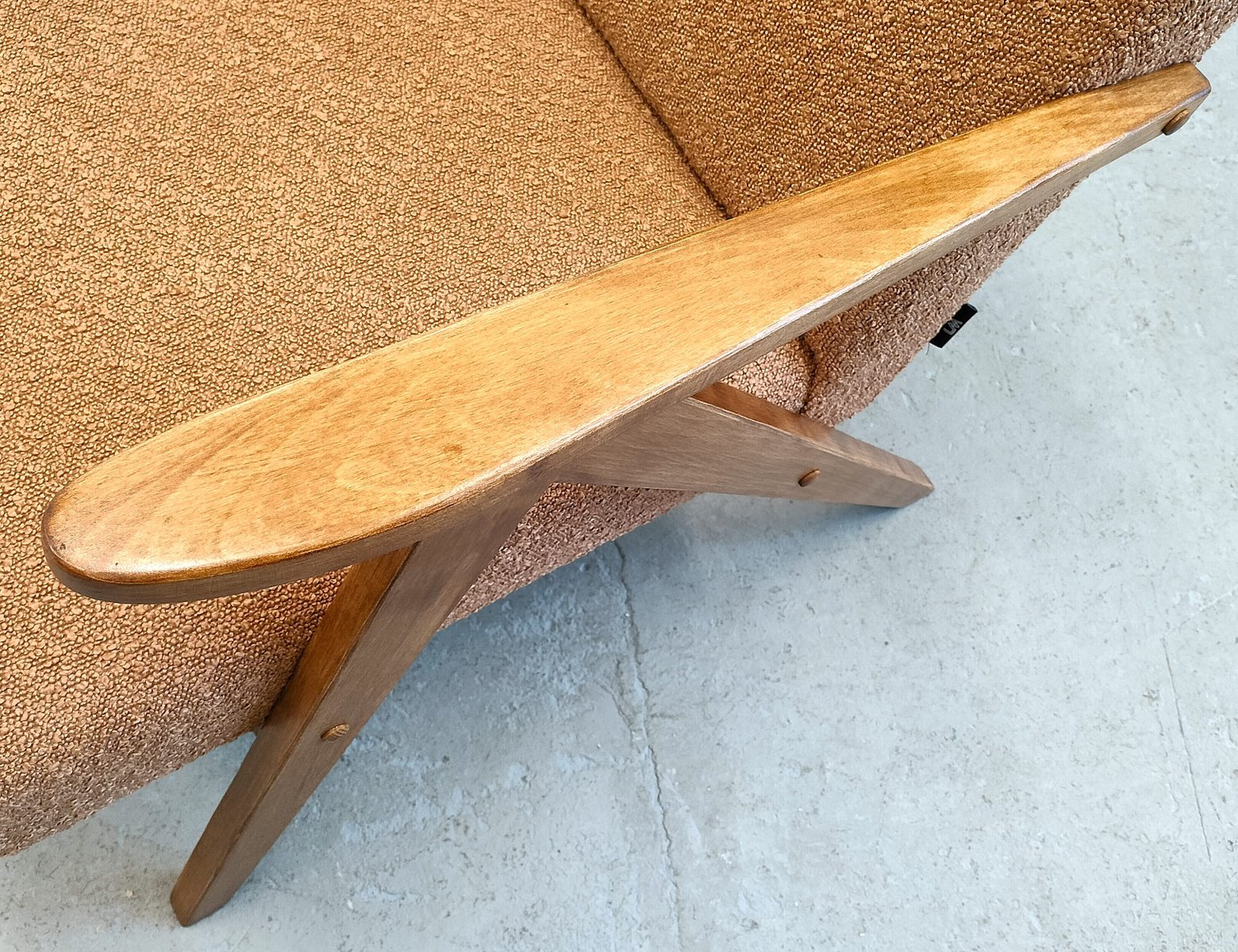 This is a very famous chair, model B-310 VAR, that was manufactured in the 60's in Poland. These chairs were produced mainly for export to other countries with a limited number available to local market. The chair has undergone a complete restoration process. It has been stripped down, all the insides were replaced, foams, inner linen, support belts and re upholstered in mocha boucle. The shape has been kept in every detail as original. Wood has been sanded, stained and secured with matt varnish exposing beautiful patina. Fabric used is of high quality.