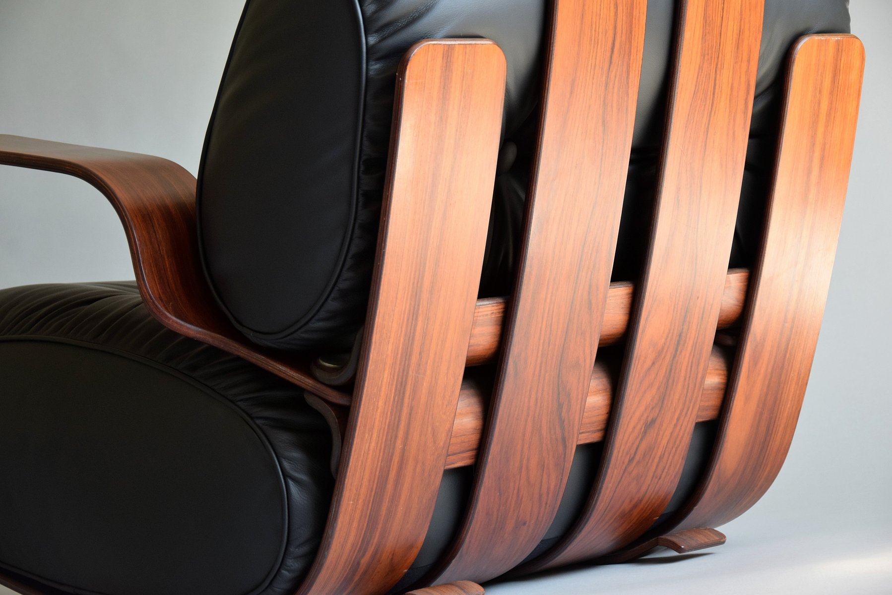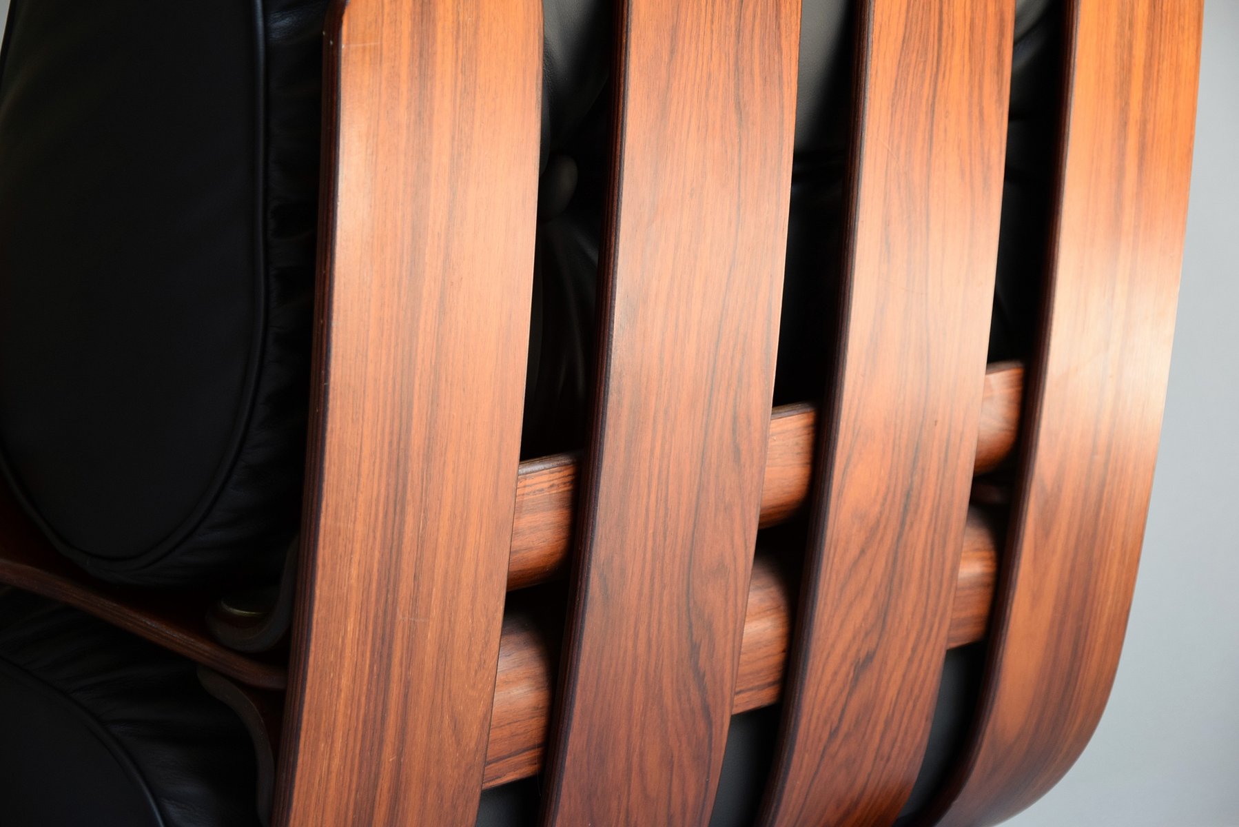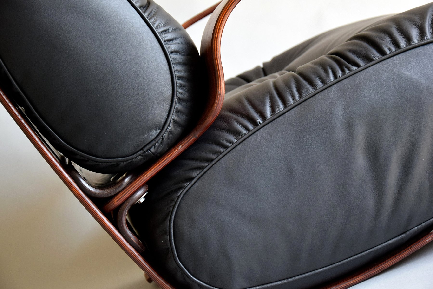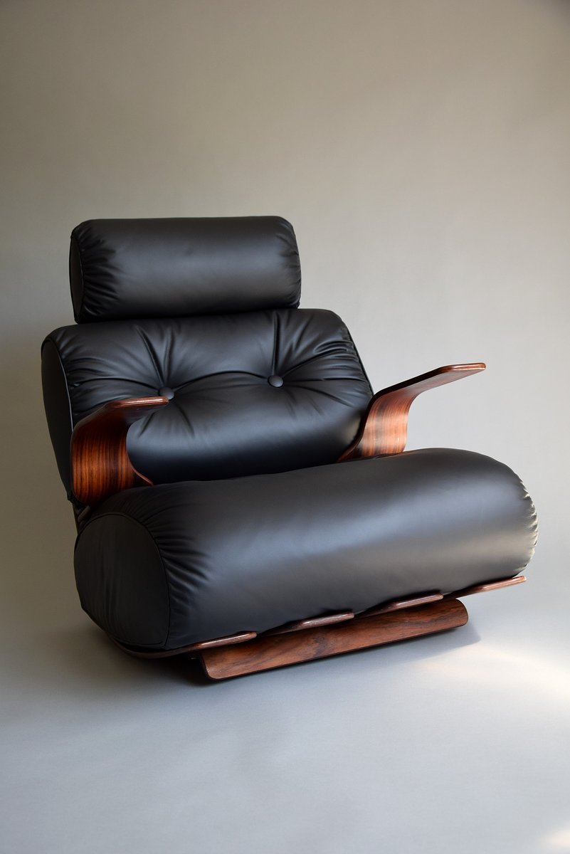 1. Exquisite Handwerkskunst: Das Gestell ist aus strapazierfähigem Sperrholz mit einer reichen Jatoba-Furnieroberfläche gefertigt, die die Wärme und natürliche Schönheit von edlem Holz zelebriert. Seine geschwungene Struktur strahlt Raffinesse und Kunstfertigkeit aus und erinnert an Ikonen aus der Mitte des Jahrhunderts wie den Eames Lounge Chair.