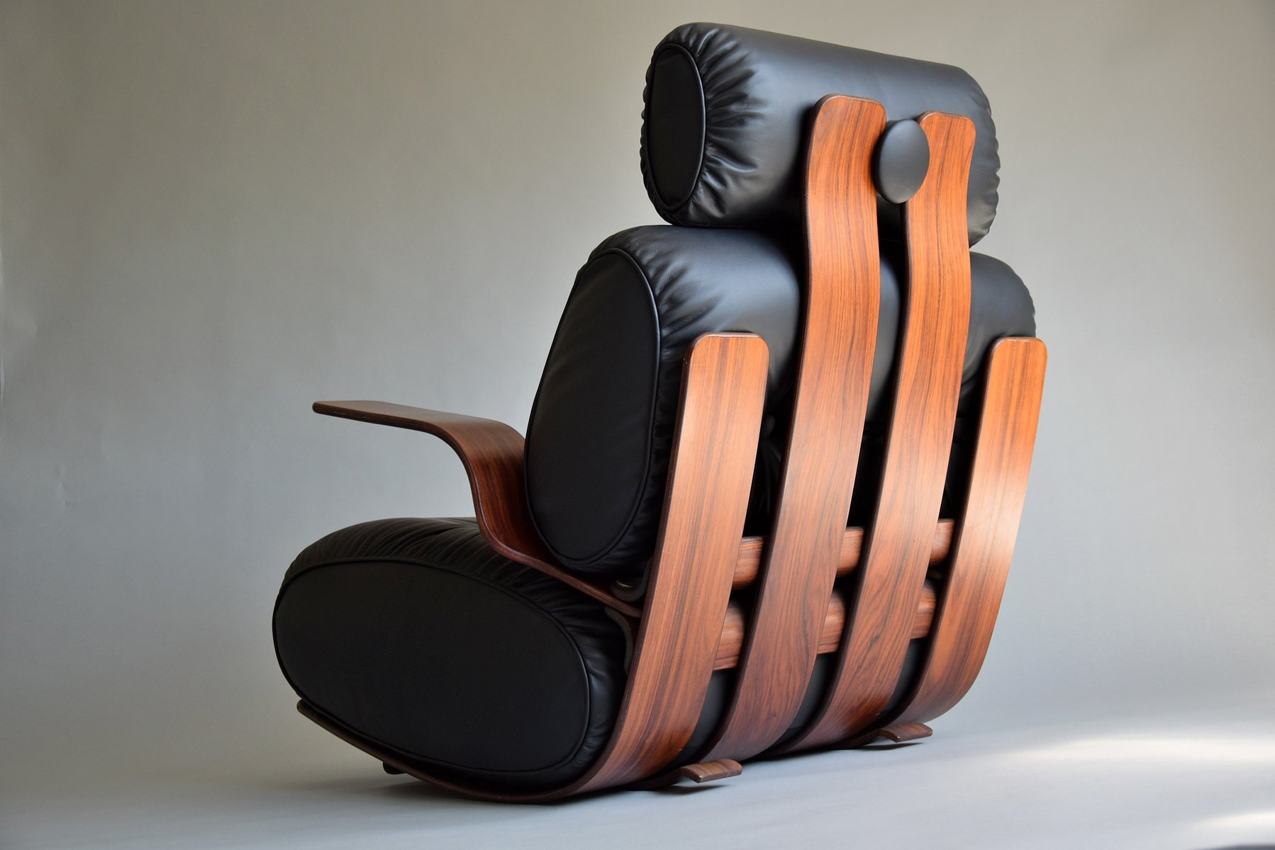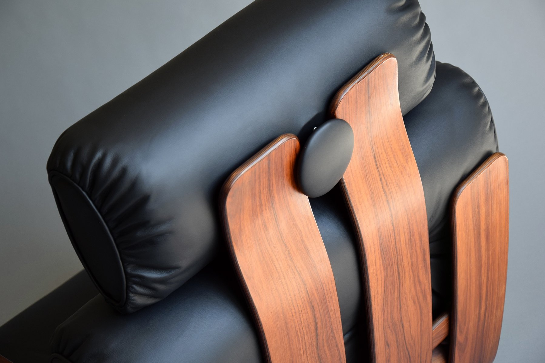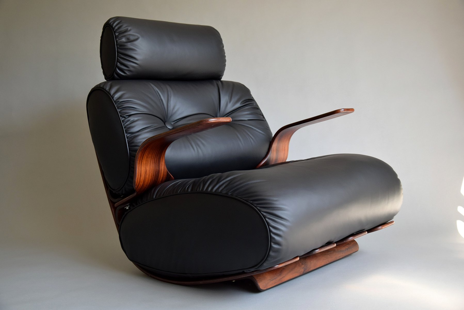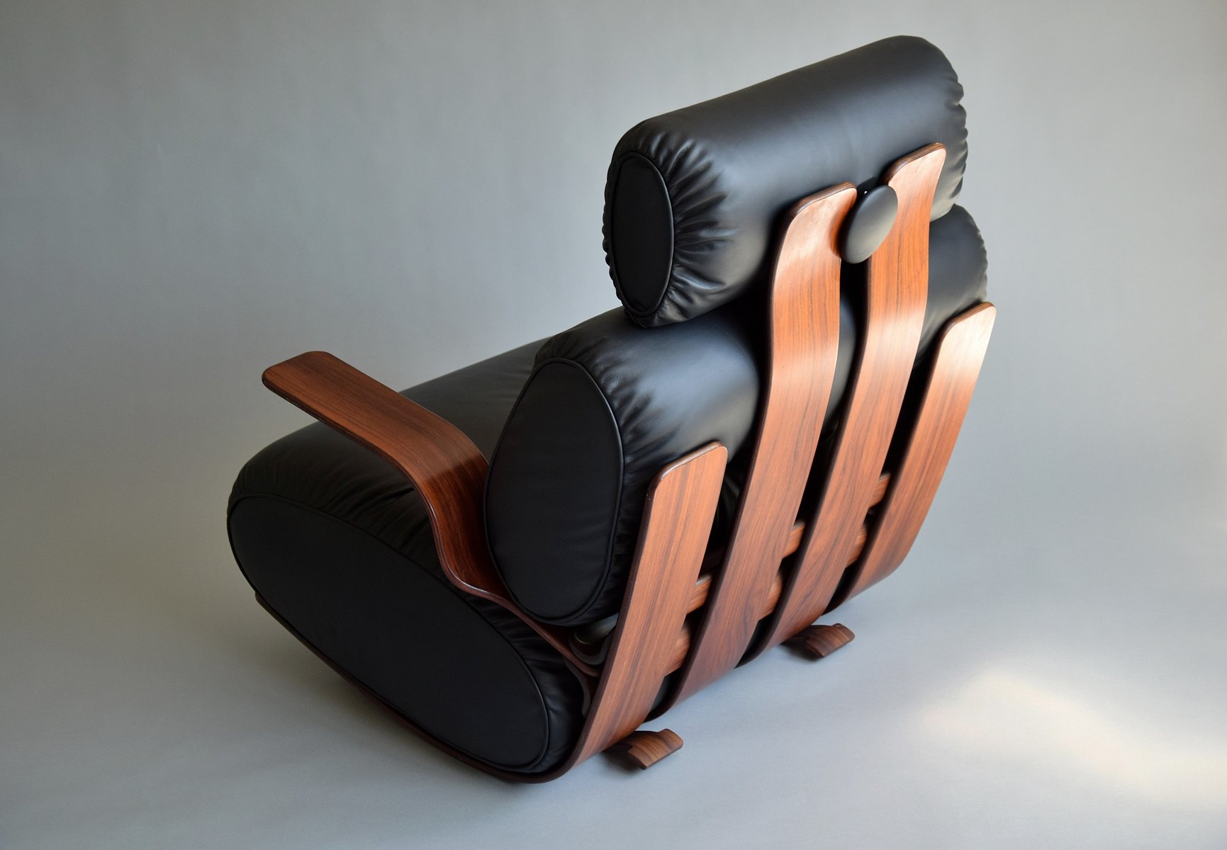1. Exquisite Handwerkskunst: Das Gestell ist aus strapazierfähigem Sperrholz mit einer reichen Jatoba-Furnieroberfläche gefertigt, die die Wärme und natürliche Schönheit von edlem Holz zelebriert. Seine geschwungene Struktur strahlt Raffinesse und Kunstfertigkeit aus und erinnert an Ikonen aus der Mitte des Jahrhunderts wie den Eames Lounge Chair.