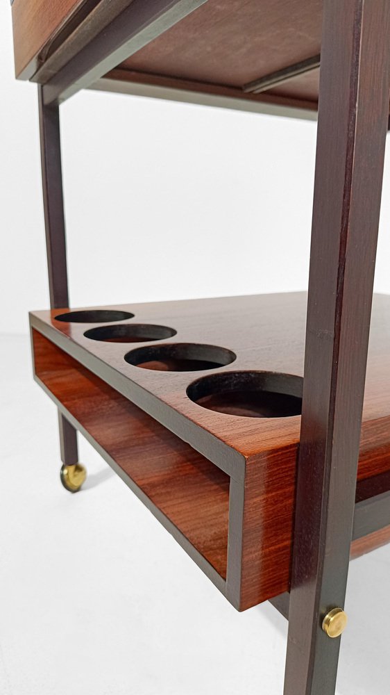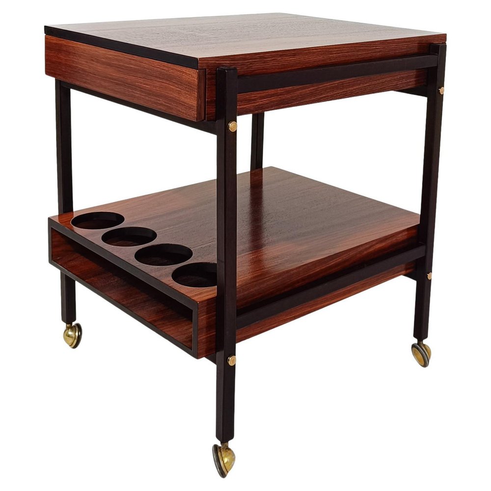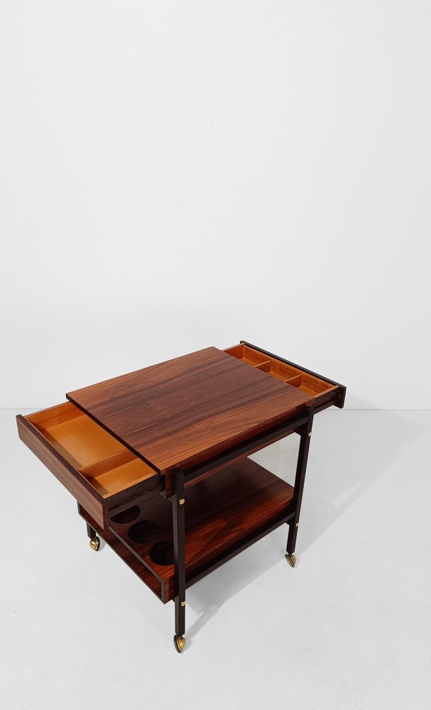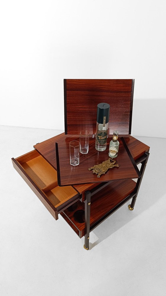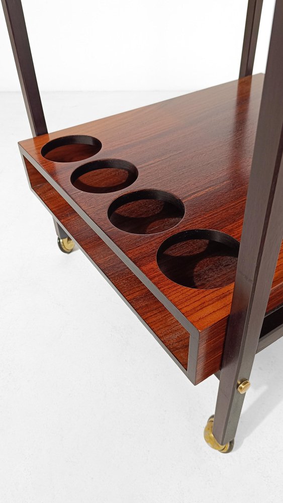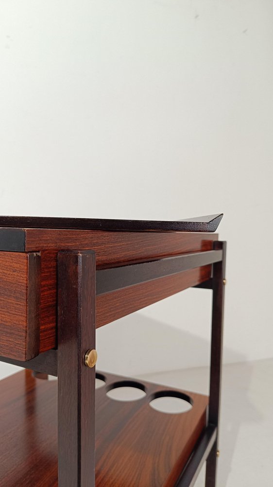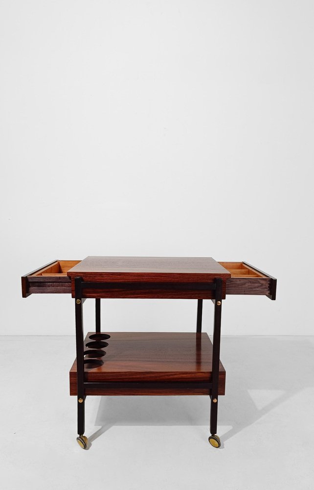 Mid Century Modern bar cart. Most likely made in Italy between the 60s and 70s, it is characterized by a rational and functionalist design that harks back to the Scandinavian design of the mid-20th century modern. The square and minimalist structure contains everything you could wish for in a service cart. Designed on two levels, it hides in the first shelf two large drawers for cutlery or napkins that are a masterpiece of carpentry. Both drawers are entirely made of solid oak with the "dovetail technique", equipped with comfortable dividers entirely, they have in the lower part of the comfortable handles engraved in the wood, with an aerodynamic shape. The second shelf is no less than the first, it has 4 comfortable circular spaces to hold your favorite bottles of spirits, and 2 large trays that can be removed from the opposite end of the top, to serve them with style and elegance at the table. Whether you want to use it as a clean-lined side table, a bar cabinet or a decorative stand, it can be used in various ways without ever stealing the scene from the objects it houses. A true daily companion, as discreet as it is elegant. This vintage bar cart has undergone a conservative restoration by a professional; thoroughly cleaned and polished with a specific product that enhances and preserves the precious rosewood veneer, it shows minimal signs of use and time.