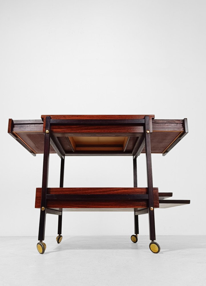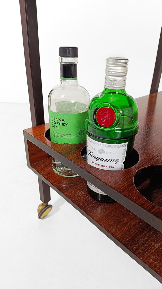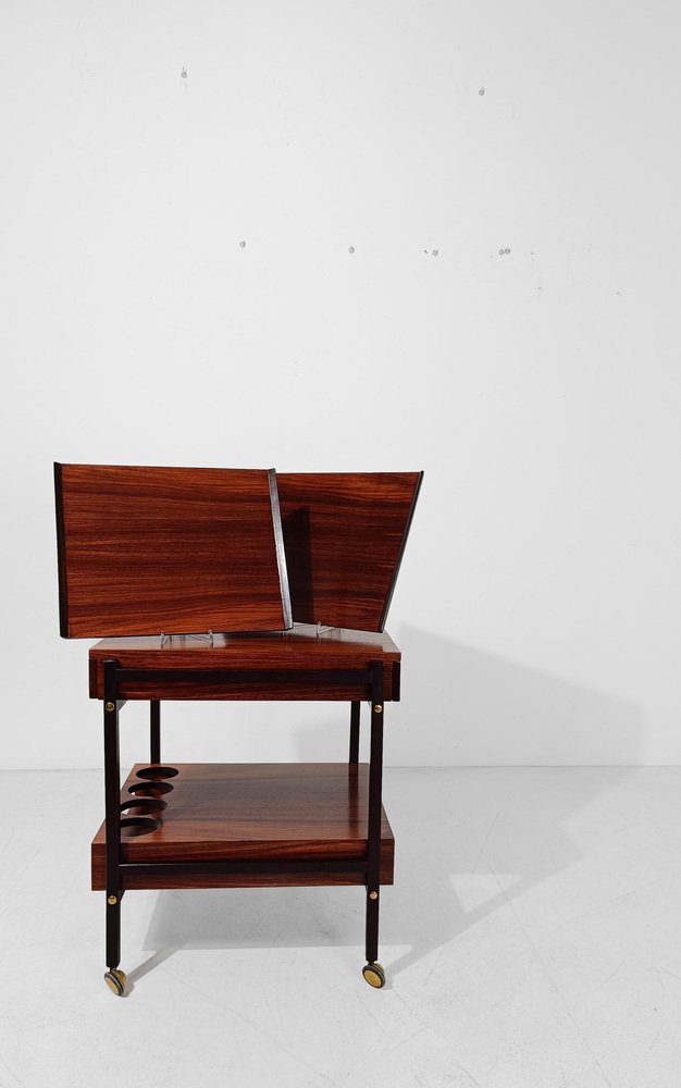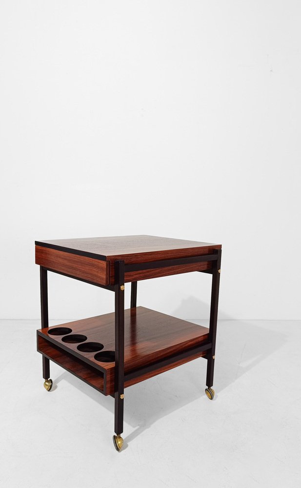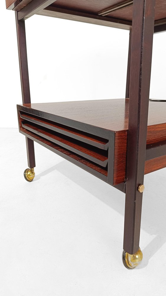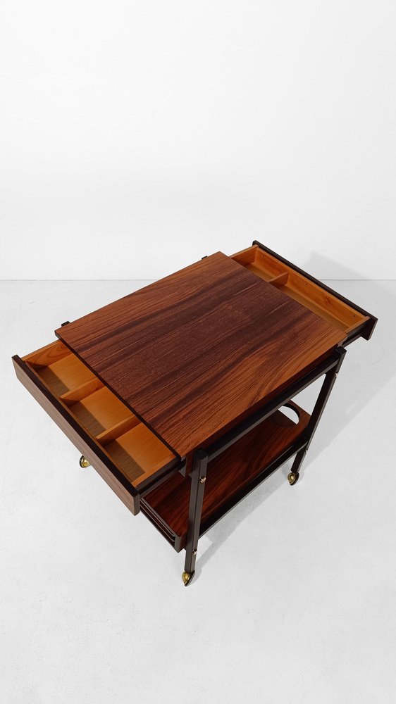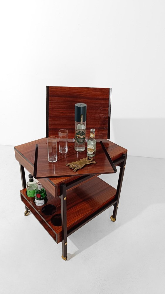 Mid Century Modern bar cart. Most likely made in Italy between the 60s and 70s, it is characterized by a rational and functionalist design that harks back to the Scandinavian design of the mid-20th century modern. The square and minimalist structure contains everything you could wish for in a service cart. Designed on two levels, it hides in the first shelf two large drawers for cutlery or napkins that are a masterpiece of carpentry. Both drawers are entirely made of solid oak with the "dovetail technique", equipped with comfortable dividers entirely, they have in the lower part of the comfortable handles engraved in the wood, with an aerodynamic shape. The second shelf is no less than the first, it has 4 comfortable circular spaces to hold your favorite bottles of spirits, and 2 large trays that can be removed from the opposite end of the top, to serve them with style and elegance at the table. Whether you want to use it as a clean-lined side table, a bar cabinet or a decorative stand, it can be used in various ways without ever stealing the scene from the objects it houses. A true daily companion, as discreet as it is elegant. This vintage bar cart has undergone a conservative restoration by a professional; thoroughly cleaned and polished with a specific product that enhances and preserves the precious rosewood veneer, it shows minimal signs of use and time.