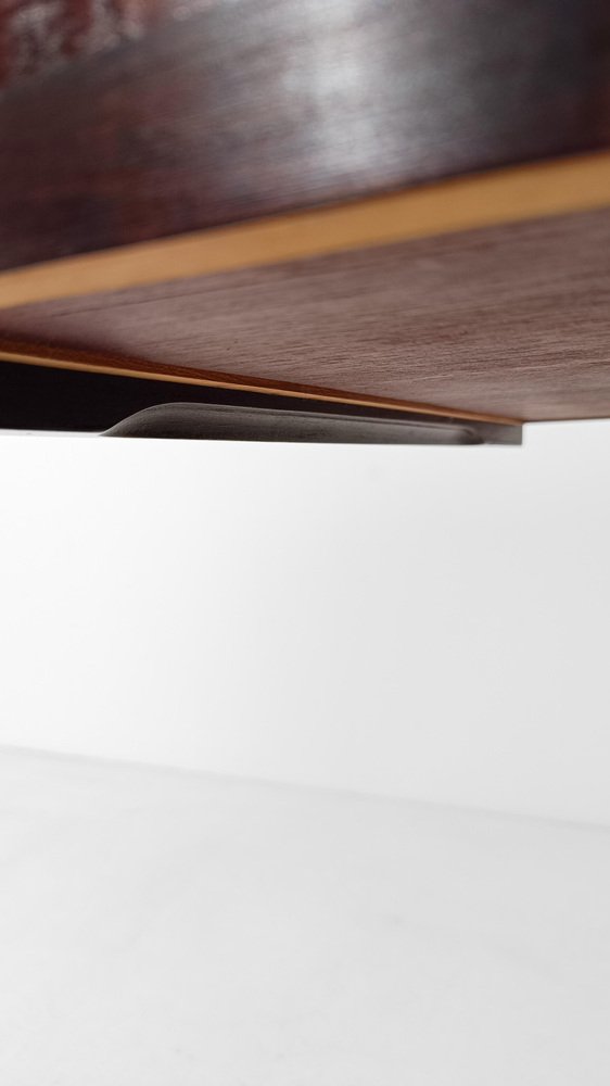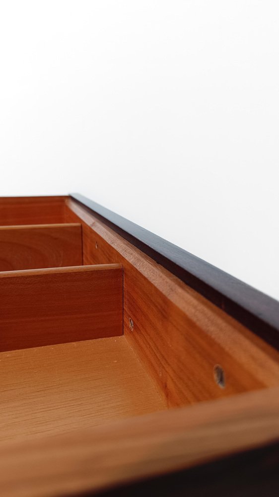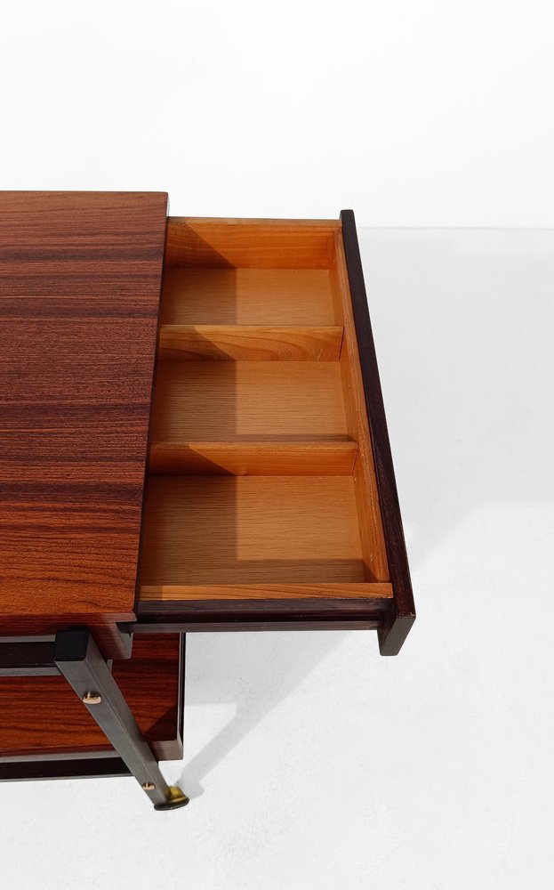 Mid Century Modern Barwagen. Er wurde wahrscheinlich zwischen den 60er und 70er Jahren in Italien hergestellt und zeichnet sich durch ein rationales und funktionales Design aus, das an das skandinavische Design der Mitte des 20. Jahrhunderts erinnert. Die quadratische und minimalistische Struktur enthält alles, was man sich von einem Servierwagen wünschen kann. Auf zwei Ebenen konzipiert, verbirgt er im ersten Fach zwei große Schubladen für Besteck oder Servietten, die ein Meisterwerk der Tischlerkunst sind. Beide Schubladen sind vollständig aus massiver Eiche mit der "Schwalbenschwanztechnik" gefertigt, mit komfortablen Trennwänden ausgestattet und haben im unteren Teil komfortable, in das Holz eingravierte Griffe mit einer aerodynamischen Form. Das zweite Regal steht dem ersten in nichts nach, es verfügt über 4 bequeme runde Ablagen für Ihre Lieblings-Spirituosenflaschen und 2 große Tabletts, die vom gegenüberliegenden Ende der Platte abgenommen werden können, um sie mit Stil und Eleganz am Tisch zu servieren. Ob als schlichter Beistelltisch, als Barschrank oder als dekorativer Ständer, er lässt sich vielseitig einsetzen, ohne dass er den Objekten, die er beherbergt, jemals die Schau stiehlt. Ein echter Alltagsbegleiter, ebenso diskret wie elegant. Dieser Vintage-Barwagen wurde von einem Fachmann konservativ restauriert; er wurde gründlich gereinigt und mit einem speziellen Produkt poliert, das das kostbare Palisanderfurnier aufwertet und bewahrt, und weist nur minimale Gebrauchs- und Zeitspuren auf.
