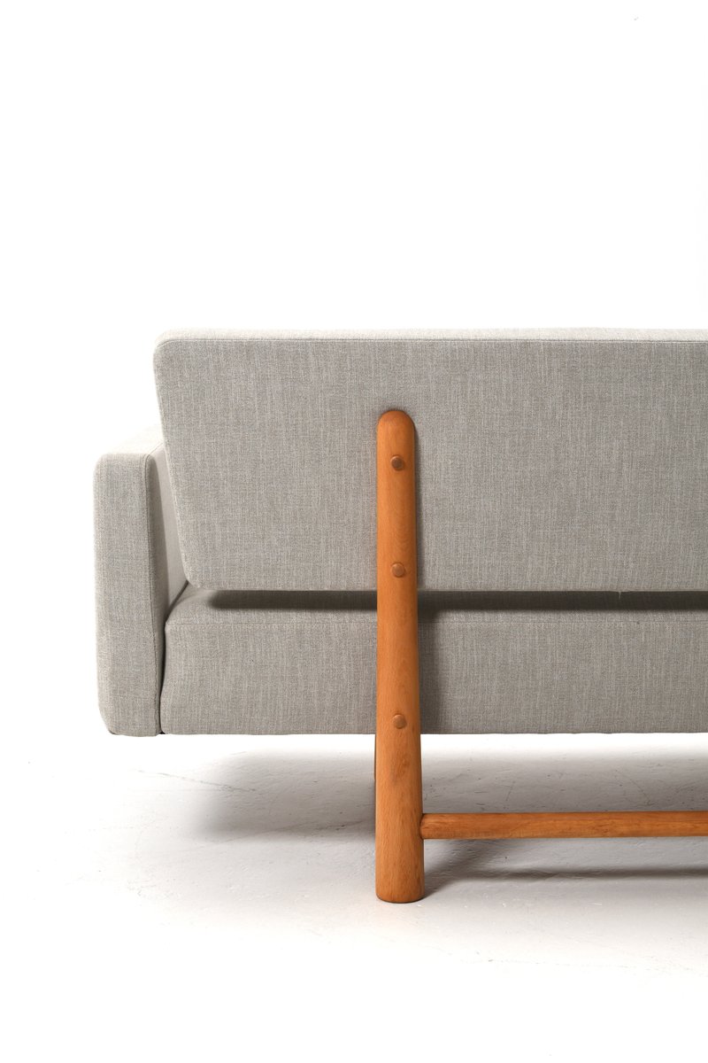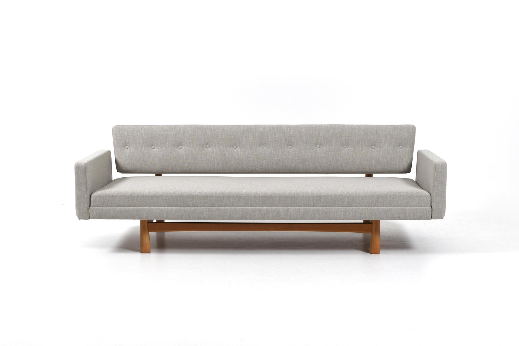 Newly upholstered in a high-performance flameproof fabric (100,000 Martindale), the sofa offers both luxurious comfort and durability. The light grey tone enhances the timeless design, while the button-tufted backrest and structured arms add a tailored look. Its clean lines, visible wood joinery, and floating profile make it a standout from every angle—ideal for placement in the center of a room.