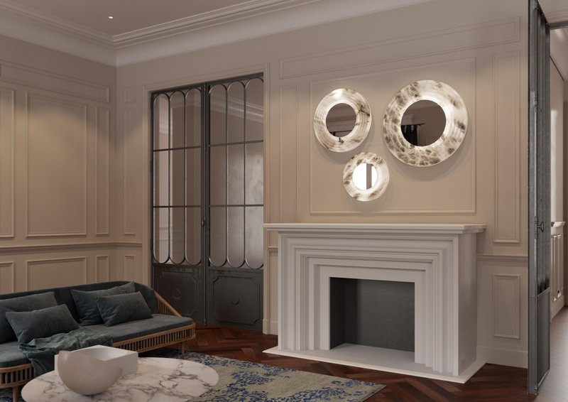 Mirror Disc XL Wall Lamp by United Alabaster Dimensions: ⌀ 80 x H 5,5 cm (Customizable Height) Materials: Alabaster, Copper (Matt Black finish) All our lamps can be wired according to each country. If sold to the USA it will be wired for the USA for instance. TRADITION IN ALABASTER SINCE 1969 United Alabaster, located in Sarral (1969), is one of the oldest companies in Spain in the alabaster sector . It is still a family business dedicated to meeting the needs of its clients. Thanks to its extensive staff, they can offer all their skills and knowledge to make exclusive design products . Our mission is to fuse this natural stone with contemporary elements while respecting the environment and innovating in their applications. The service offered and the confidentiality of the lighting projects and architecture along with the experience gained during all these years are the key to success. Among our products, you can find wall lights, lamps, panels, and table lamps. All of them made of first quality alabaster extracted from our quarries in La Puebla de Hijar (Teruel). Nowadays, this material surprises everybody in many interior spaces from around the world such as entrance halls, hotel rooms,restaurants,cruisers, churches or private residences, bringing warmth and harmony. During these years, United Alabaster has got a team of people committed to their work, providing value to a natural Stone and undertaking very demanding projects using state-of-the-art machinery. Everything unimaginable is achieved in a white, calm and relaxing environment. The stone volumes take all the lead of the ambience where the technical staff study and develope the best creative proposal. THE STONE The origins, Gelsa (Zaragoza) First quality alabaster extracted from the quarries in La Puebla de Hijar and Gelsa. Born from an original vein in the quarry and molded in their workshop. THE PROCESS High quality alabaster handcraft. United Alabaster are craftsmen since 1969. They have been producing more than 2000 hand-made lamps for the whole world. DESIGN LAB The manufacture of an alabaster lamp. United Alabaster process of manufacture is guaranteed due to the high technology of the state-of-the-art machinery used to develop any design, no matter how complex.