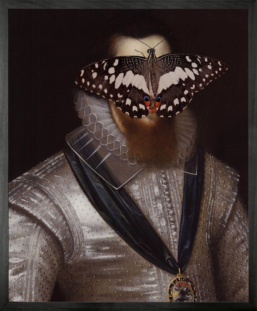 Mittelgroßes Portrait von Butterfly on Man in Schwarz & Weiß von Mineheart