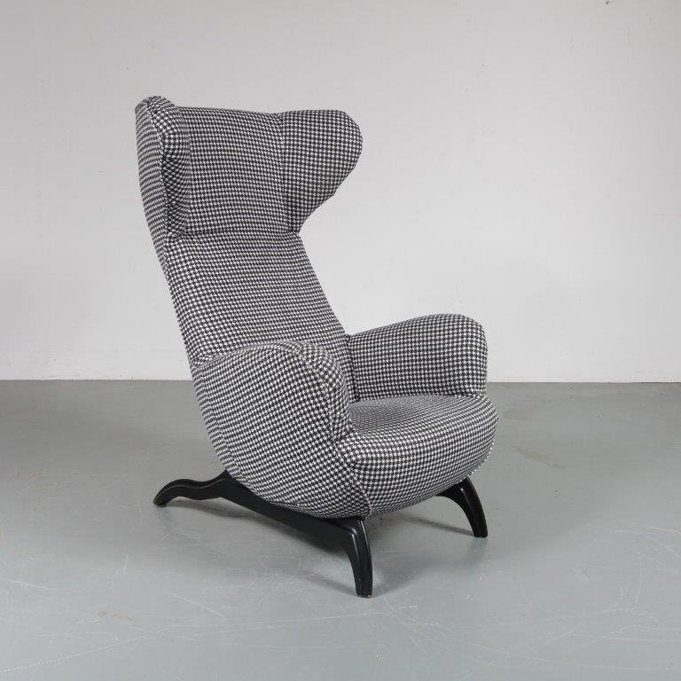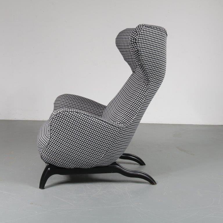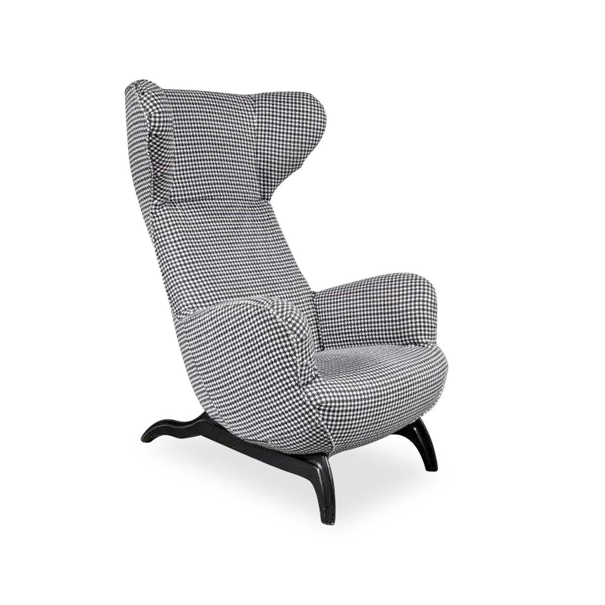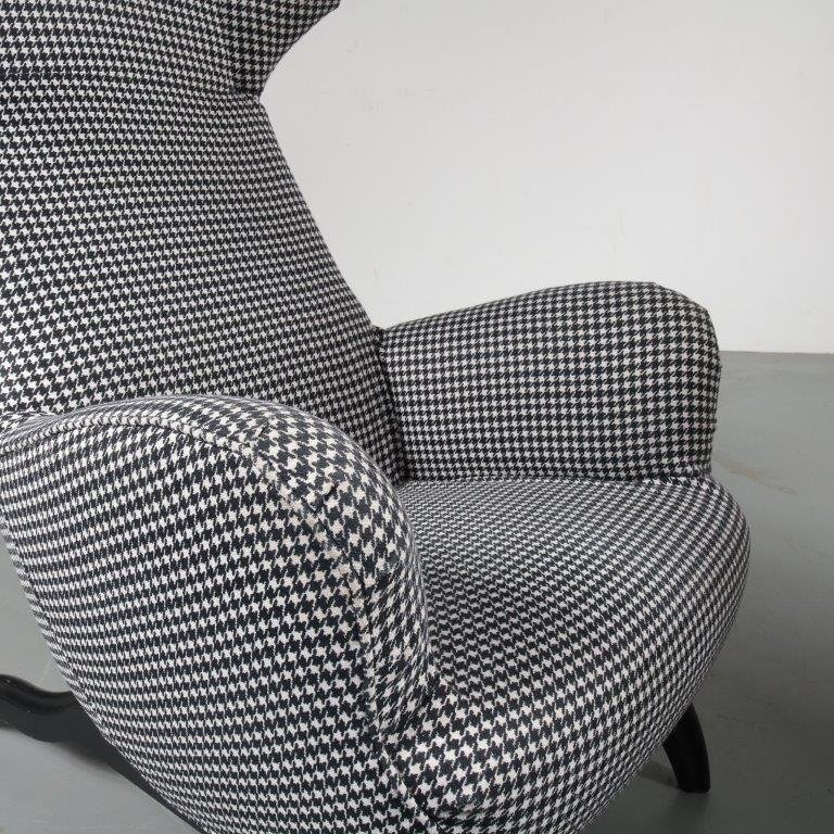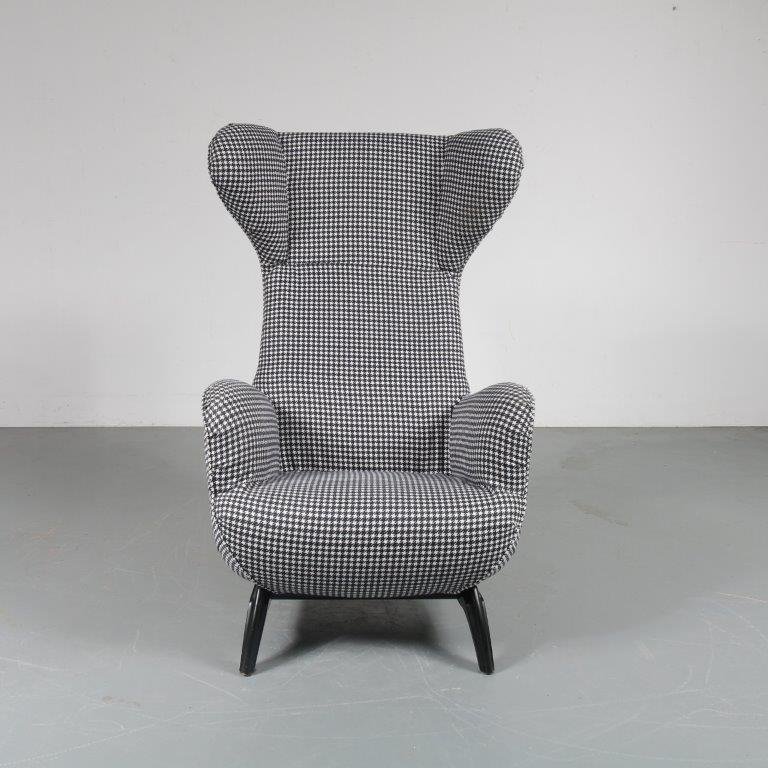 A beautiful highback lounge chair, model “Ardea”, designed by Carlo Mollino in 1950 and manufactured by Zanotta in Italy around 1980. This eye-catching chair has a fantastic dog tooth pattern fabric in black and white, which greatly contributes to the eye-catching style of the piece. The black wooden base combines very nicely with the upholstery. The back of the base is lower than the front and have an elegant, curved shape. It has a low seat and high backrest, creating a wonderful seating experience. Together with the armrests this makes this appealing chair very fitting for comfortable lounging and a great addition to the living room. It’s an iconic piece of mid-century Italian design of which the designer clearly had an excellent eye for detail. It remains in very good vintage condition with minor wear consistent with age and use, preserving a beautiful patina. This is a 1980s production.
