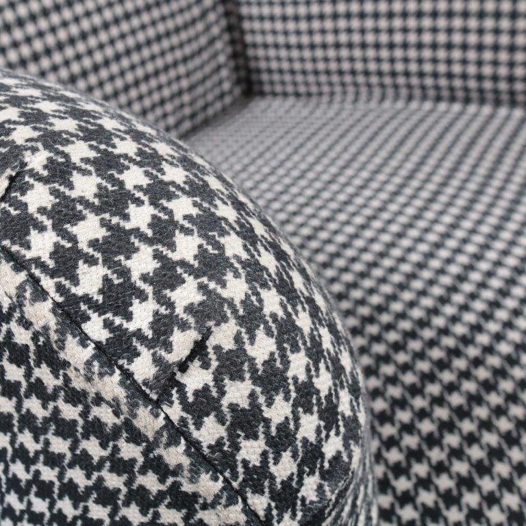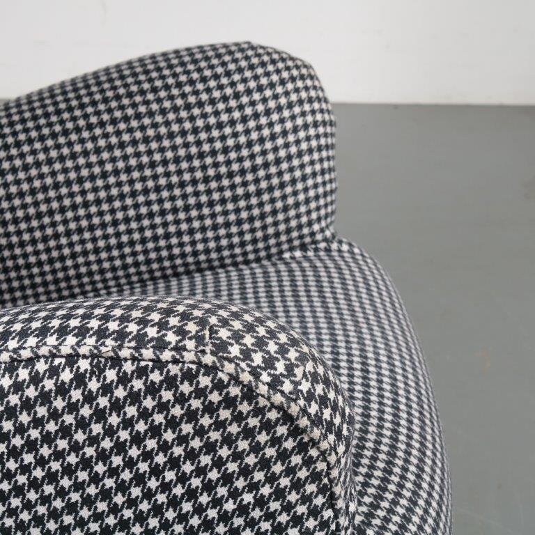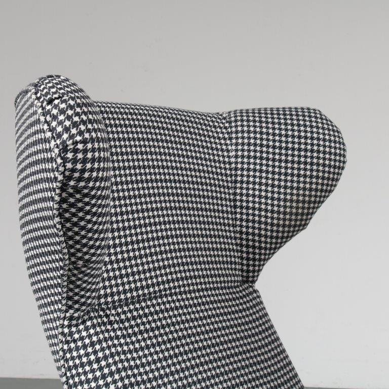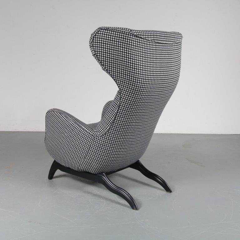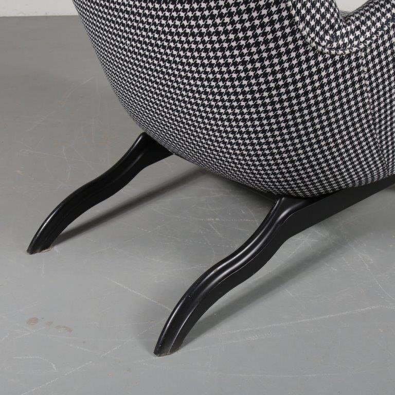 A beautiful highback lounge chair, model “Ardea”, designed by Carlo Mollino in 1950 and manufactured by Zanotta in Italy around 1980. This eye-catching chair has a fantastic dog tooth pattern fabric in black and white, which greatly contributes to the eye-catching style of the piece. The black wooden base combines very nicely with the upholstery. The back of the base is lower than the front and have an elegant, curved shape. It has a low seat and high backrest, creating a wonderful seating experience. Together with the armrests this makes this appealing chair very fitting for comfortable lounging and a great addition to the living room. It’s an iconic piece of mid-century Italian design of which the designer clearly had an excellent eye for detail. It remains in very good vintage condition with minor wear consistent with age and use, preserving a beautiful patina. This is a 1980s production.